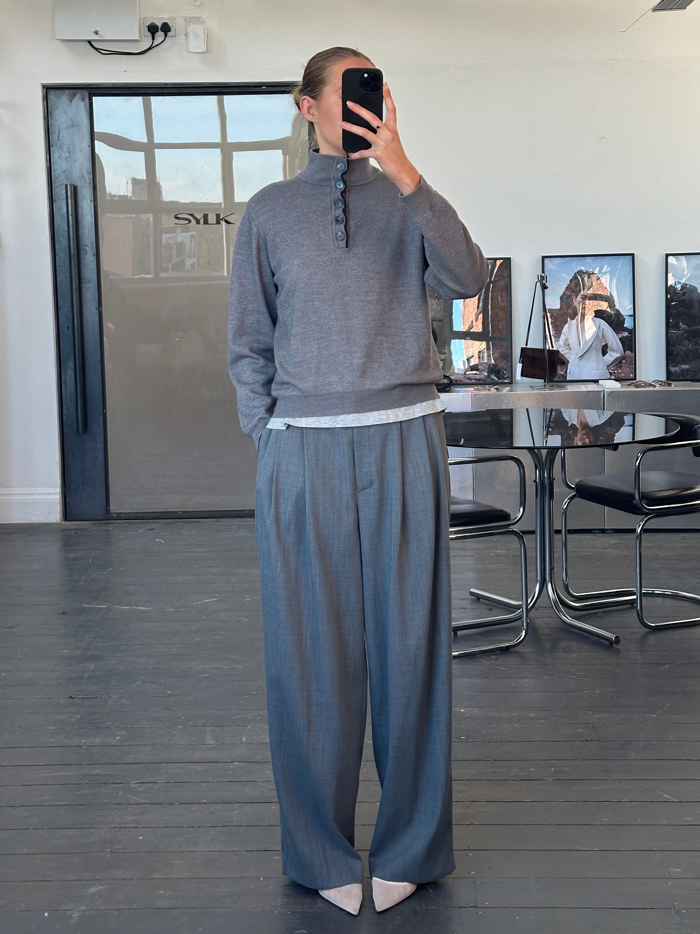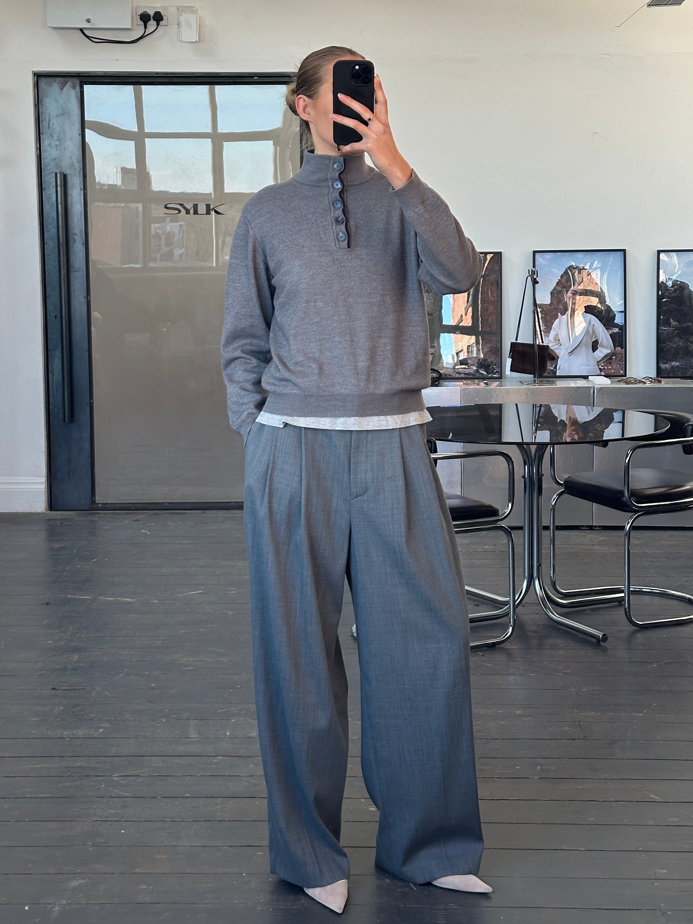 A grey 2000s Armani Jeans knit featuring a minimal button-neck detail and subtle navy trim. Clean and contemporary with a soft quiet-luxury feel.
