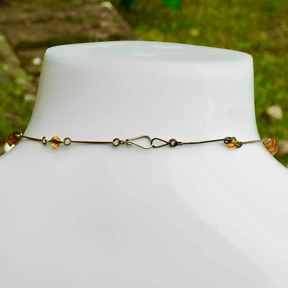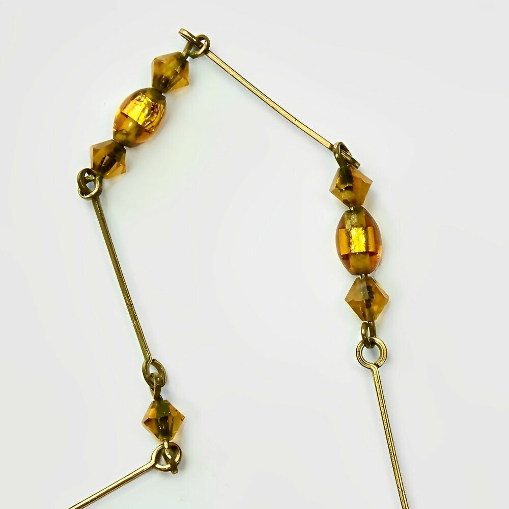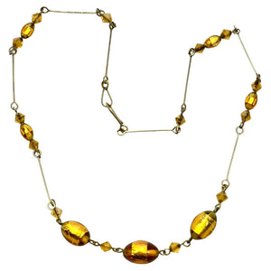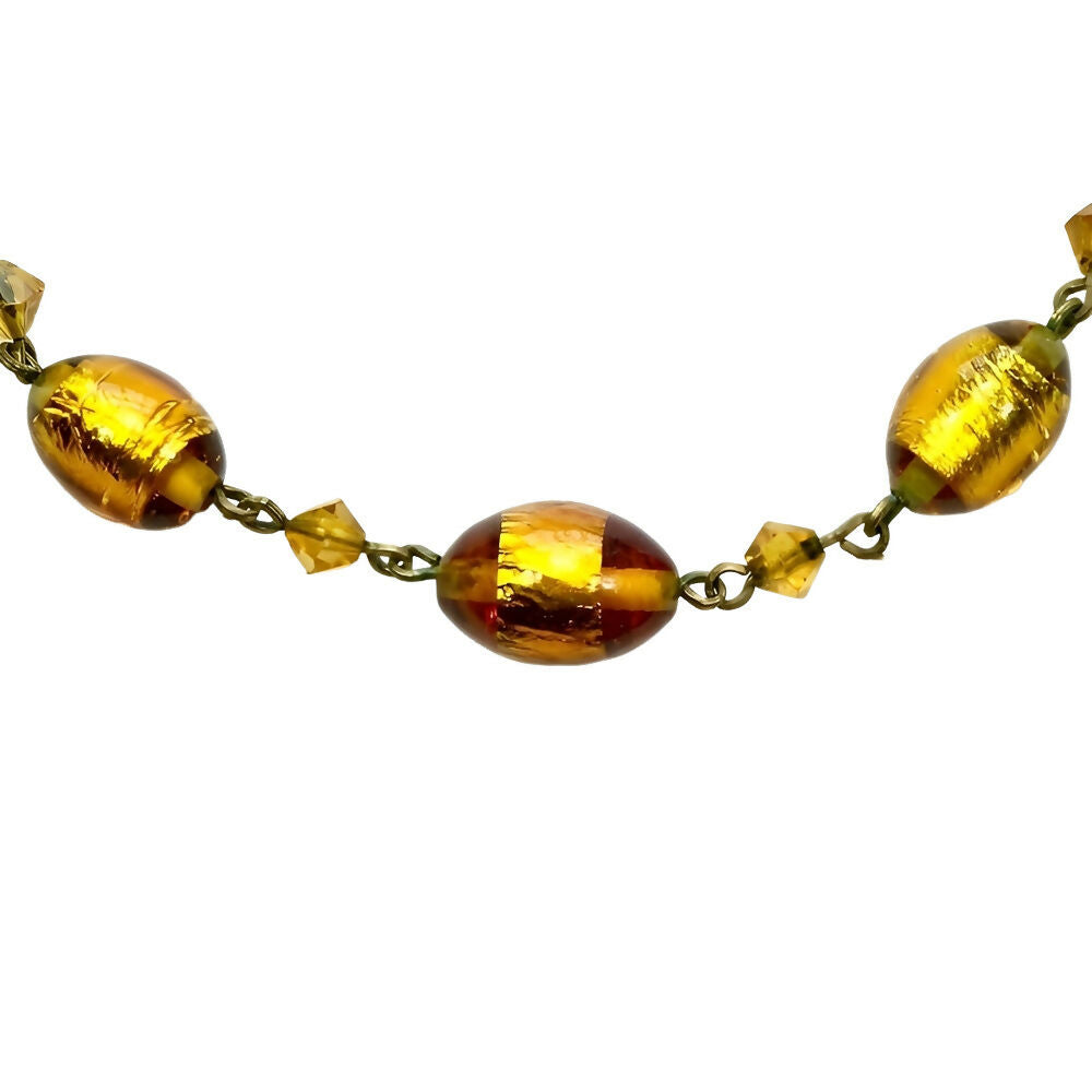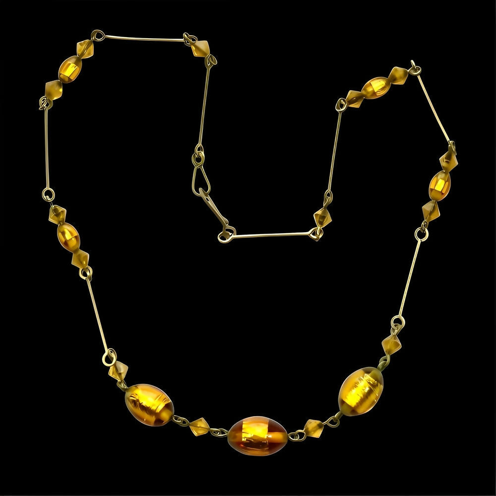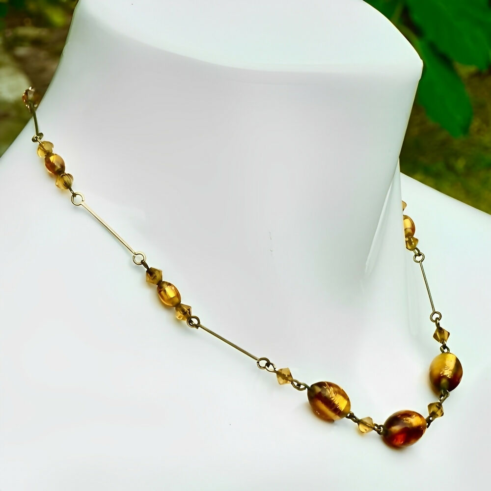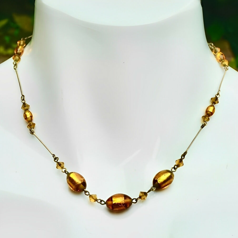 Beautiful Art Deco gold tone wire necklace, featuring oval golden foil glass beads, with gold glass bead accents.