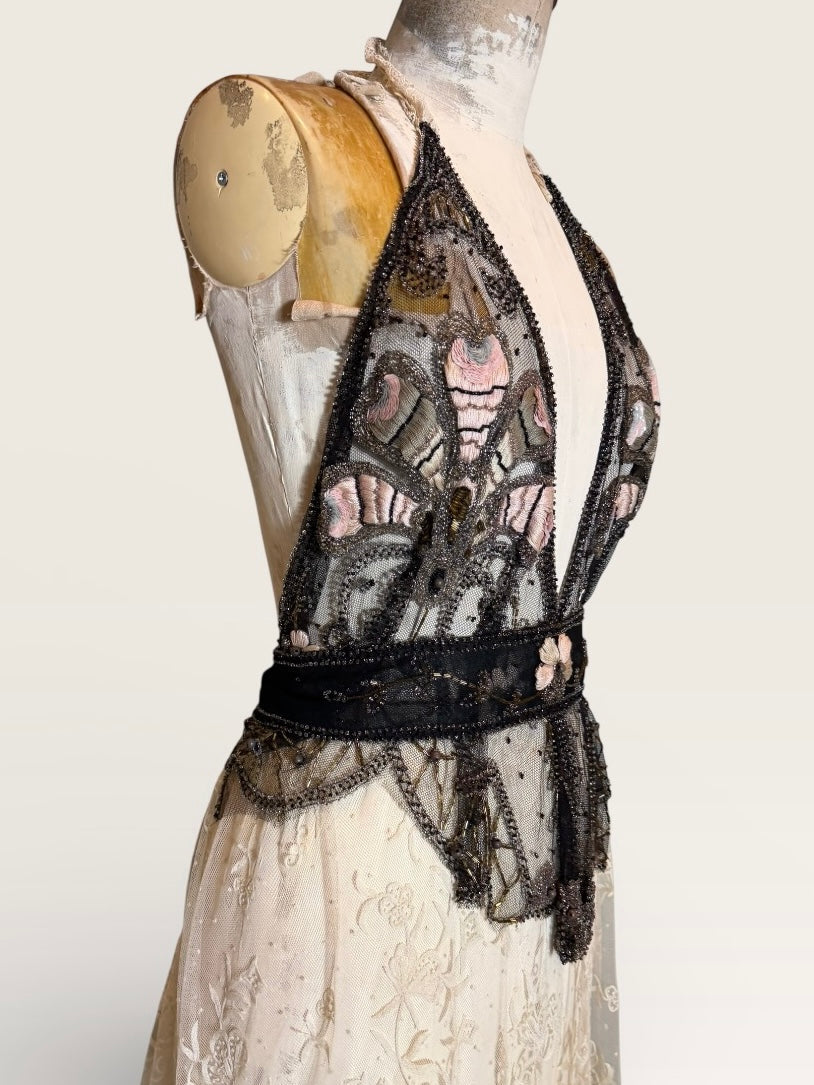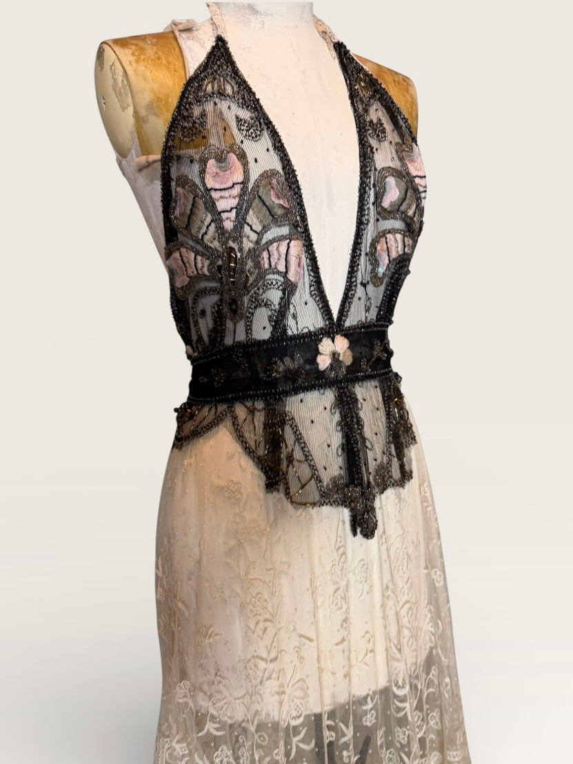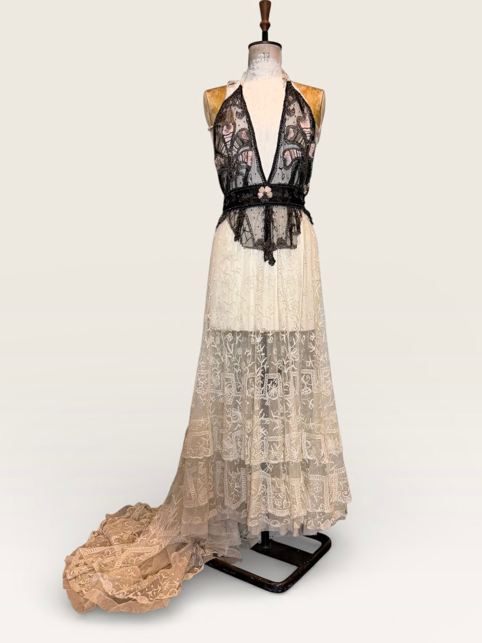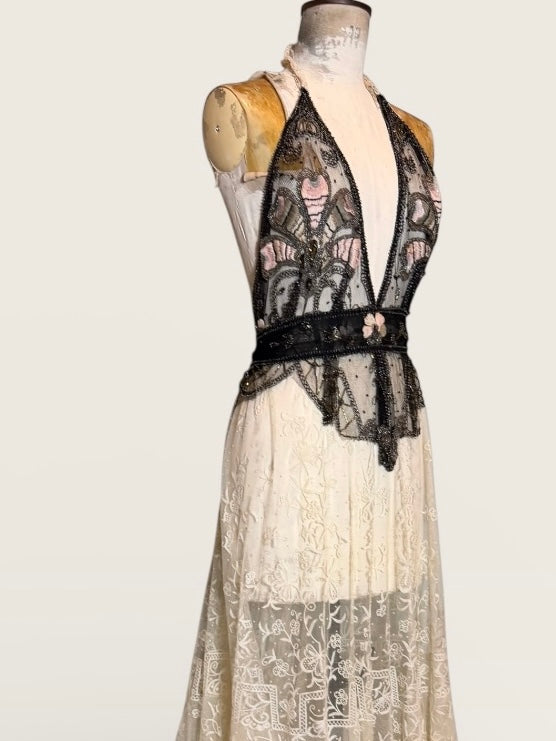 Embodying the grace of a bygone eras, this exquisite garment intertwines an authentic hand made Victorian lace skirt in a delicate cream hue with a stunning 20s beaded halterneck top. The intricate floral designs and meticulous black beading evoke an artistic elegance, while the adjustable necktie ensures a flawless silhouette. Has back hooks for a neat fit. A true one of a kind heirloom.