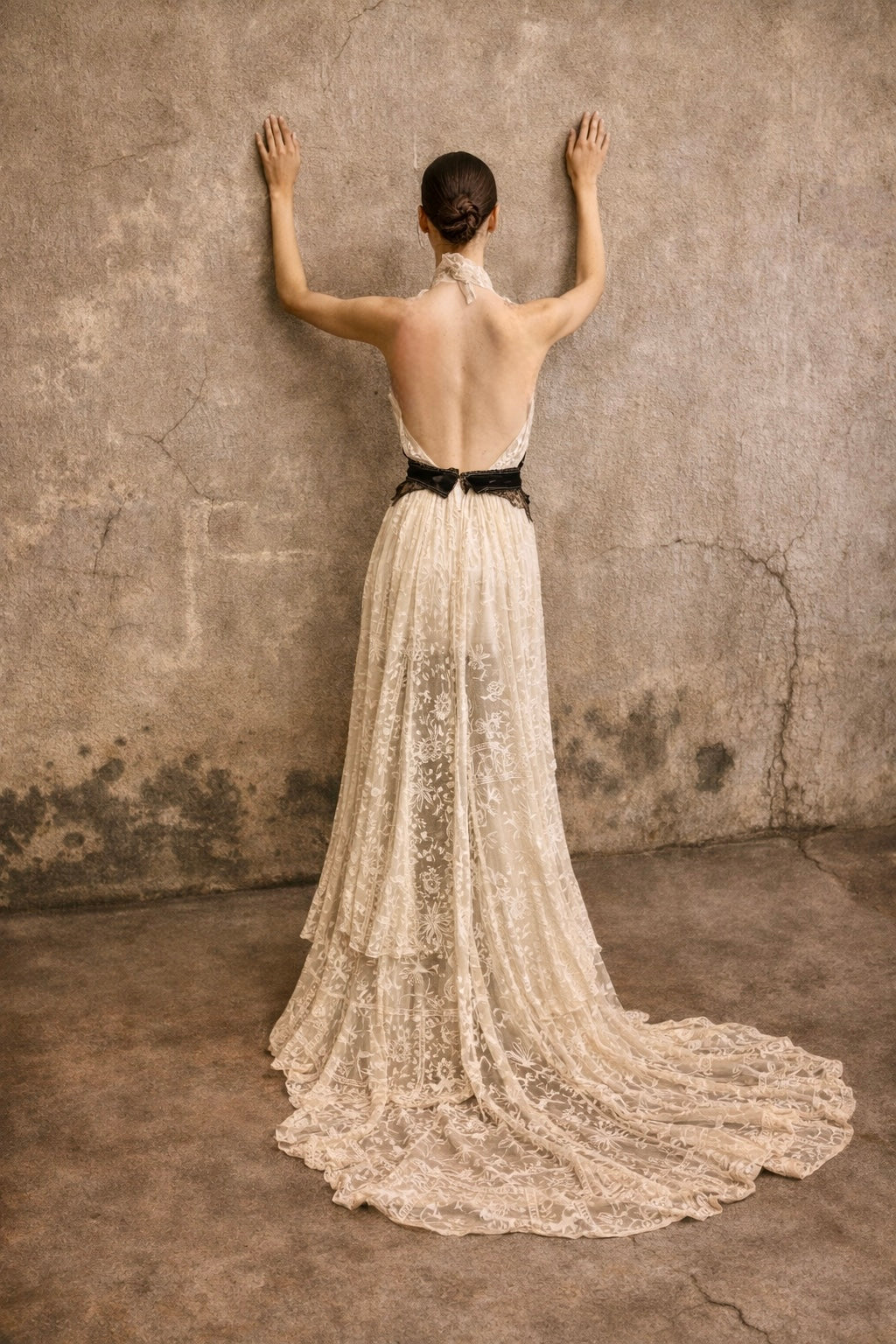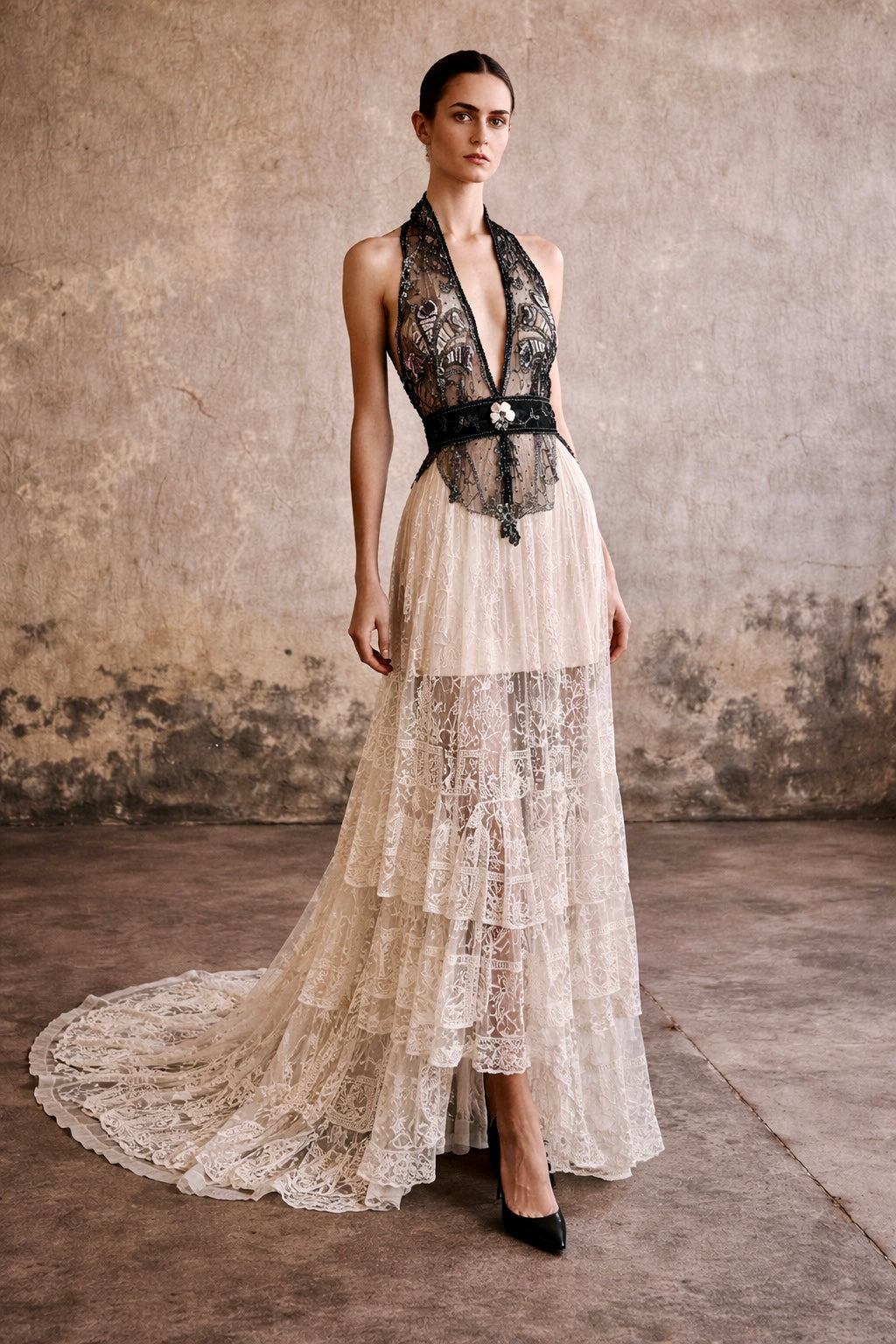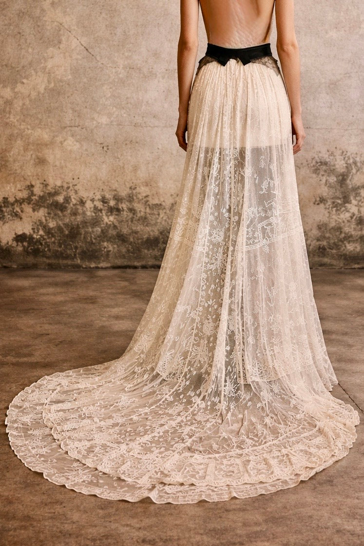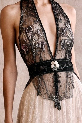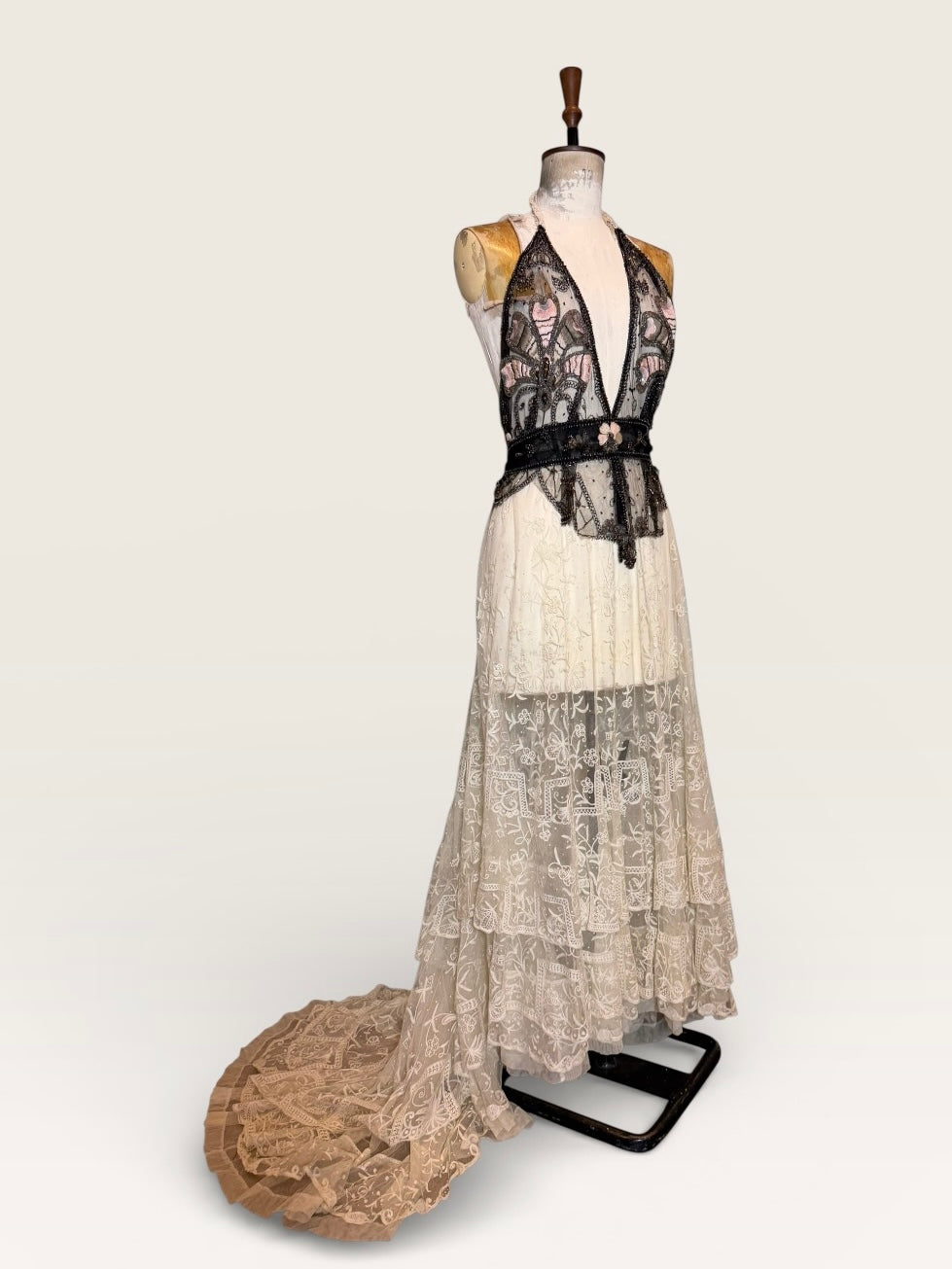Embodying the grace of a bygone eras, this exquisite garment intertwines an authentic hand made Victorian lace skirt in a delicate cream hue with a stunning 20s beaded halterneck top. The intricate floral designs and meticulous black beading evoke an artistic elegance, while the adjustable necktie ensures a flawless silhouette. Has back hooks for a neat fit. A true one of a kind heirloom.