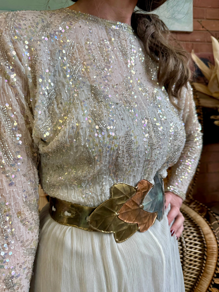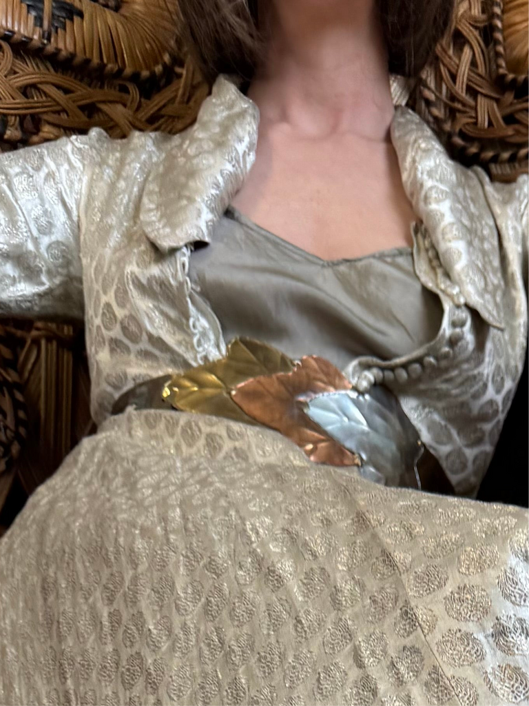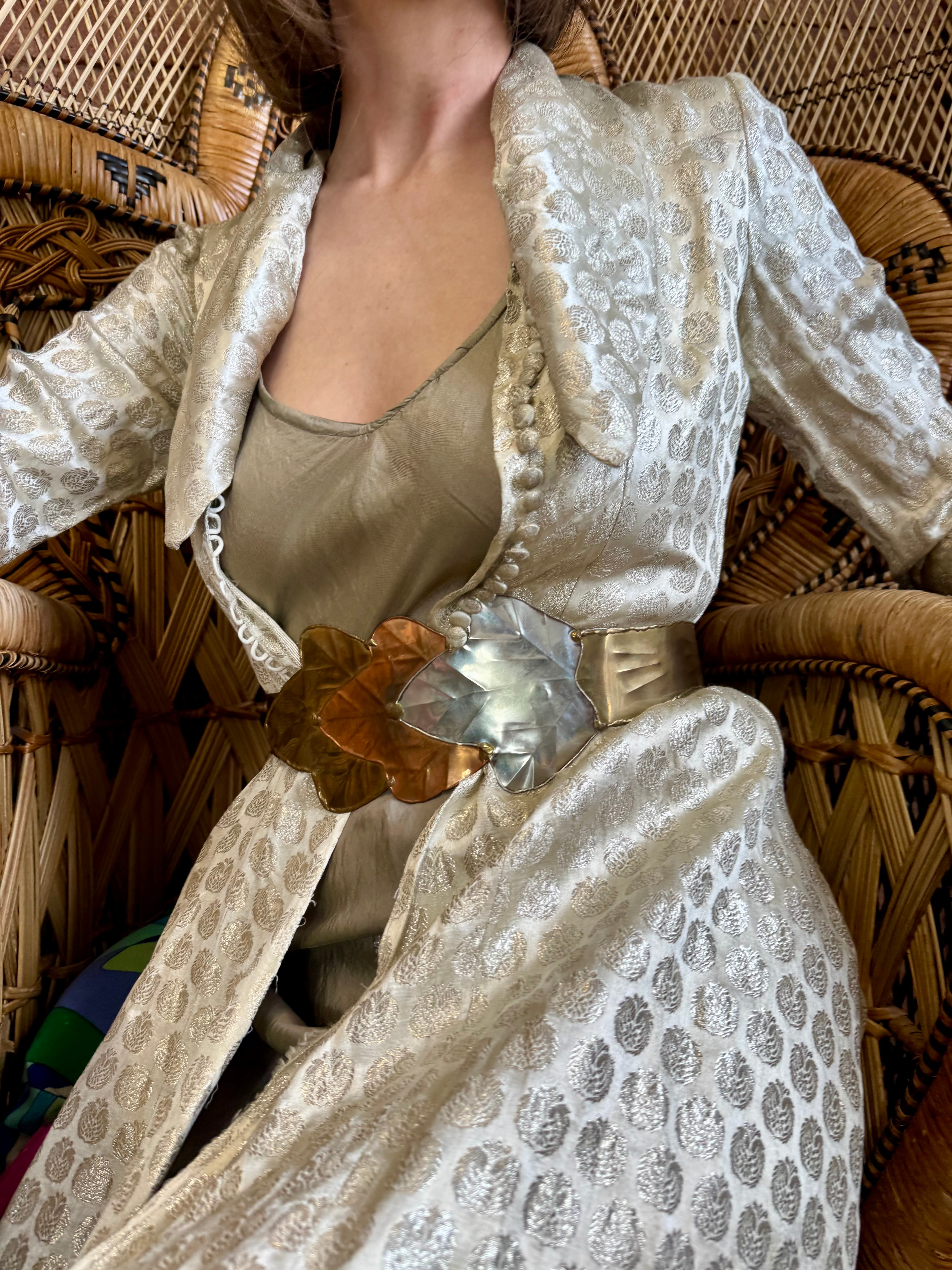 Introducing Bailey, the stunning Brutalist 70s leaf metal belt. Crafted with three large leaves in brass, rose metal, and silver, this belt will add a touch of vintage charm to any outfit. Its adjustable settings make it a versatile accessory that can be worn with any style.