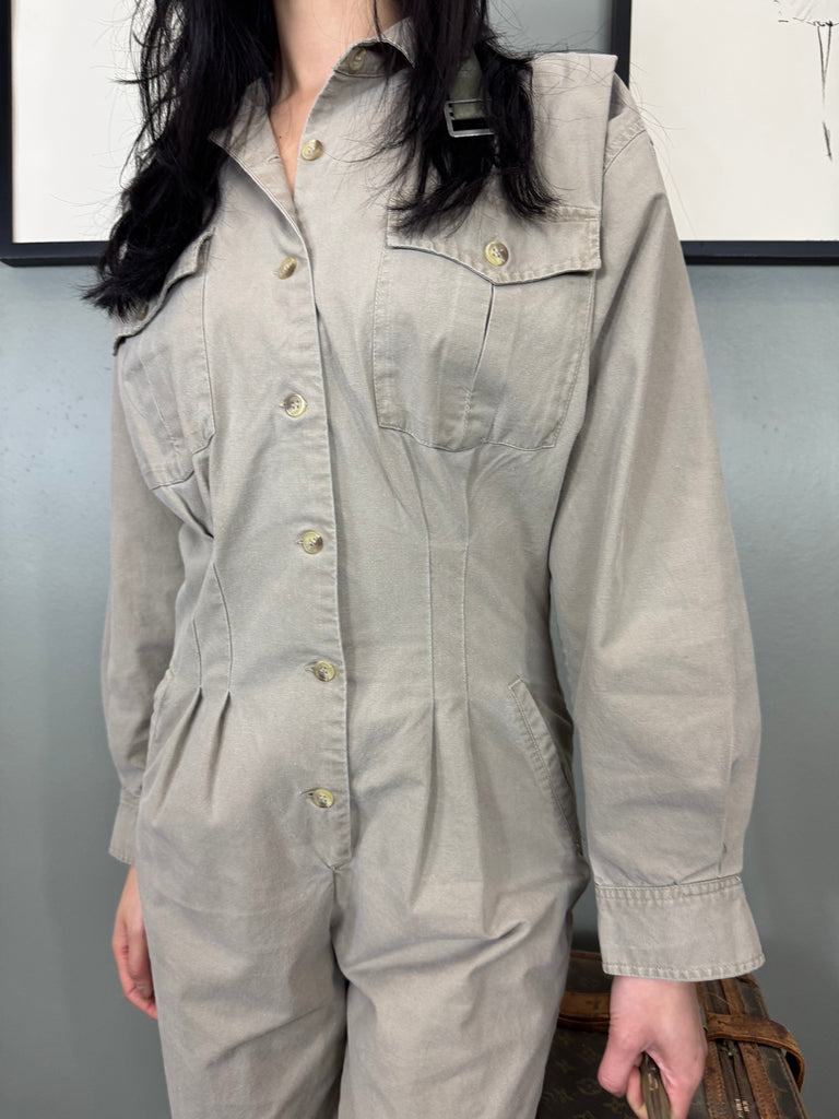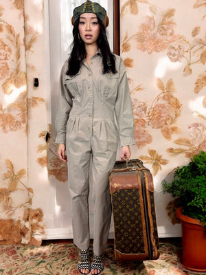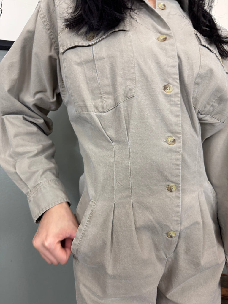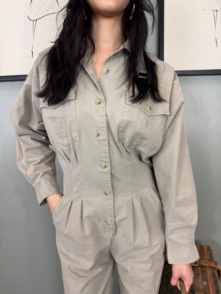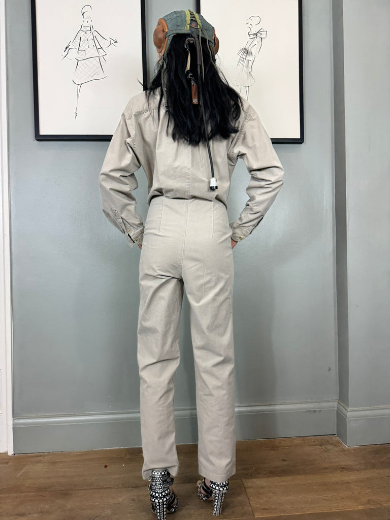 Expertly crafted with a tailored waist and long sleeves, the Carinne 70s cotton jumpsuit is a fabulous addition to any wardrobe. Complete with front and side pockets, this jumpsuit offers both style and practicality. Perfect for adding a touch of vintage charm to any outfit.