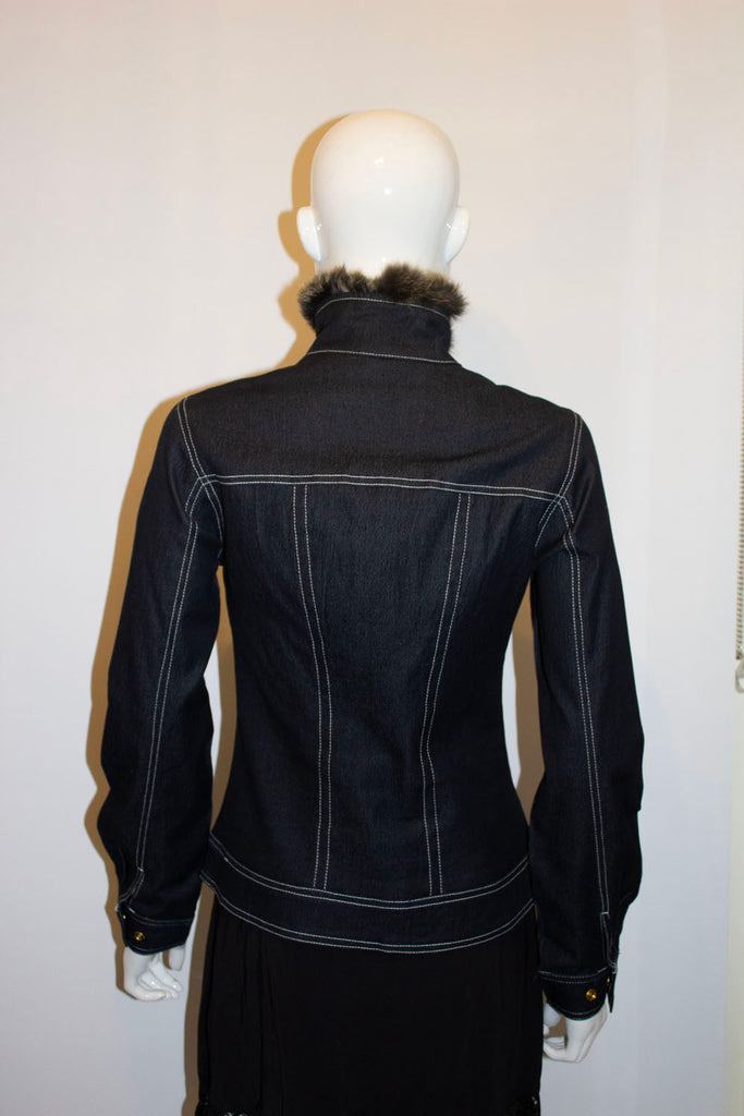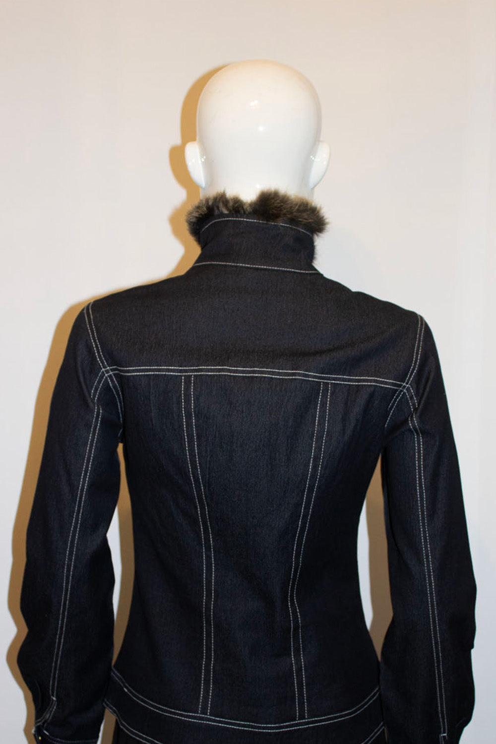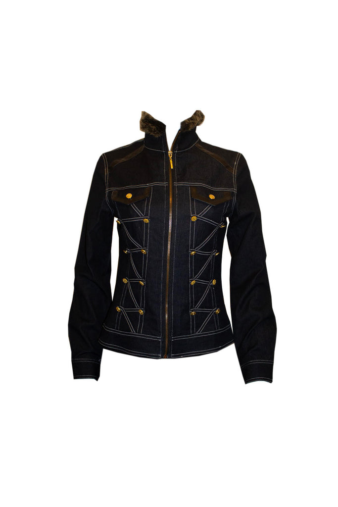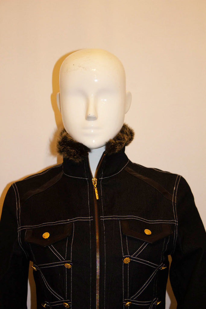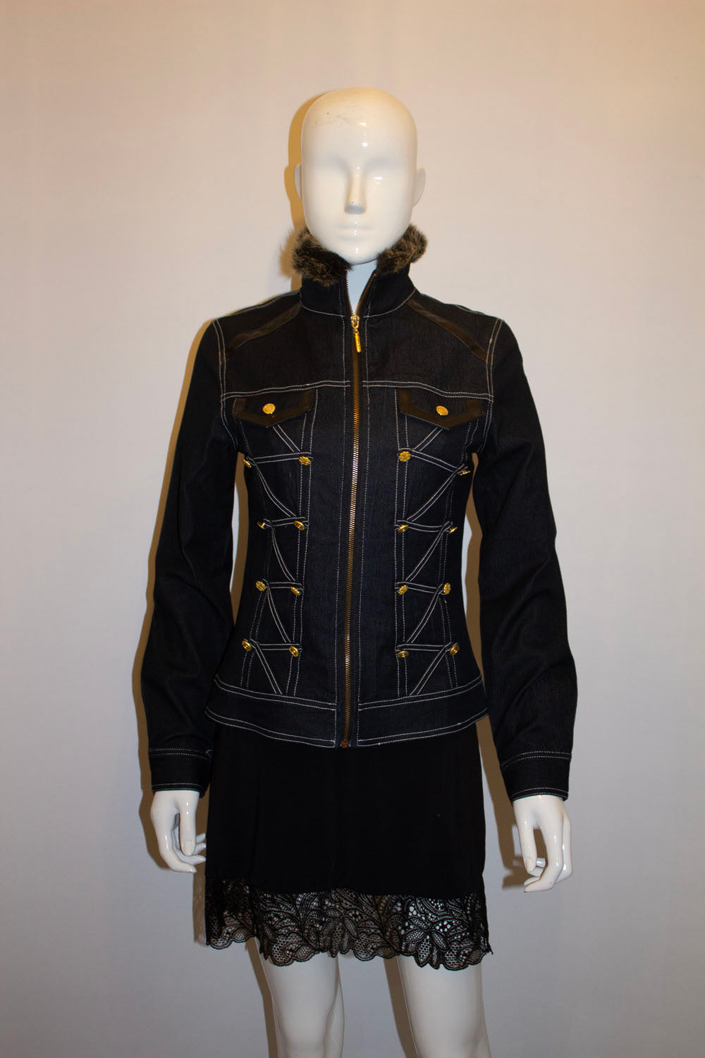 A great jacket for Spring by Cavalli, Just Cavalli line. The jacket is in a blue cotton with faux fur trim. It has a zip front opening, and decoration stitch detail. It has an inner zip pocket and popper cuffs.