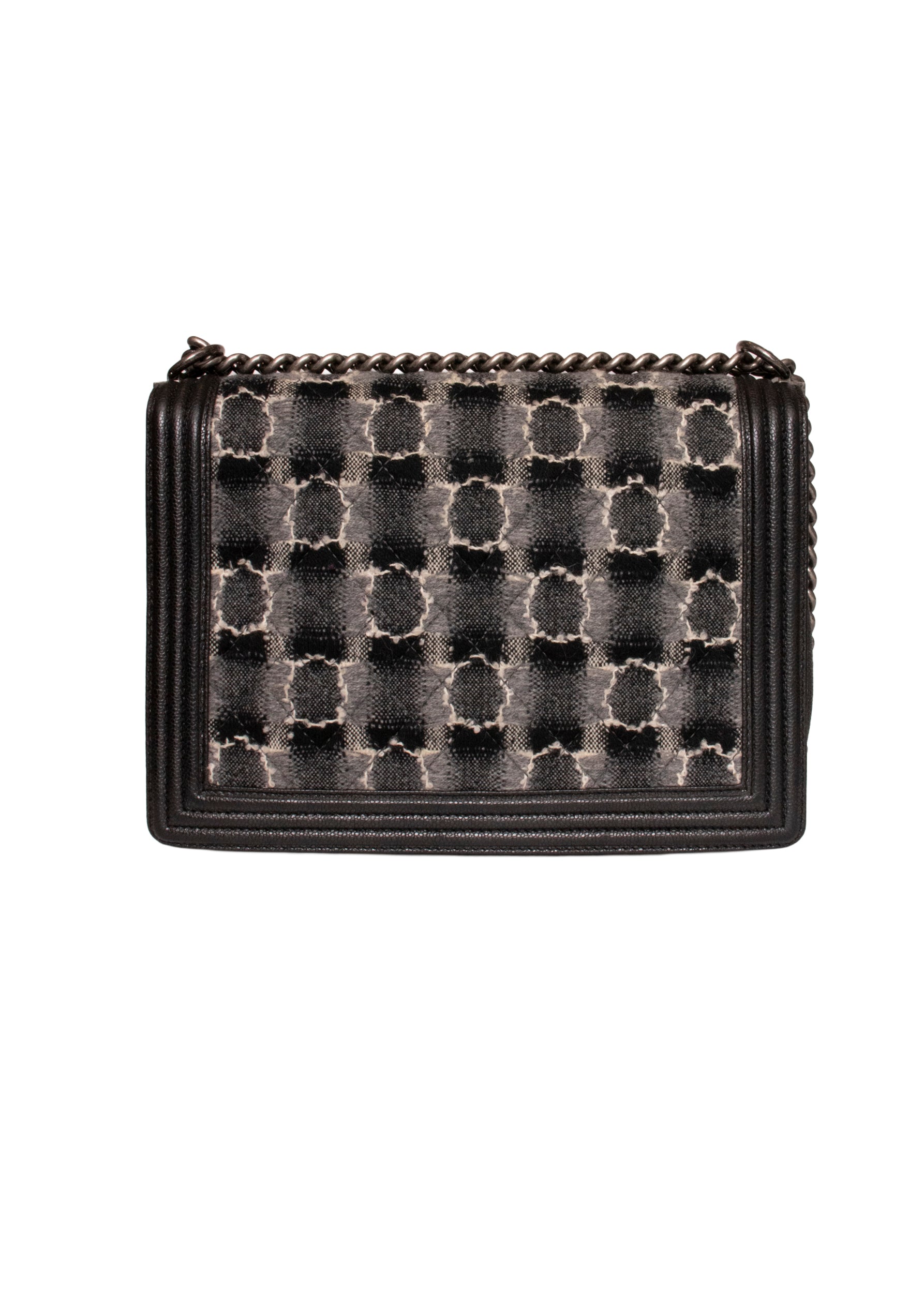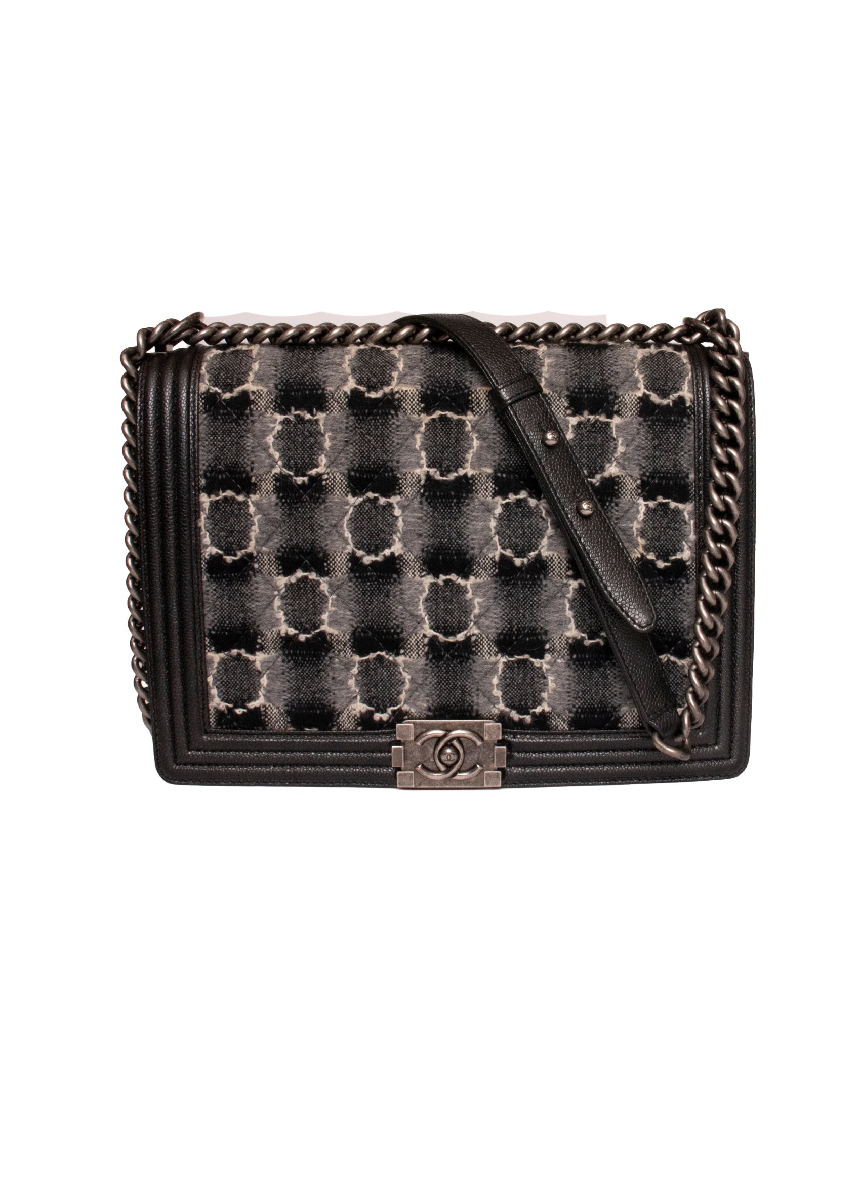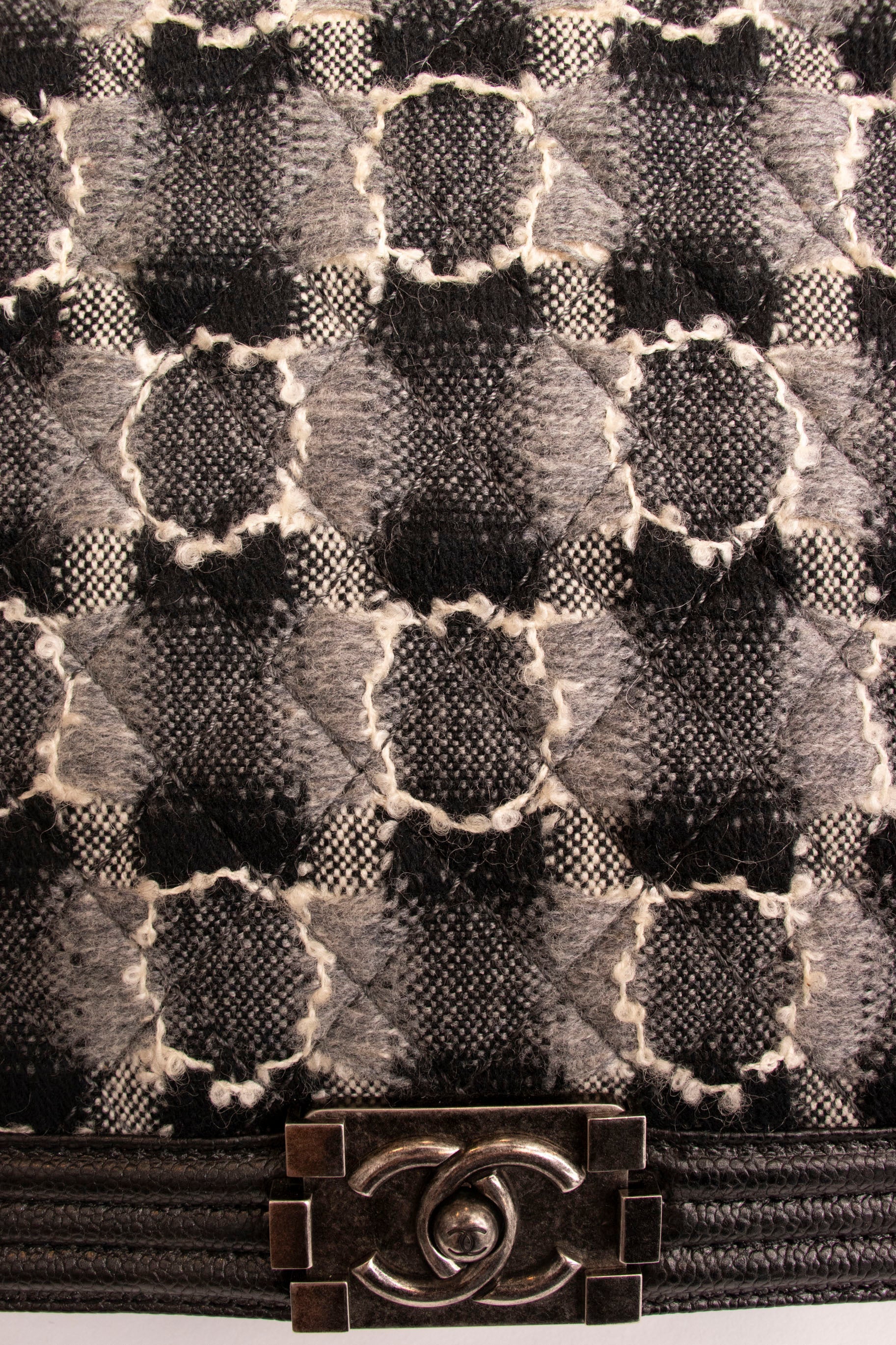 This 2018 Chanel Check Boy 25 Coco Mark Chain Bag is a standout piece that elevates the beloved Boy silhouette with contemporary flair. The striking pattern of black, gray, and white wool checks combined with pristine caviar leather creates a richness that sets it apart from traditional leather designs. Measuring 25cm across, this versatile medium size transitions effortlessly from shoulder to crossbody wear. The iconic Coco Mark closure and signature chain strap anchor this design in Chanel heritage while the textured patchwork brings a modern edge. In essence, it's a statement bag known for its unique fabric combination and enduring style, embodying the spirit of Coco Chanel's design heritage.