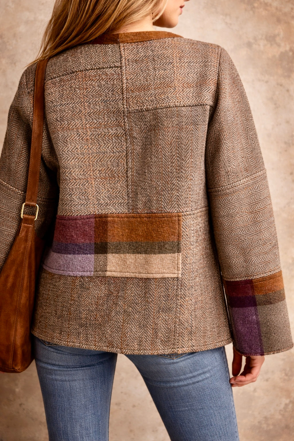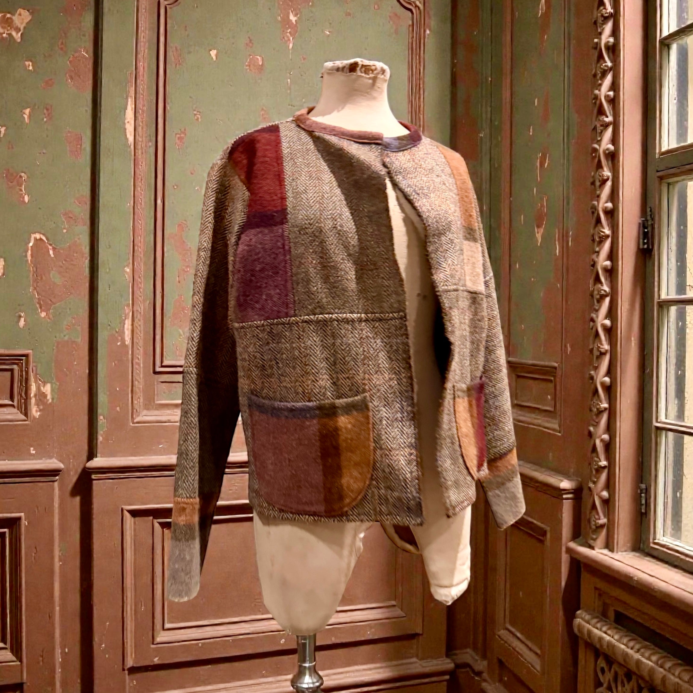 Expertly crafted and one-of-a-kind, this Irish wool patchwork jacket is a timeless classic. Reworked from 70s Irish wool blankets, this jacket boasts a round neckline, long sleeves, and side pockets. Versatile and unlined, it adds a unique touch to any outfit, especially when paired with denim or a simple dress.