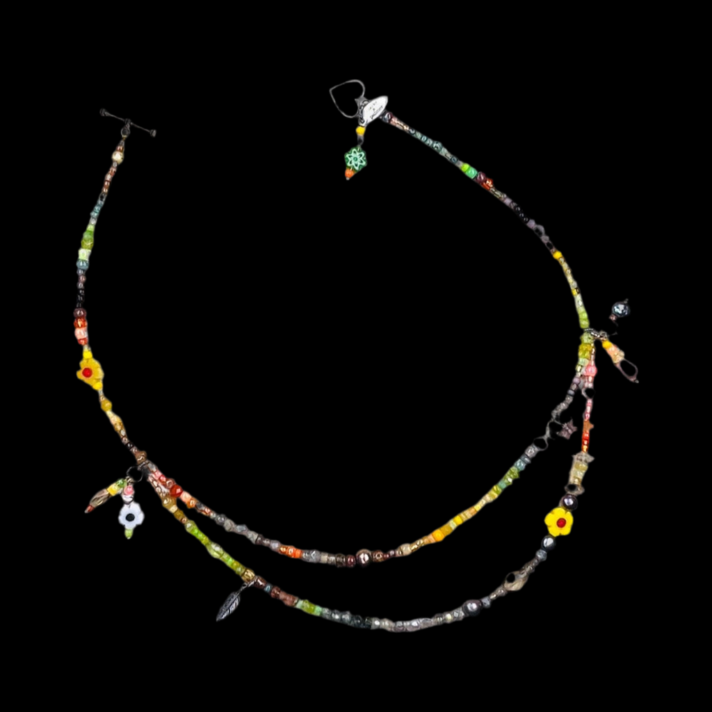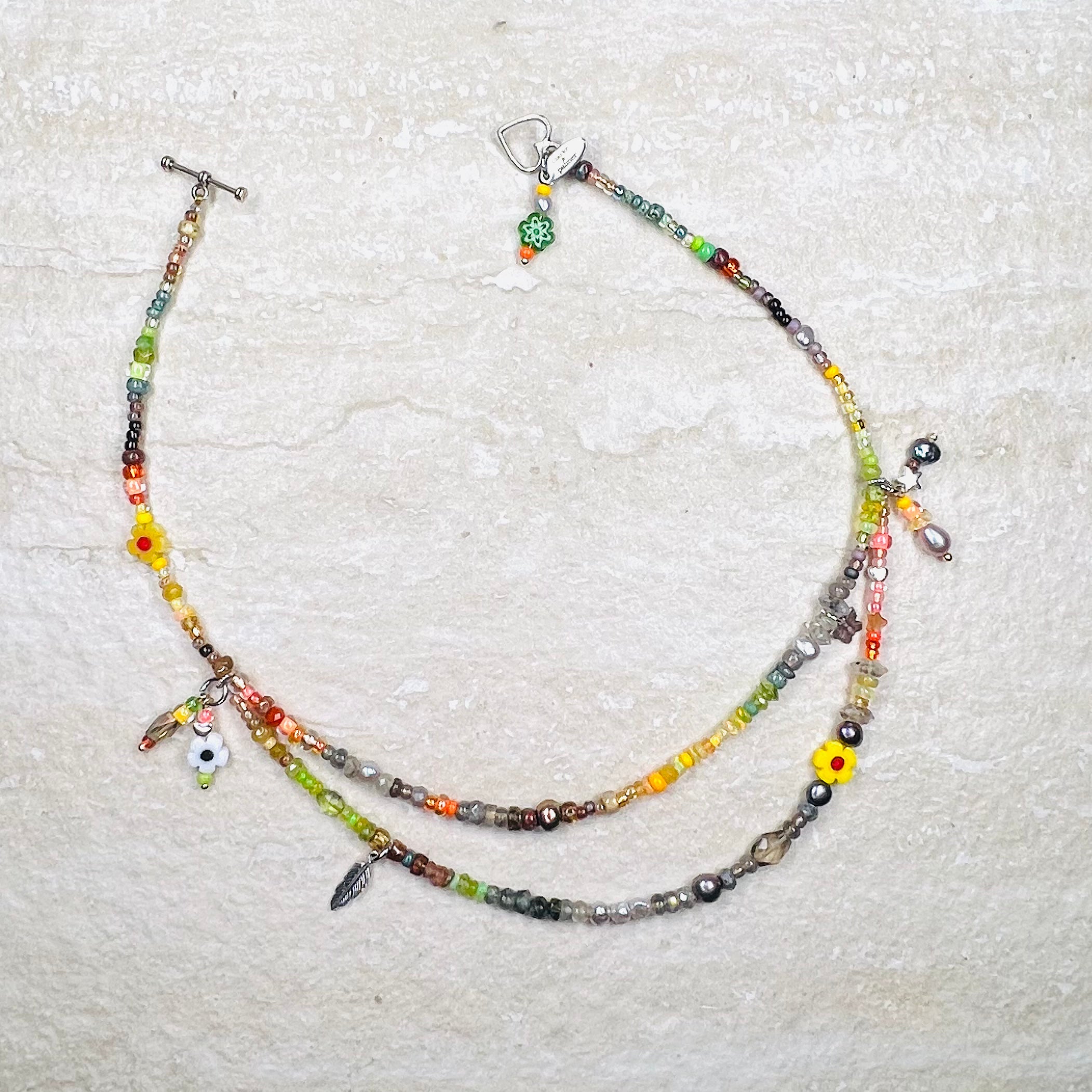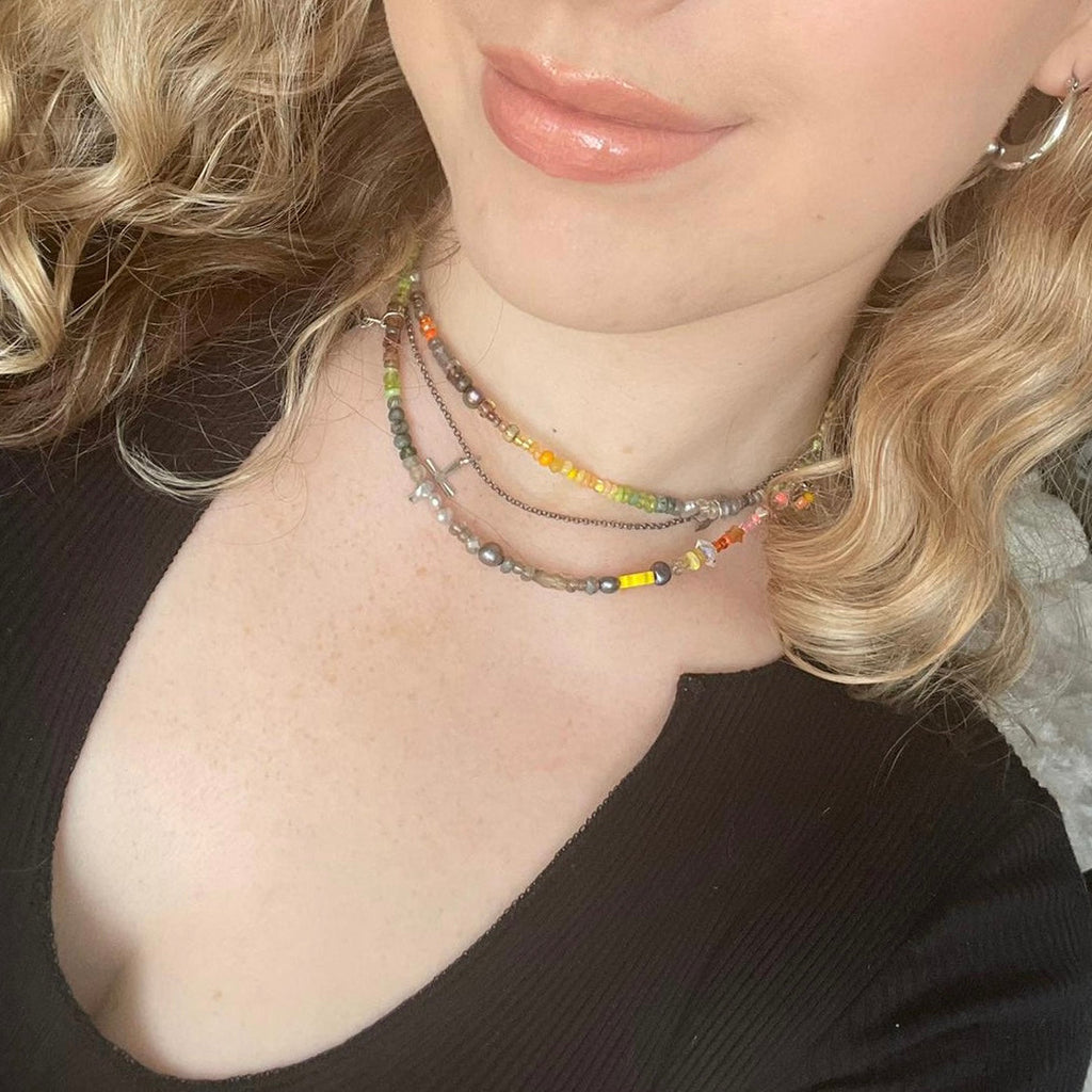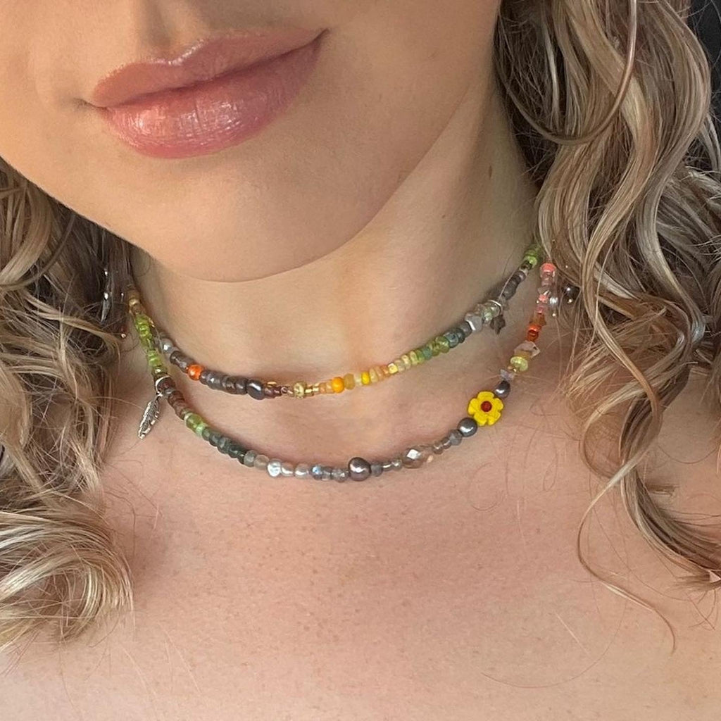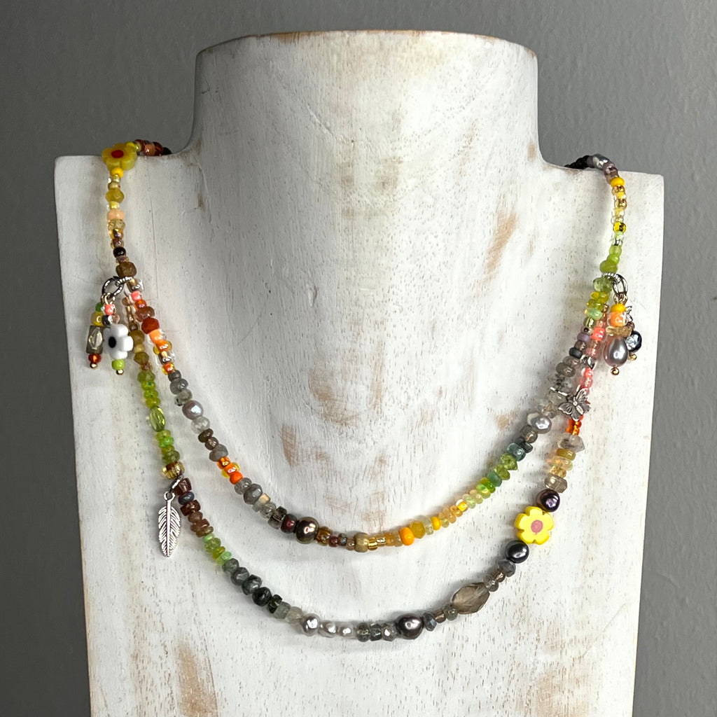 Part of our Neon Fantasy Collection, this beautiful necklace is handmade from citrus and camo shades of Picasso glass Preciosa and Miyuki beads blended with semi precious stones including sustainably sourced citrine, Ethiopian opal, pearls, peridot, tourmaline, moonstone, labradorite, herkimer diamond, moss aquamarine, smoky quartz and emerald. With pearl, daisy handmade and totally unique charms, this is a luxury version of our Dolly Mixture range.  You can choose between a gold or silver vermeil toggle clasp.