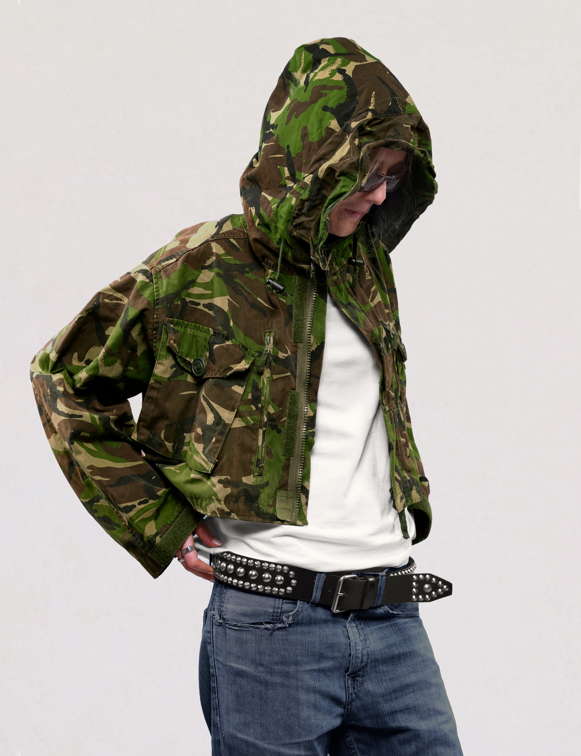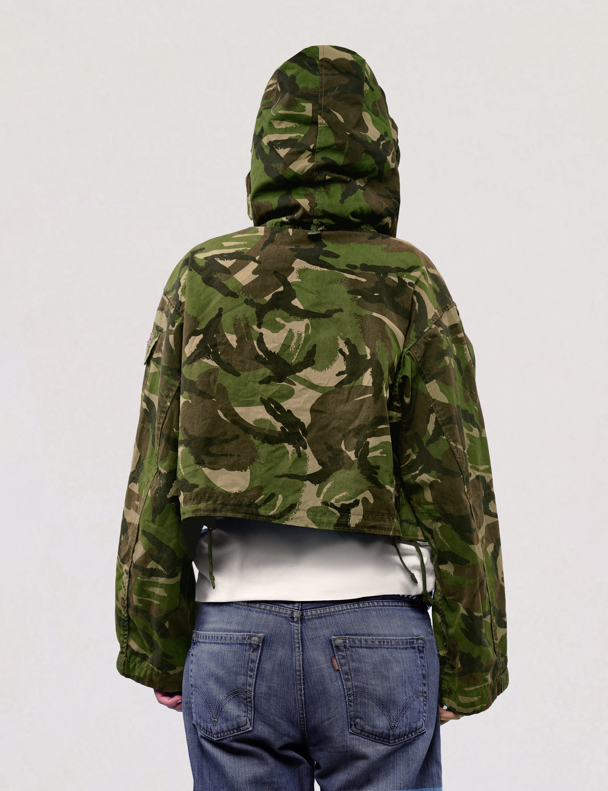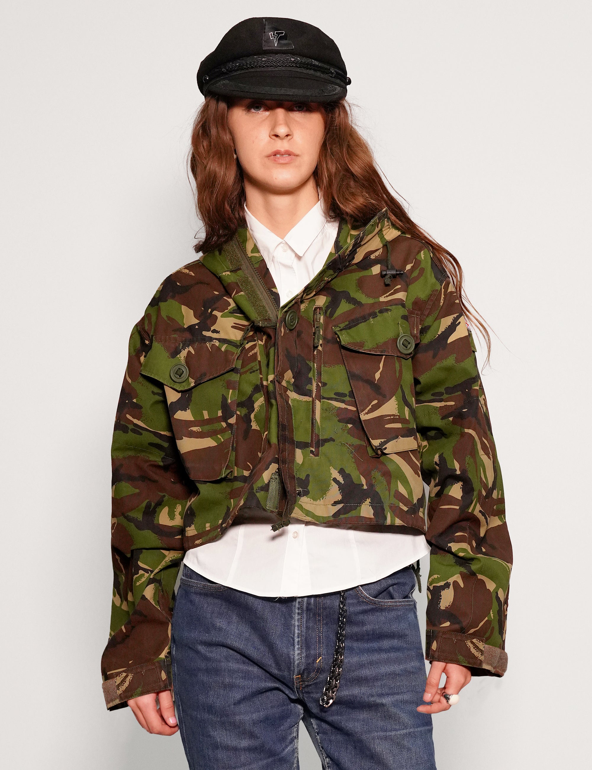 Cropped, hooded British Army DPM smock, circa early 1990's. 100% cotton. Front cargo pockets, adjustable hood, and waist fasteners.