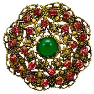 Beautiful Czech gilt metal filigree brooch, featuring a lovely green centre stone with surrounding pink stones.