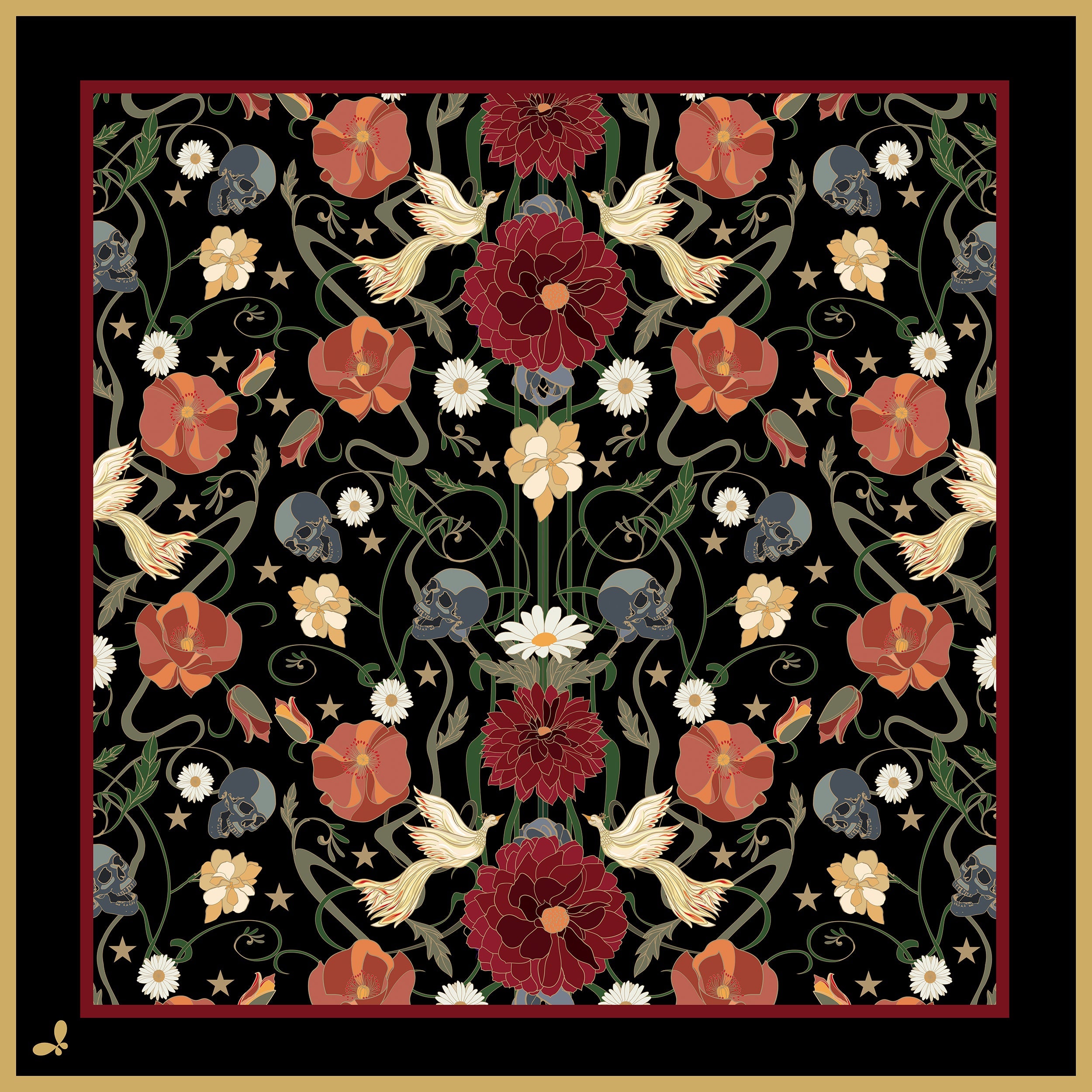 Vintage regency style pattern featuring flowers, birds and skulls.