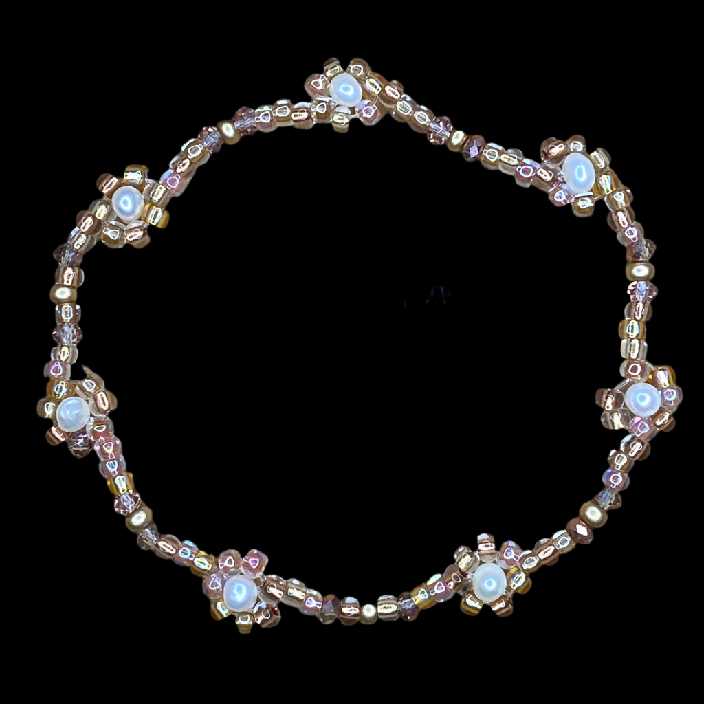The Daisy Rosy Glow Pearl Bracelet is handmade from rose gold Preciosa and Miyuki glass beads with freshwater pearls.  Choose your size and optional 24kt gold vermeil letter in the options.