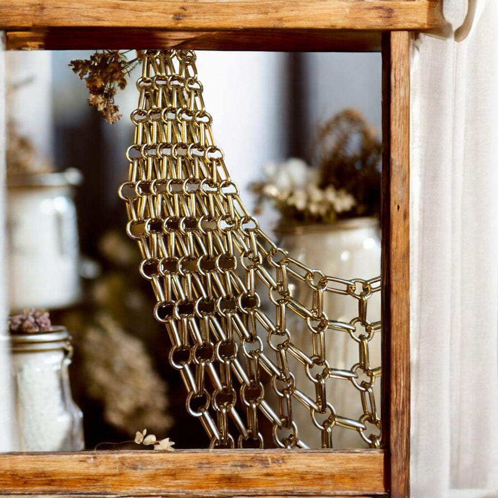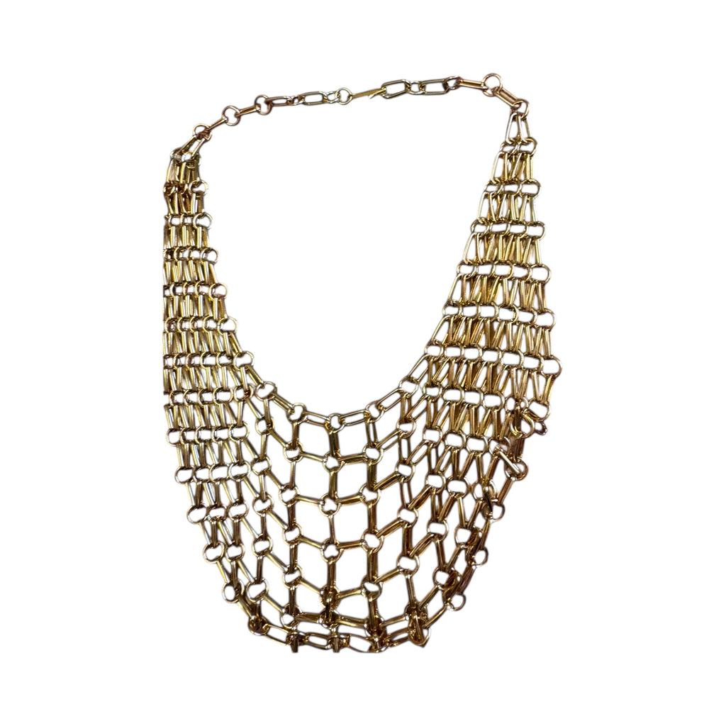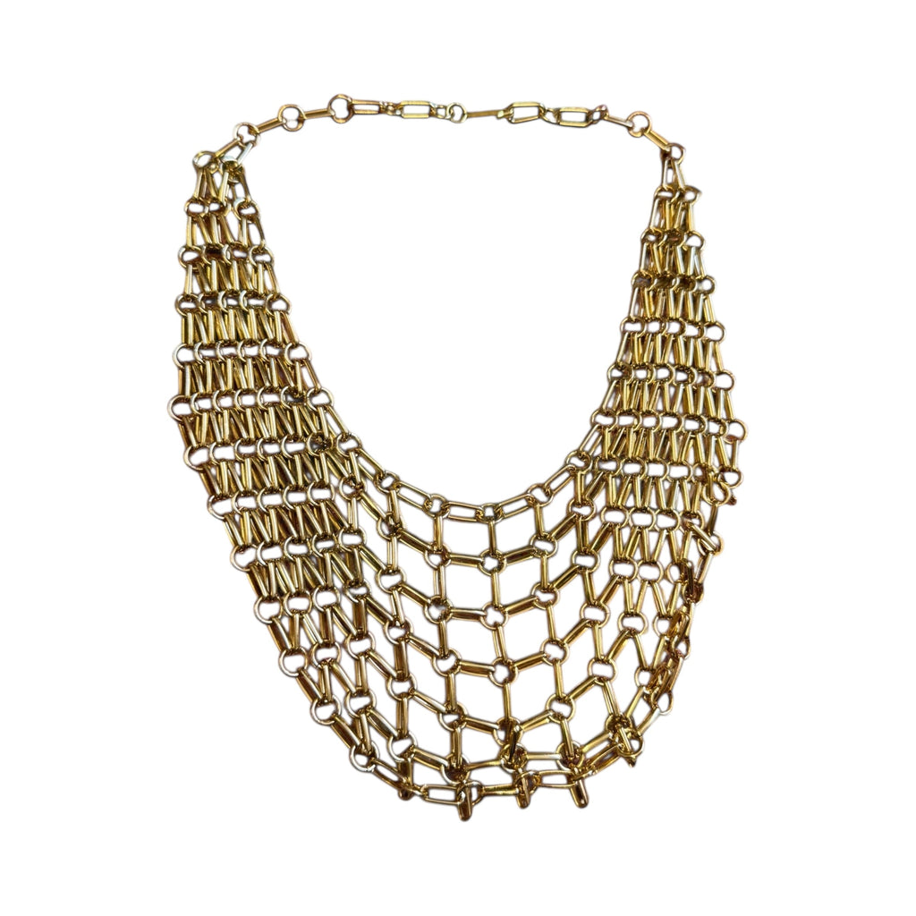 This 1970s gold-plated chainmail ecklace design is arranged in elegant tiers. Secured with a discreet back hook, it offers both comfort and style. Its distinctive vintage aesthetic makes it a striking statement piece, while its versatile design allows effortless pairing with a variety of outfits. Ideal for those seeking an easy every day statement necklace.