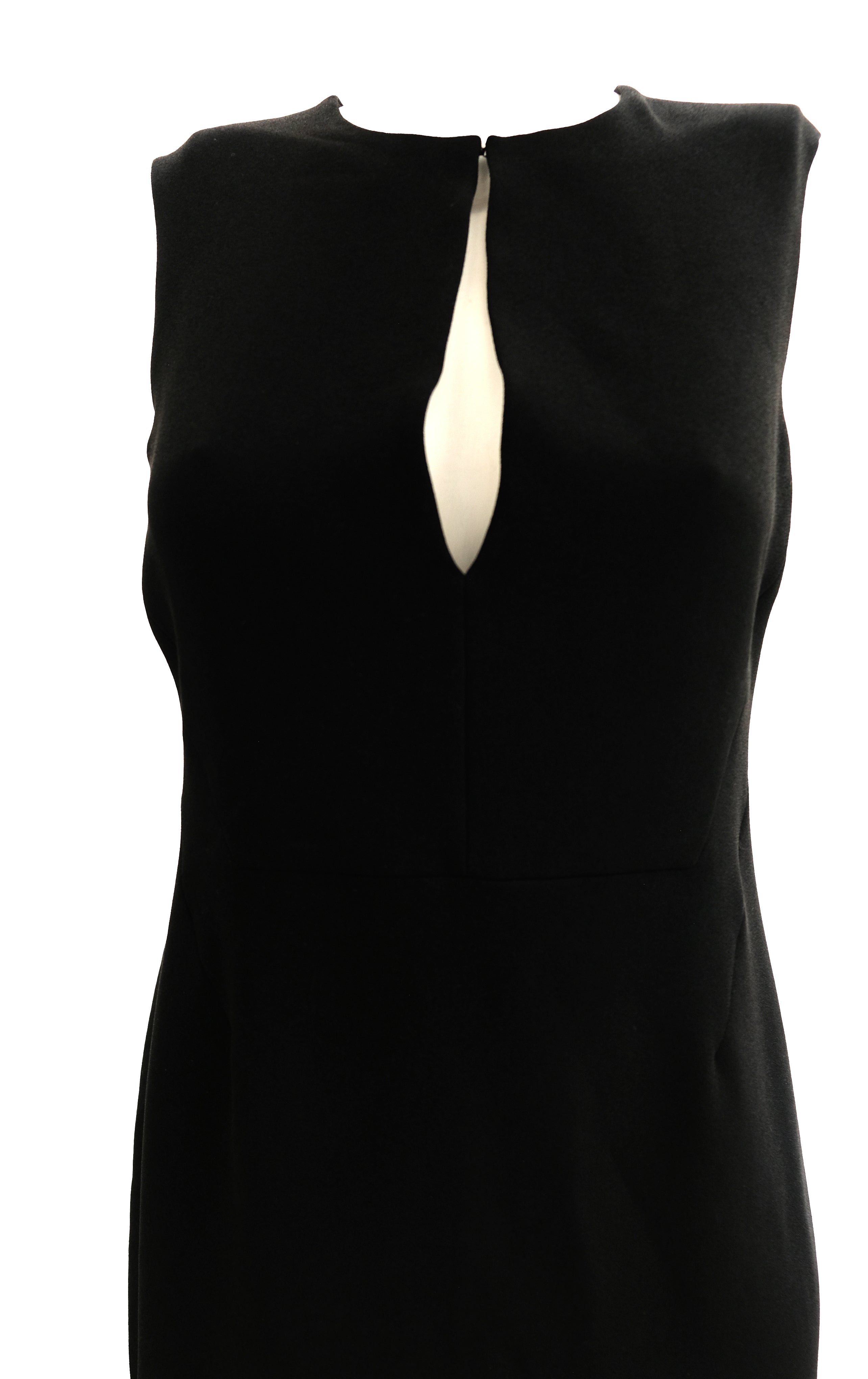 Sleeveless, knee length, with deep slit front, fastening at the top with a hook and eye. Beautifully shaped with curving darts. Back zip, unlined.