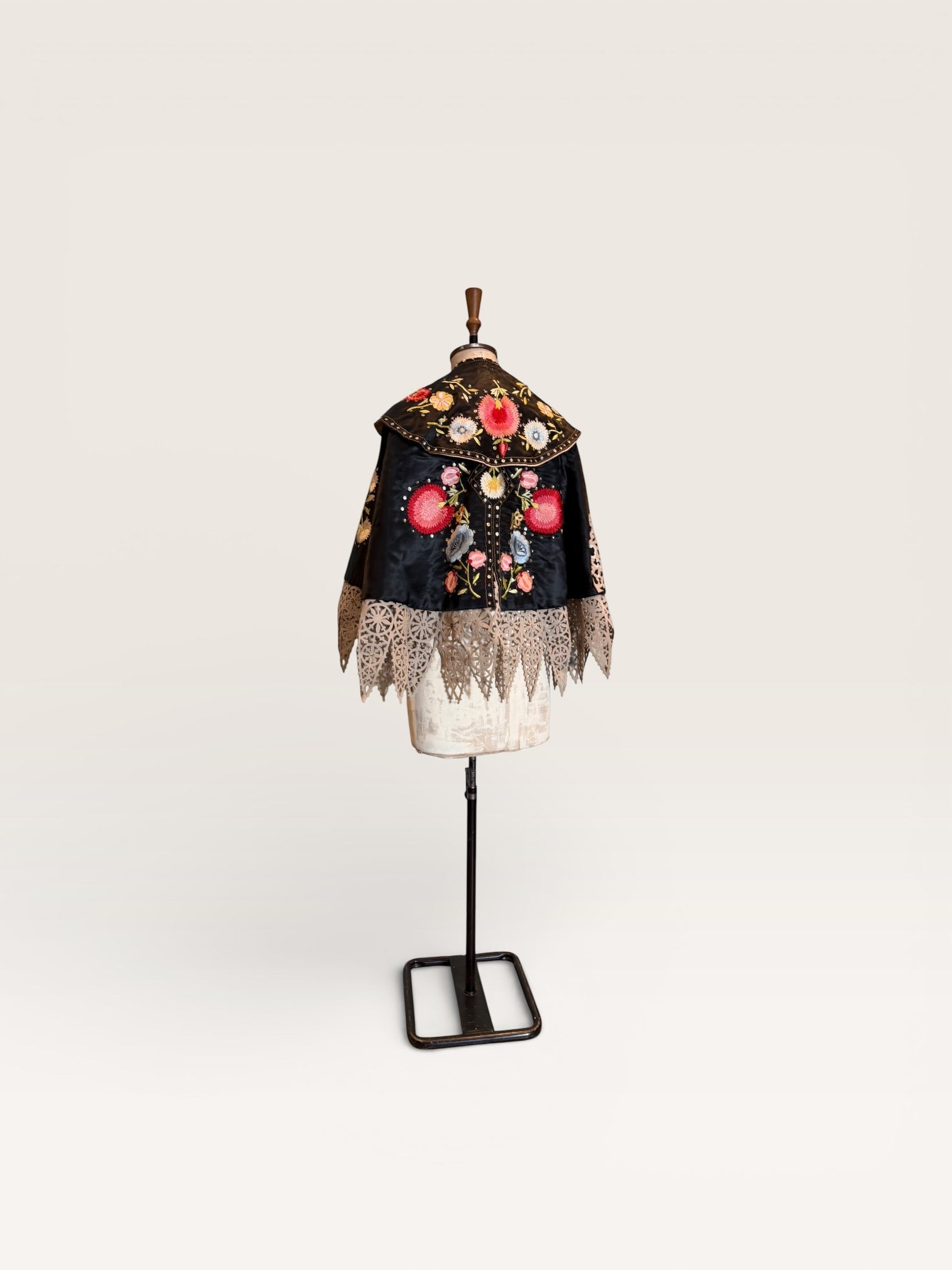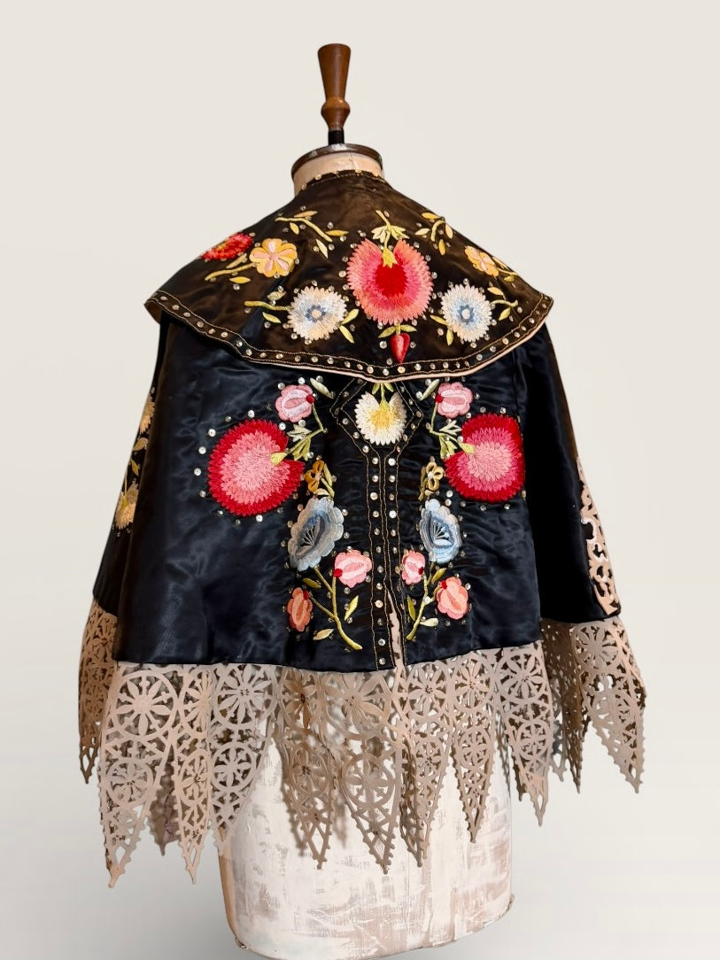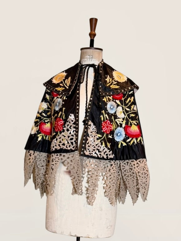 Introducing a magnificent embodiment of 1930s matador Trajes de Luces elegance, crafted from sumptuous black silk. This singular cape, adorned with vibrant embroidered florals and silver sequins along its opulent collar, features an adjustable braided neckline and a unique scalloped suede hemline. A true future heirloom, it exudes a timeless artistry that transforms any ensemble into a statement of sophistication.