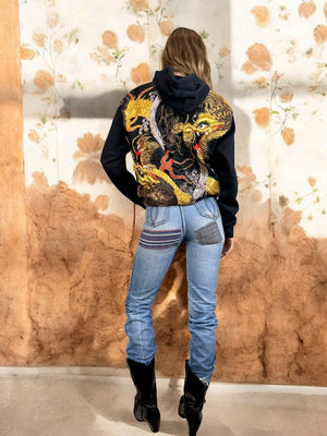This vintage black sweatshirt boasts a unique touch with a reworked 40s silk back and pocket featuring intricately embroidered dragons in gold thread. Stay warm and stylish with its long sleeves, hood, and front pocket. Perfect for those who appreciate vintage and high-quality craftsmanship wishing to uplift their casual wear.