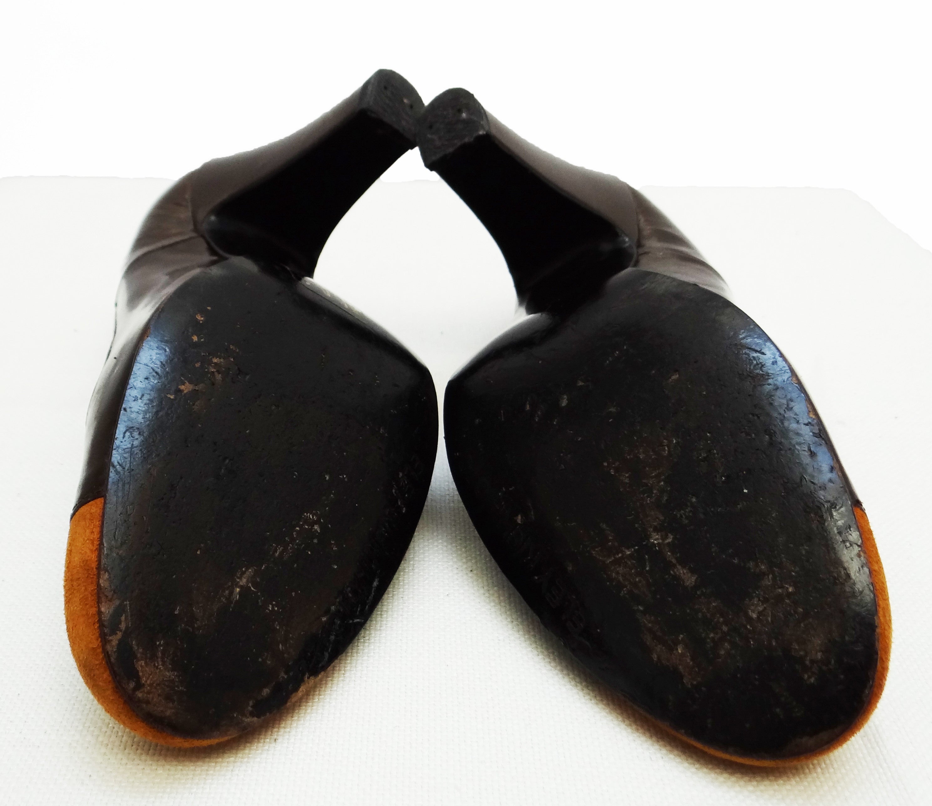 An unusual and eye-catching pair of court shoes by Eley Kishimoto, 1990s vintage. They are made of bronze patent leather with contrasting ochre suede toe cap and strip at the back of the heel.