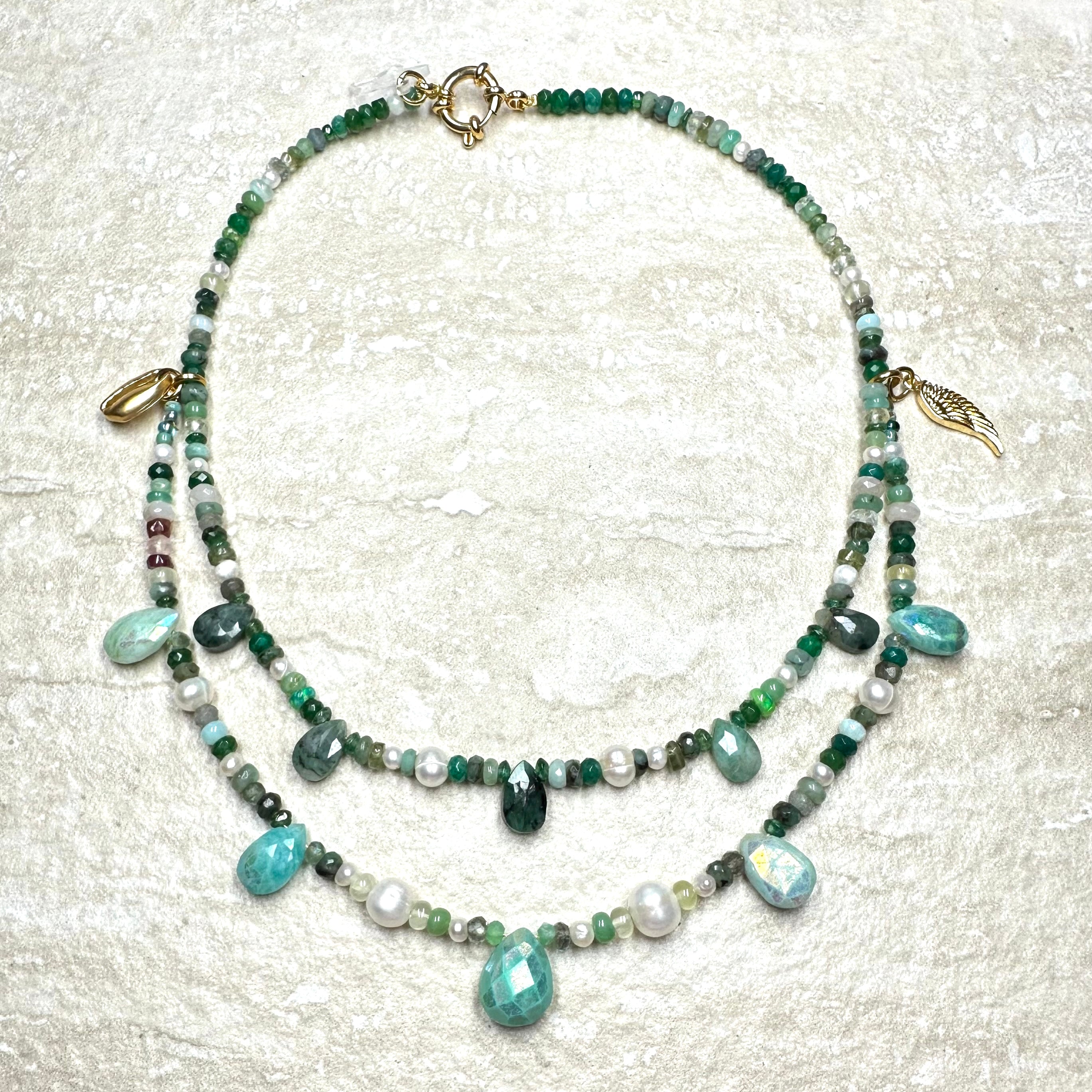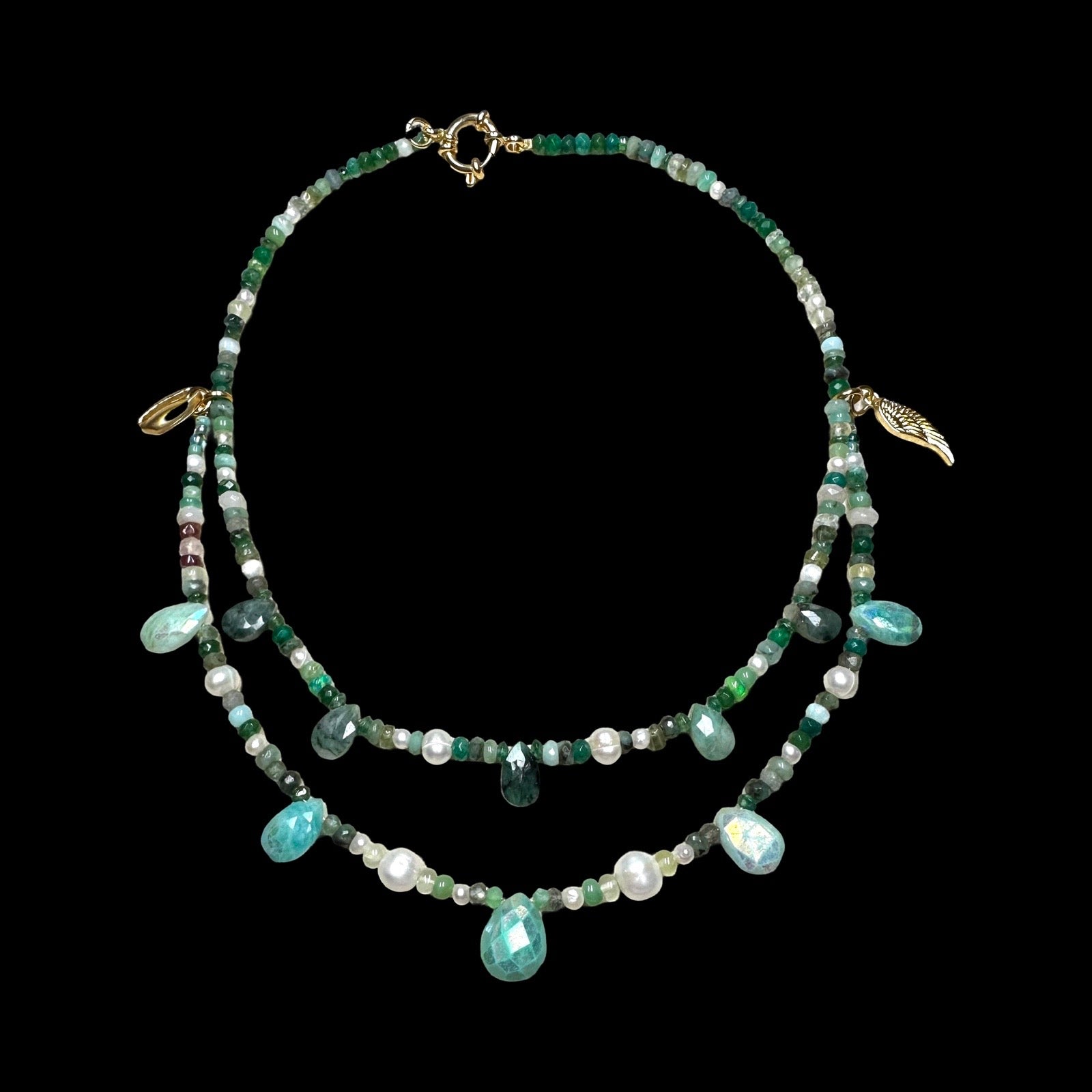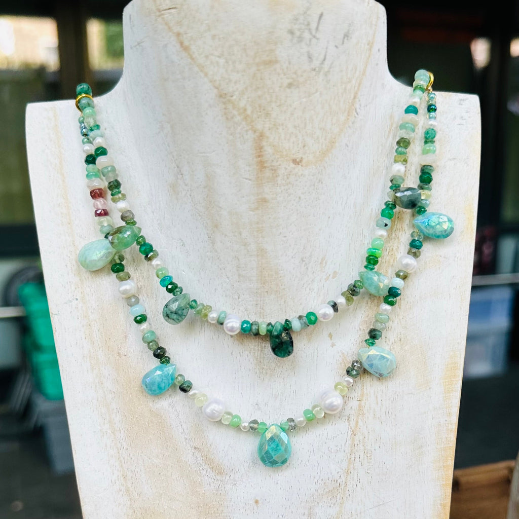 Centred by hand cut faceted chrysoprase and emerald teardrop briolettes, this beautiful double strand necklace is handmade from a mix of soft green gemstone rondelles including chrysoprase, green apatite, prenite, aventurine and white pearls. It has 22kt gold charms.