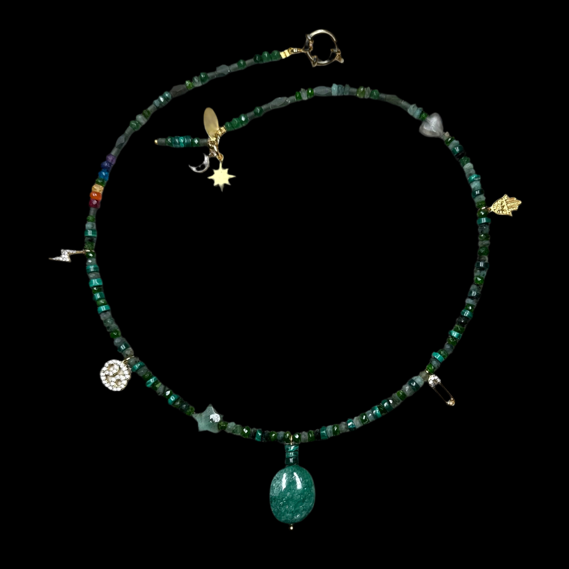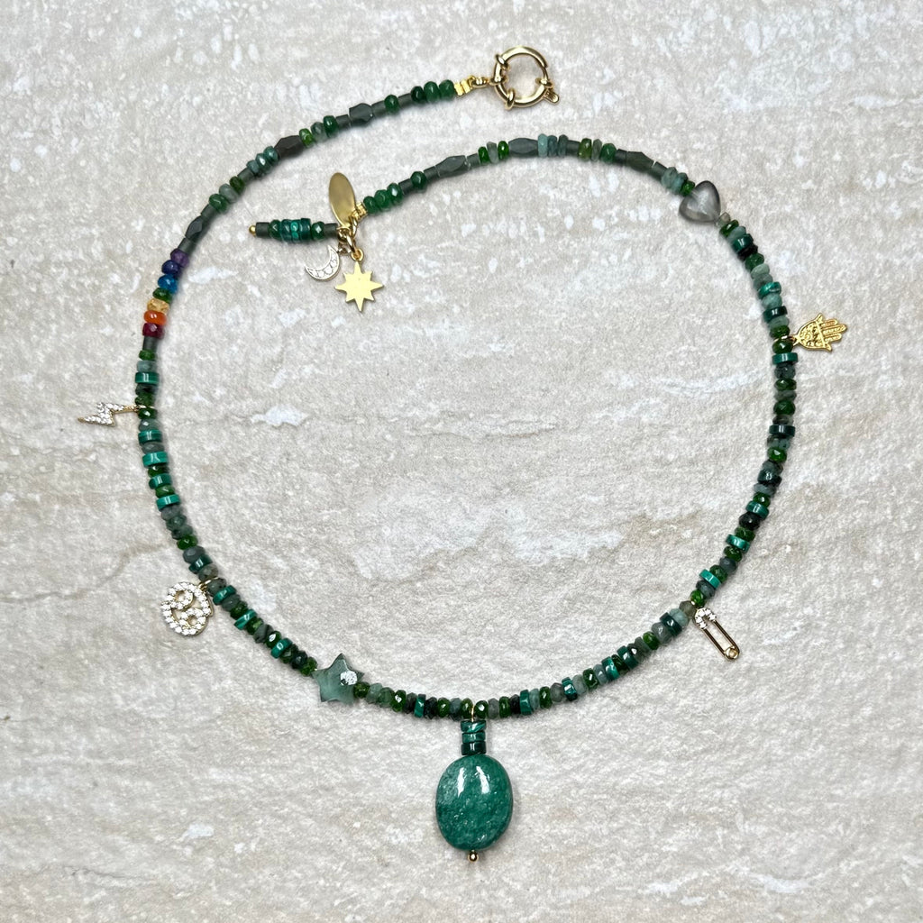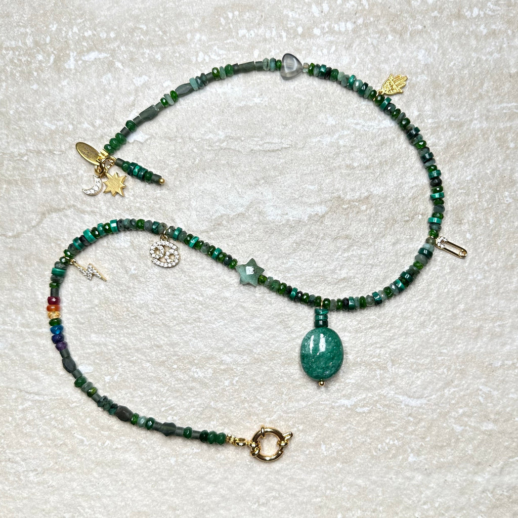 This unique Necklace is handmade with malachite heishi with faceted and smooth jade, emerald rondelles and centred by a stunning oval emerald with malachite heishi.  Added details are a hand cut emerald star, flourite heart, 22kt gold safety pin, hamza hand, lightning bolt and star vermeil charms, including your horoscope (choose in options) and precious rainbow in ruby, carnelian, citrine, emerald, topaz, sapphire and amethyst.