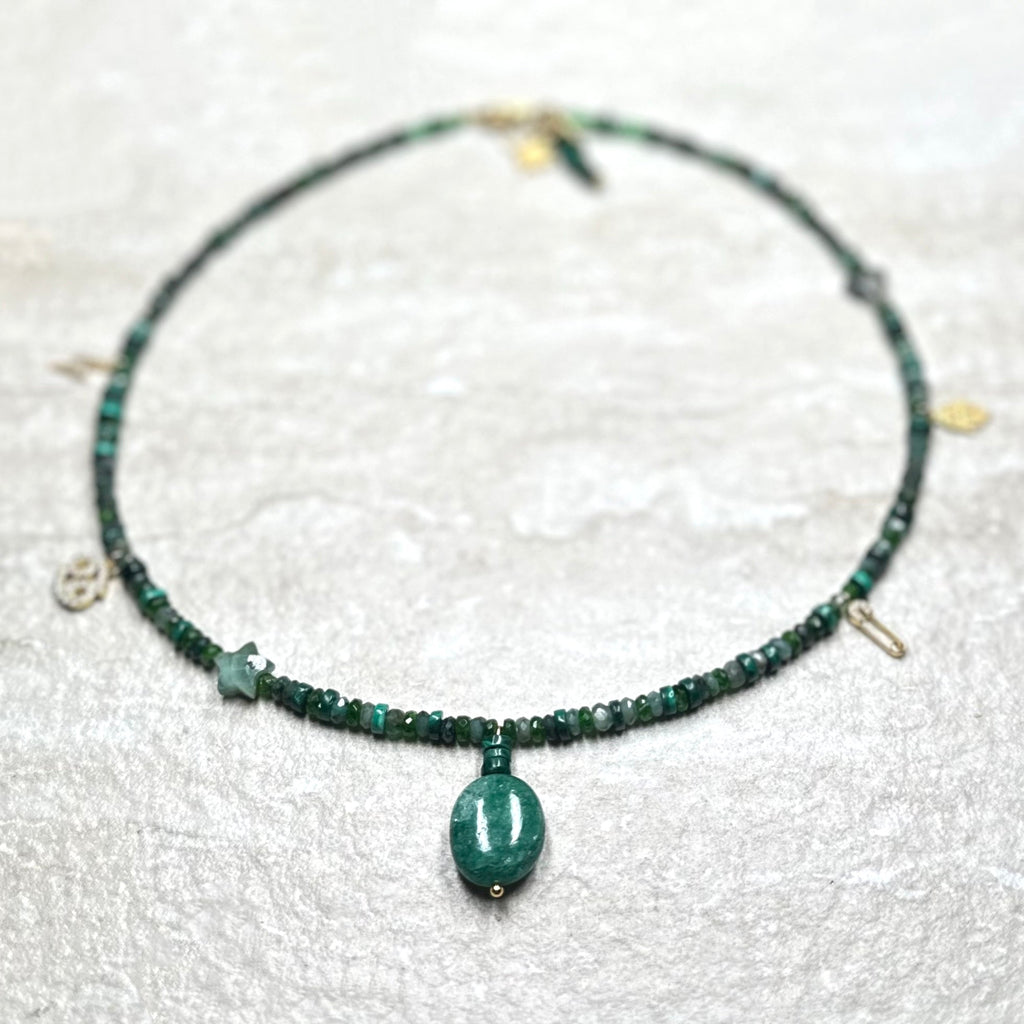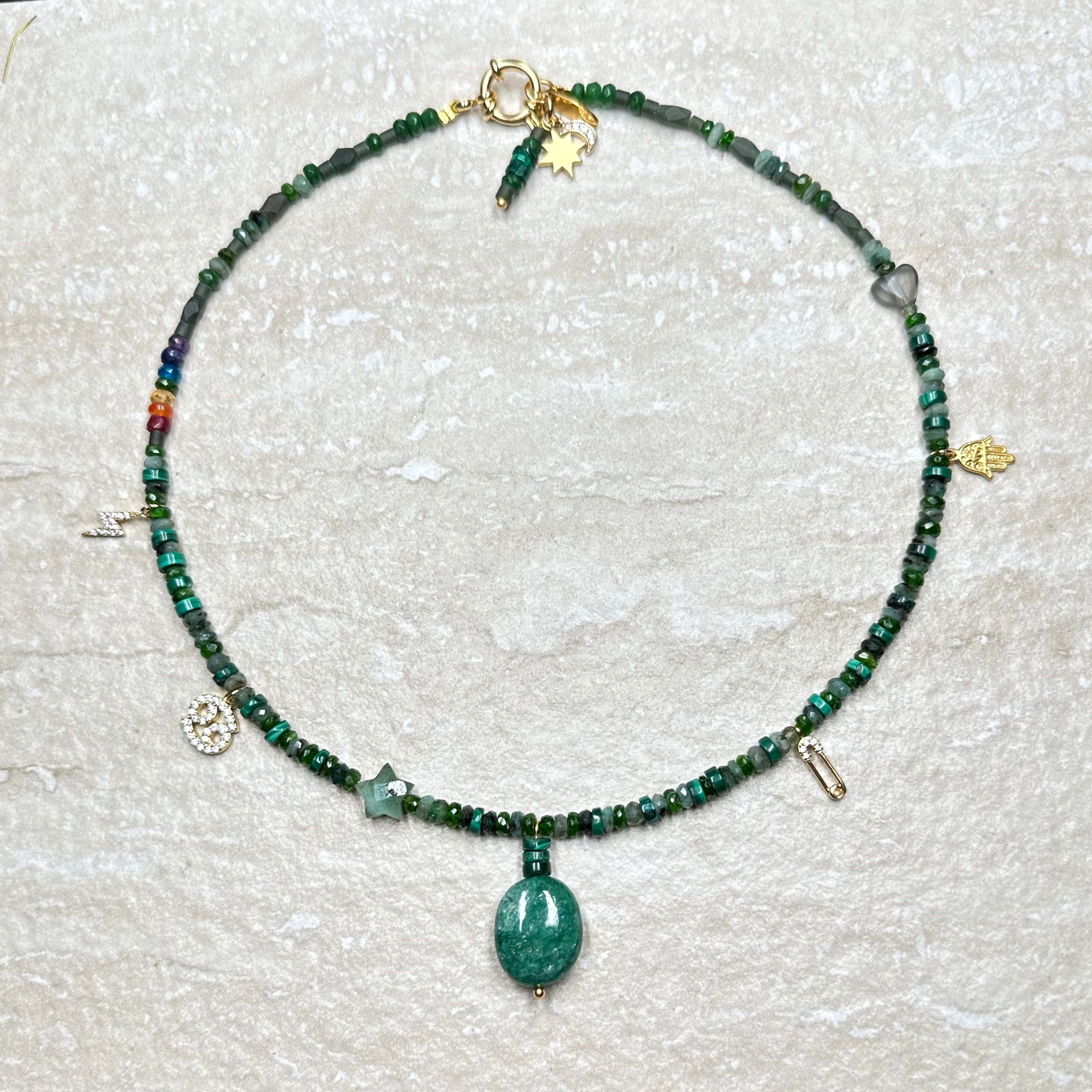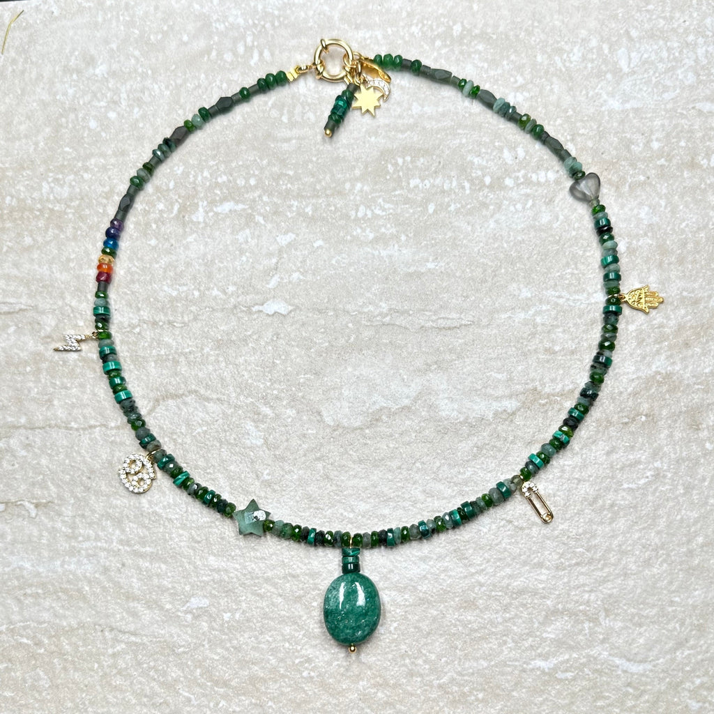 This unique Necklace is handmade with malachite heishi with faceted and smooth jade, emerald rondelles and centred by a stunning oval emerald with malachite heishi.  Added details are a hand cut emerald star, flourite heart, 22kt gold safety pin, hamza hand, lightning bolt and star vermeil charms, including your horoscope (choose in options) and precious rainbow in ruby, carnelian, citrine, emerald, topaz, sapphire and amethyst.