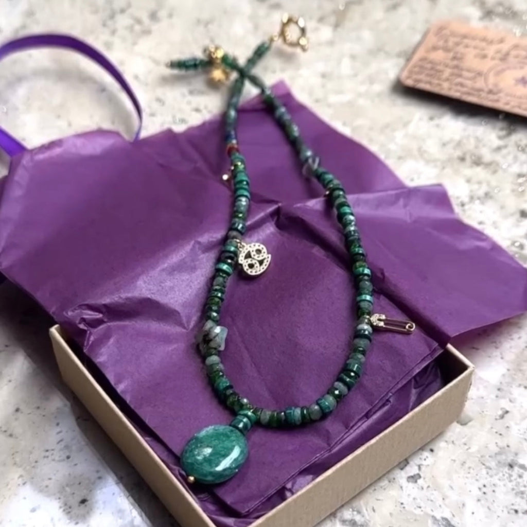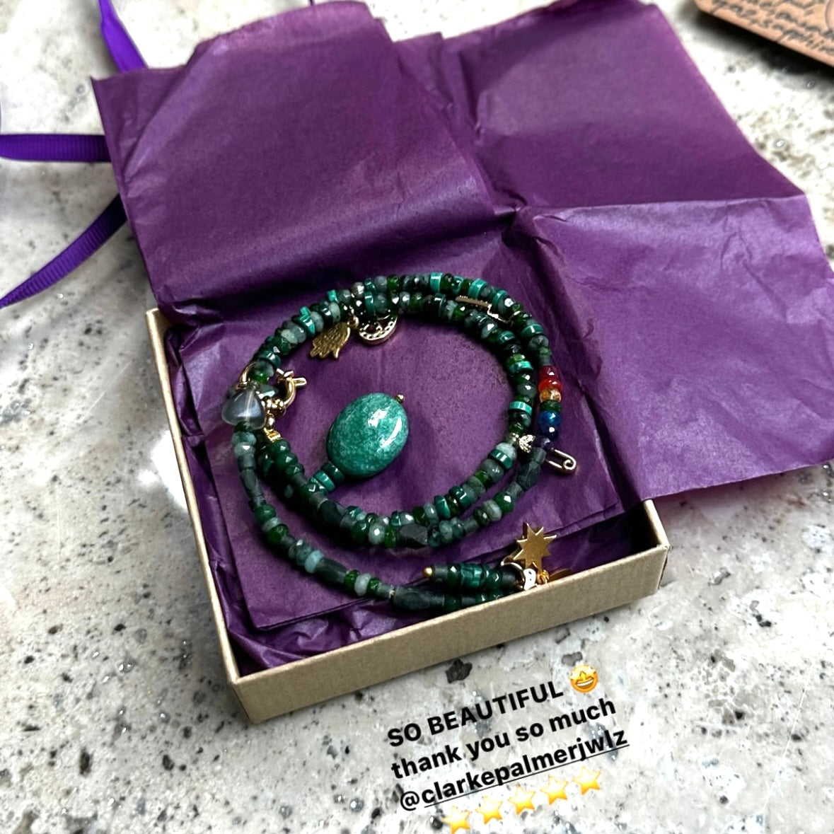 The stunning green shades of the gemstones in this necklace can help support the Heart Chakra which is the middle Chakra and represents the ability to be loved and to love. It helps you to treat yourself and others with kindness and respect.