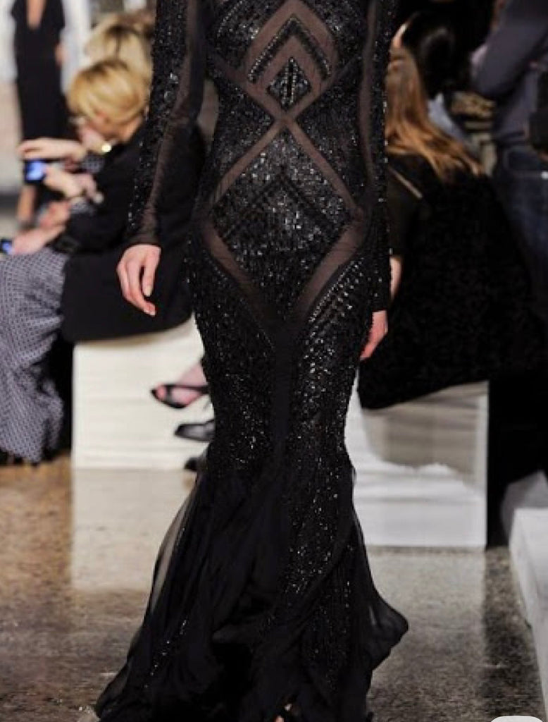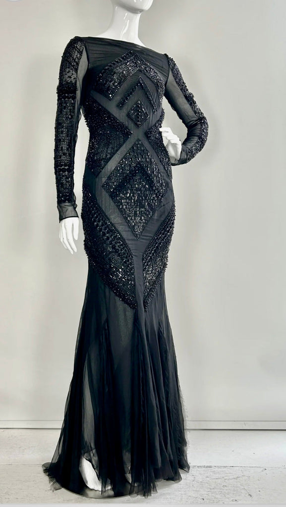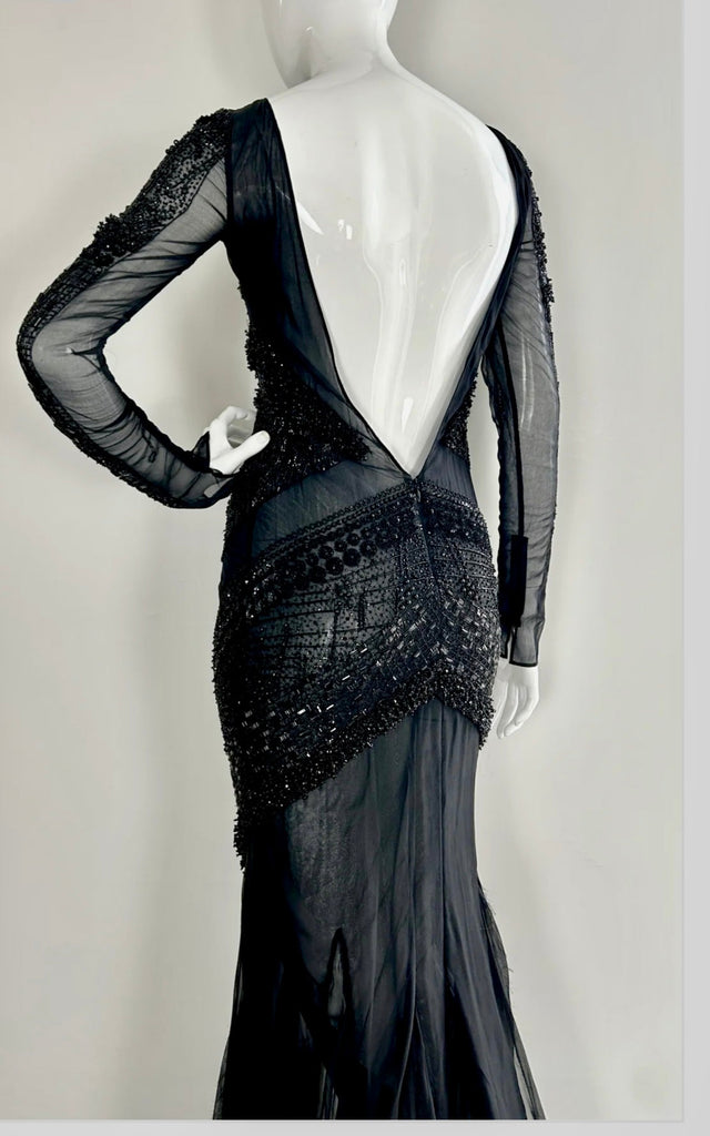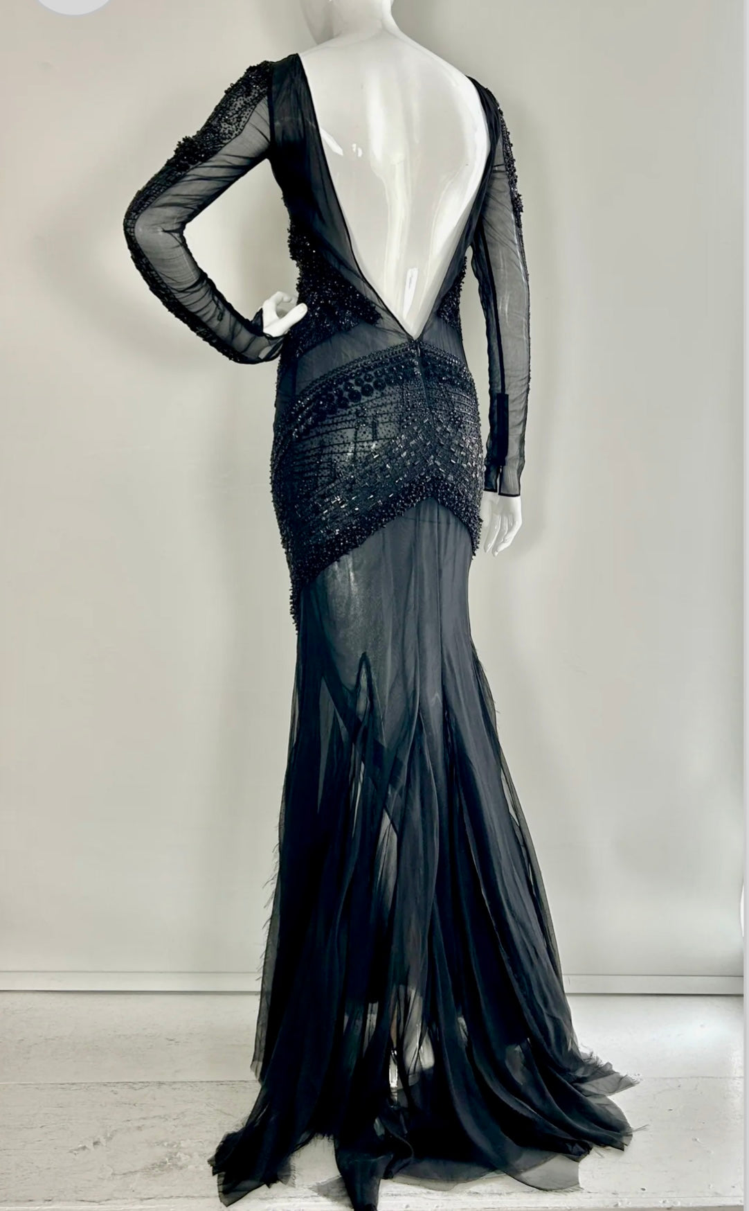 Experience timeless elegance with this Emilio Pucci by Peter Dundas 2012 catwalk gown. This stunning silk chiffon gown features intricate beading on the sleeves, a round neckline, and gorgeous geometric beading throughout the dress, creating a wonderful pattern on the body. The tailored fishtail silhouette and low back add a touch of modern sophistication.
