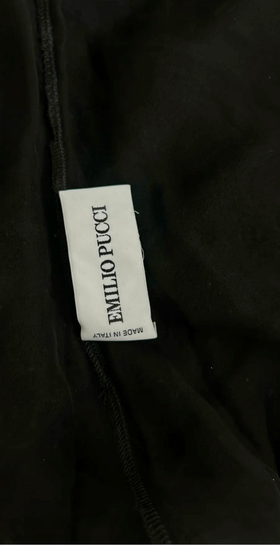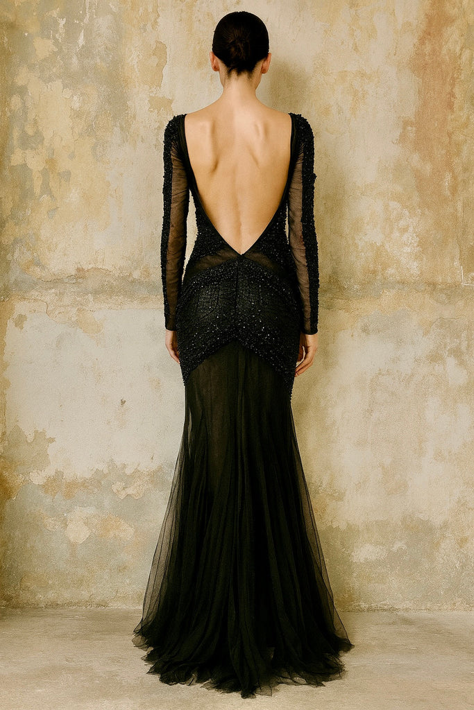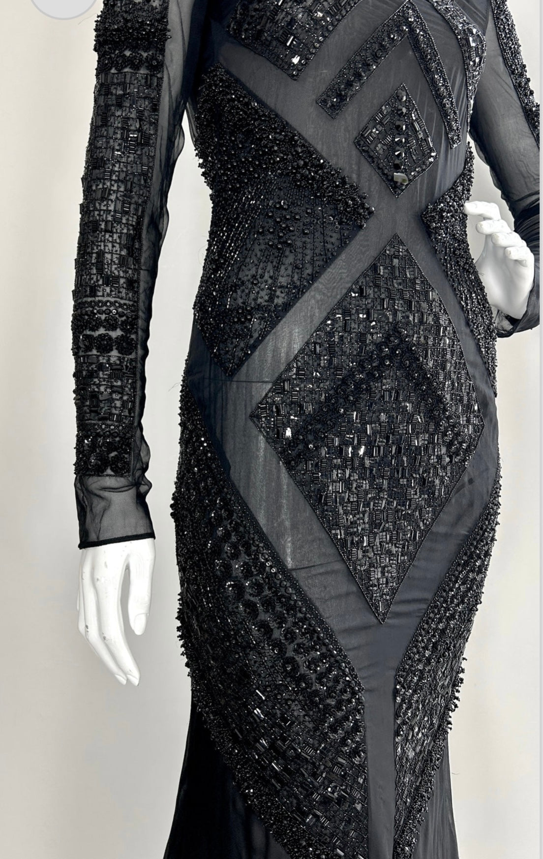 Experience timeless elegance with this Emilio Pucci by Peter Dundas 2012 catwalk gown. This stunning silk chiffon gown features intricate beading on the sleeves, a round neckline, and gorgeous geometric beading throughout the dress, creating a wonderful pattern on the body. The tailored fishtail silhouette and low back add a touch of modern sophistication.
