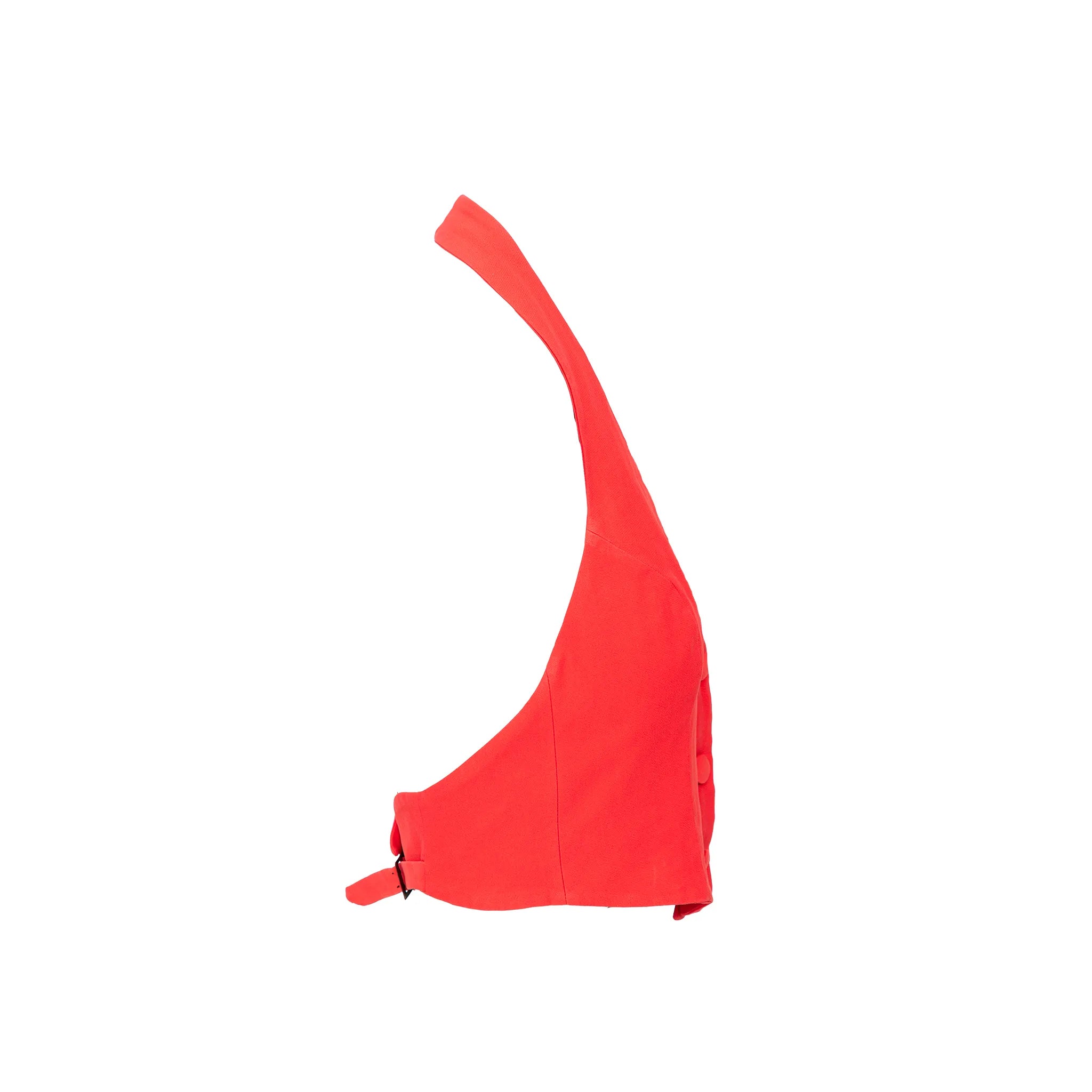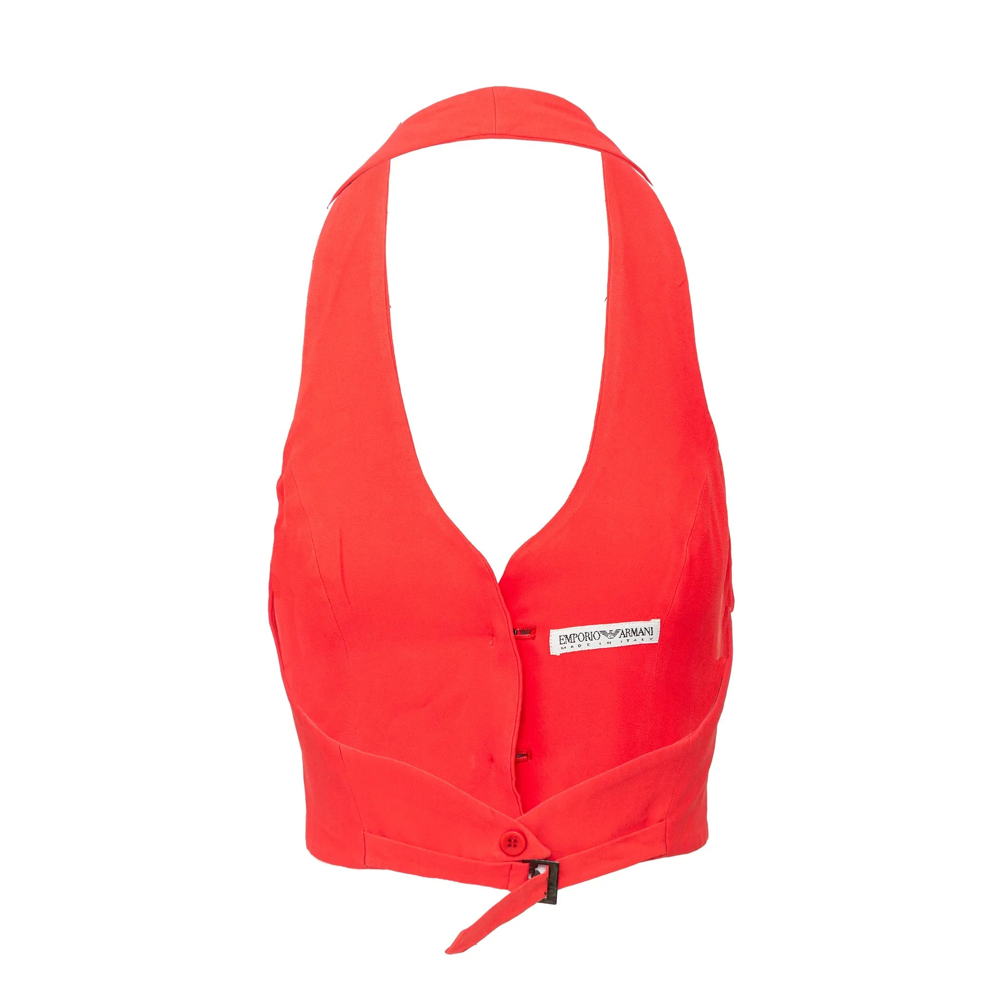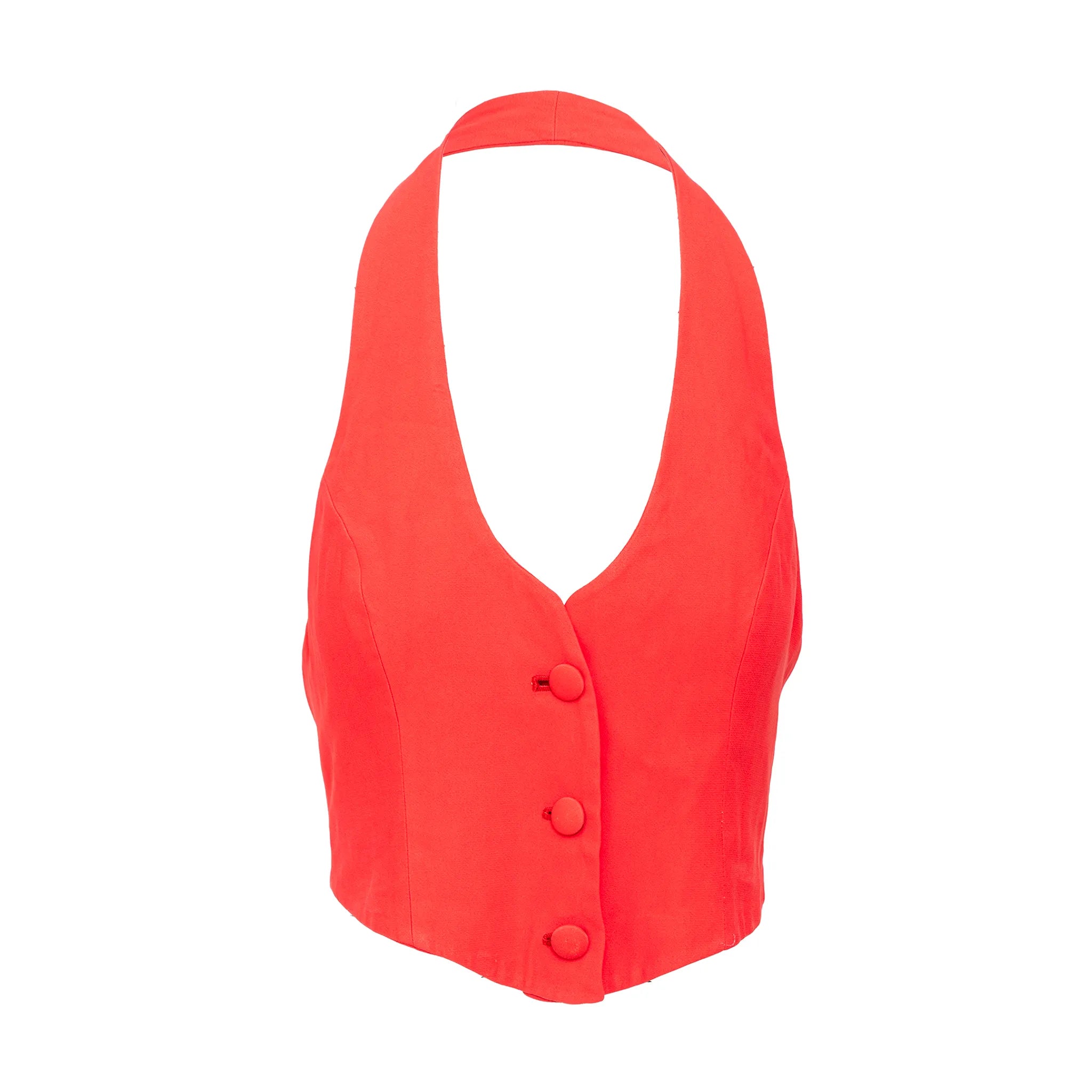 Made of acetate and viscose blend, this bold red vest-style top features a halter neck, open back, fabric-covered front buttons, and adjustable back buckle.
