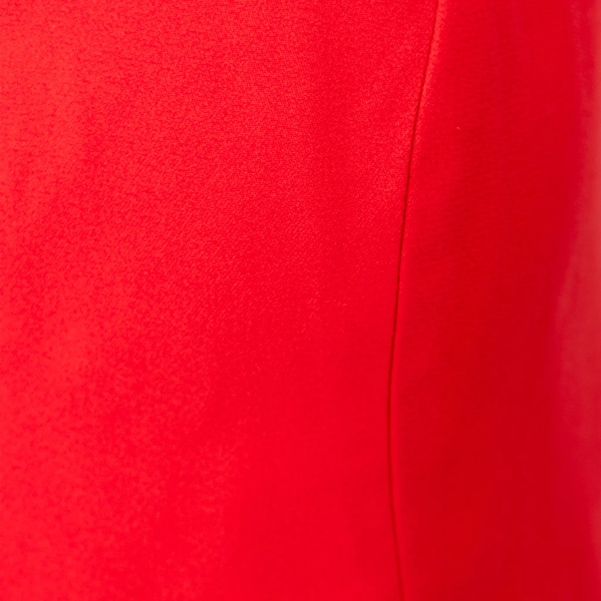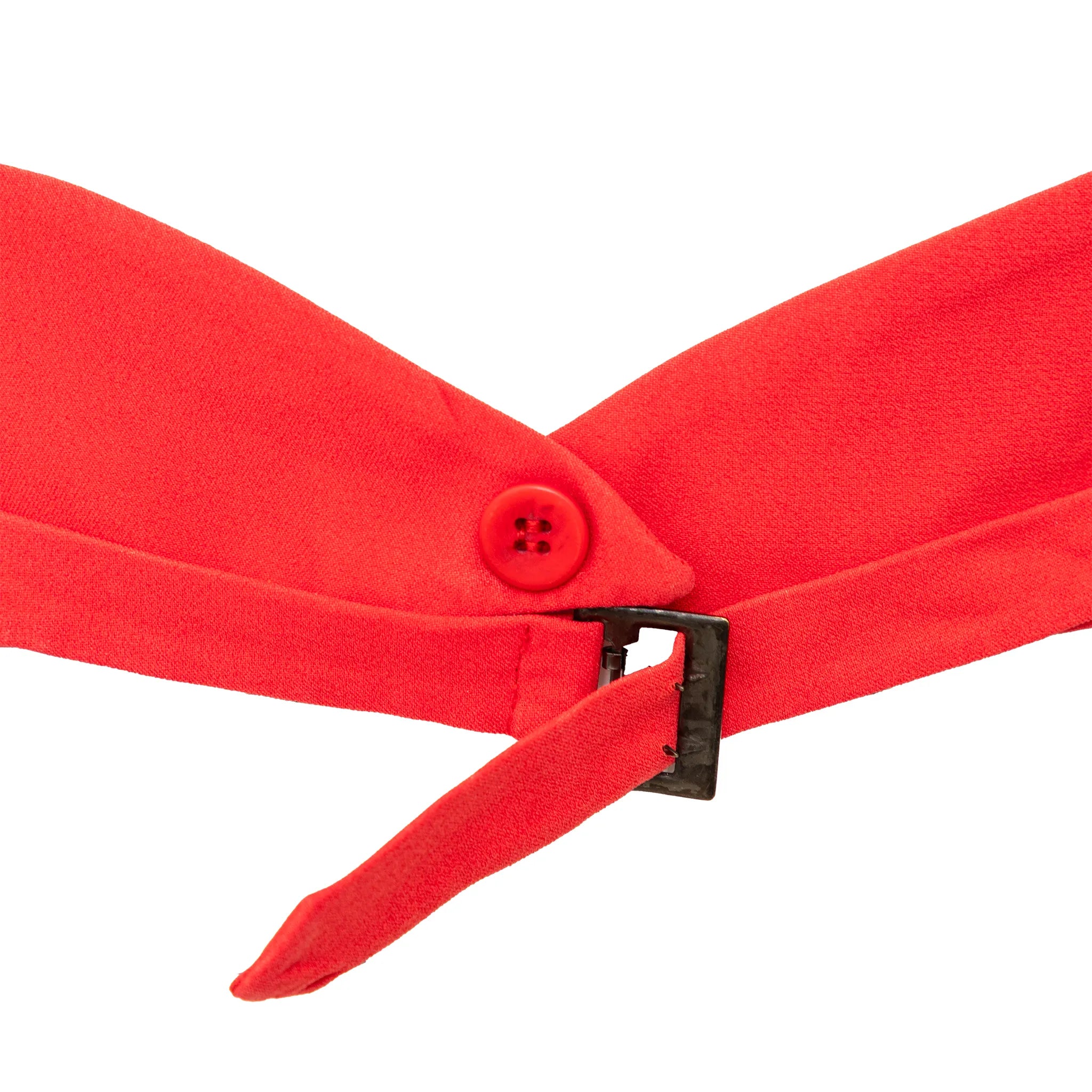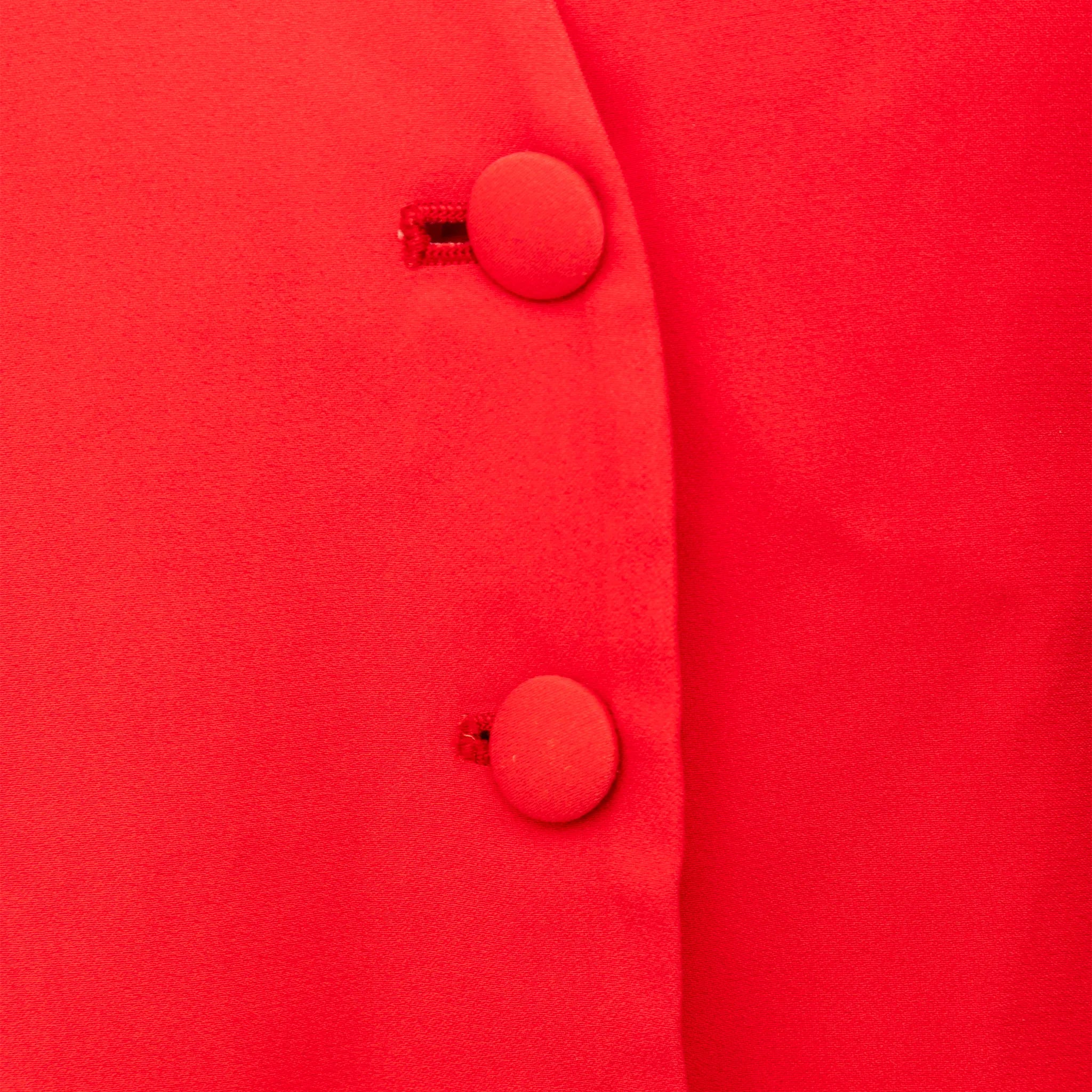 Made of acetate and viscose blend, this bold red vest-style top features a halter neck, open back, fabric-covered front buttons, and adjustable back buckle.