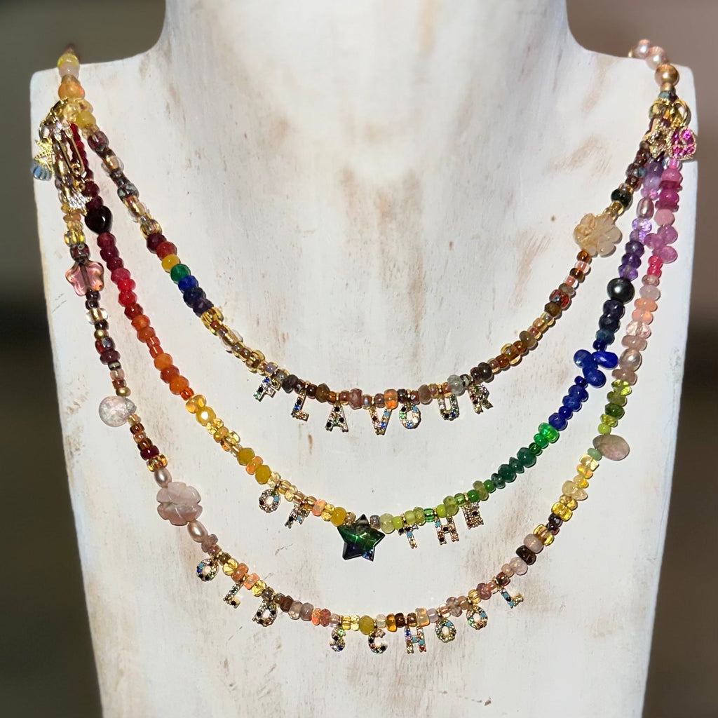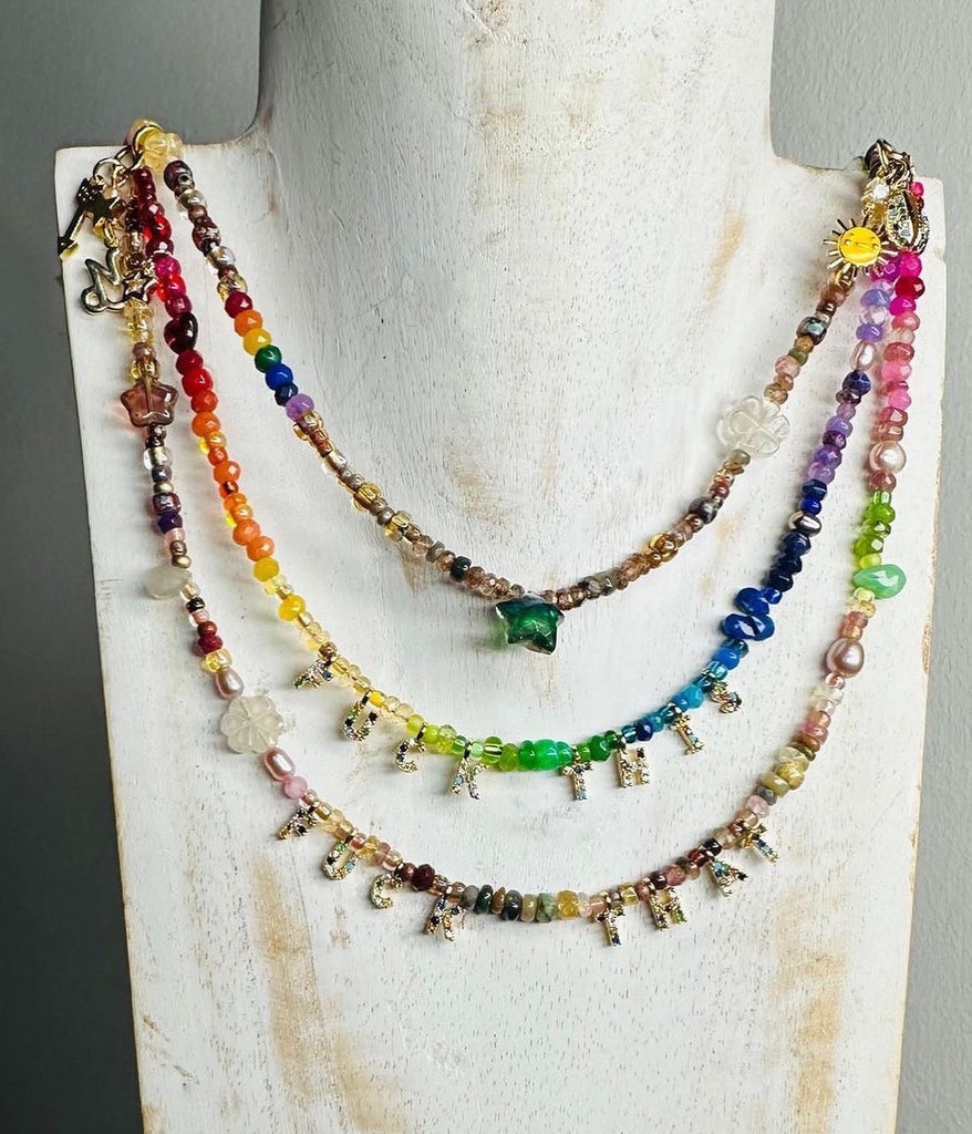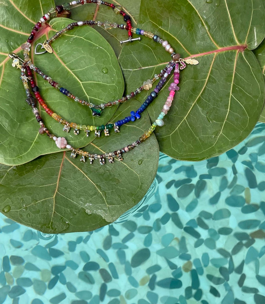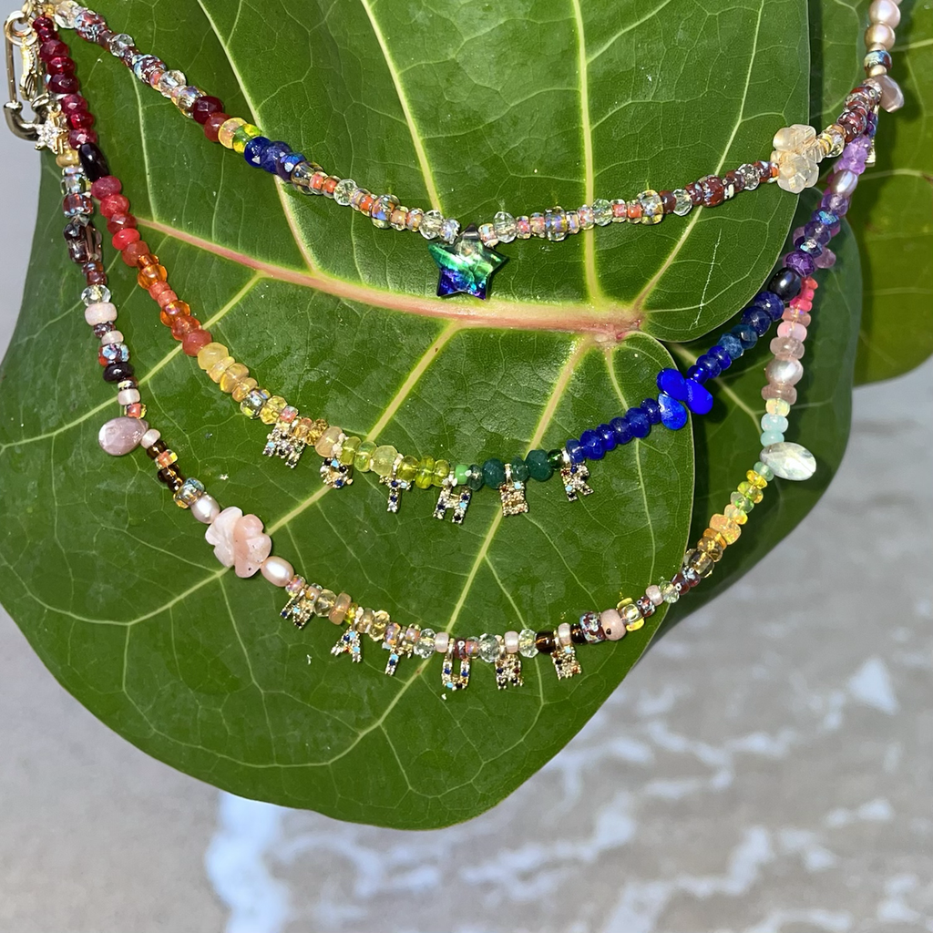 Part of our Precious Elements Collection, the Everything Mother Nature Necklace blends rainbow and earthy shades of precious and semi-precious stones including sustainably sourced ruby, Ethiopian opal, andesine, tourmaline, sapphire, emerald, garnet, citrine, peridot, amethyst, moonstone and Preciosa and Miyuki glass beads. Make your choice of tiny 24 kt Gold cz letters and length in the options.