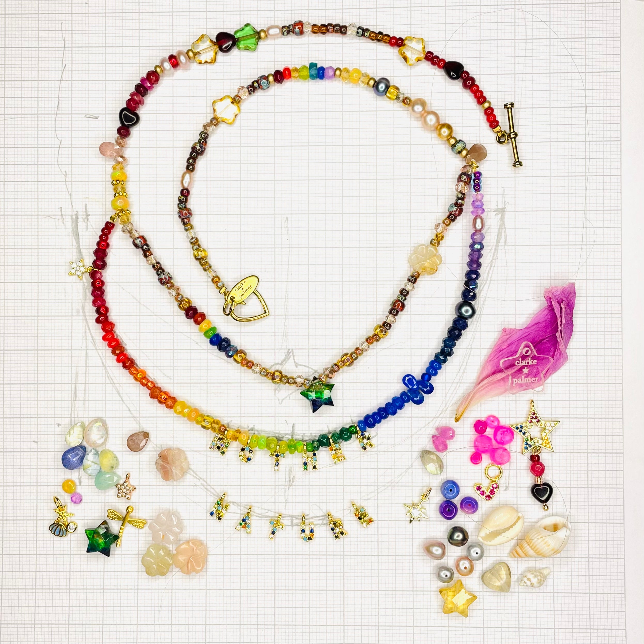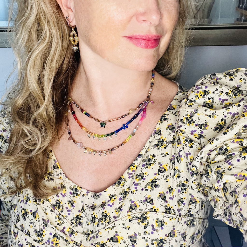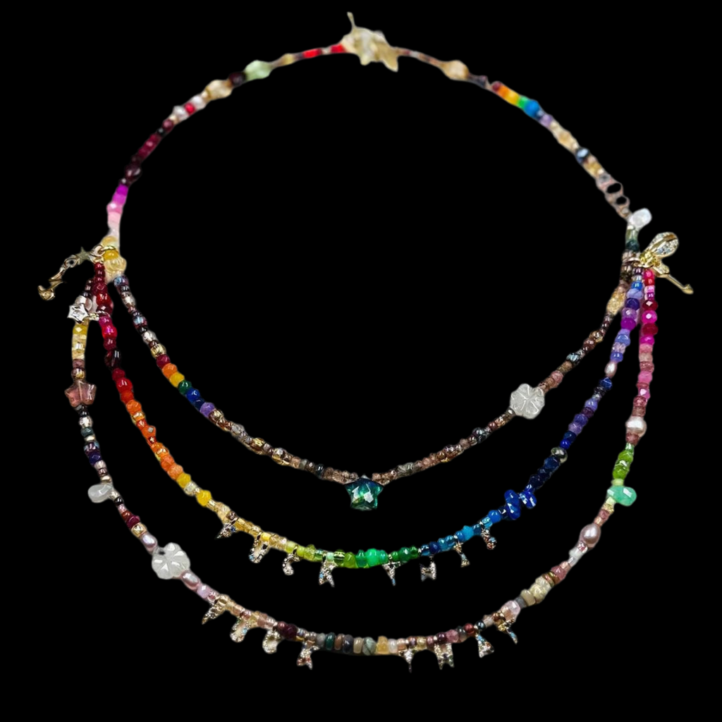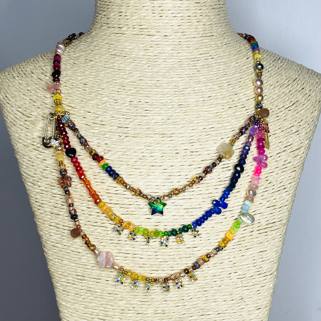 Part of our Precious Elements Collection, the Everything Mother Nature Necklace blends rainbow and earthy shades of precious and semi-precious stones including sustainably sourced ruby, Ethiopian opal, andesine, tourmaline, sapphire, emerald, garnet, citrine, peridot, amethyst, moonstone and Preciosa and Miyuki glass beads. Make your choice of tiny 24 kt Gold cz letters and length in the options.