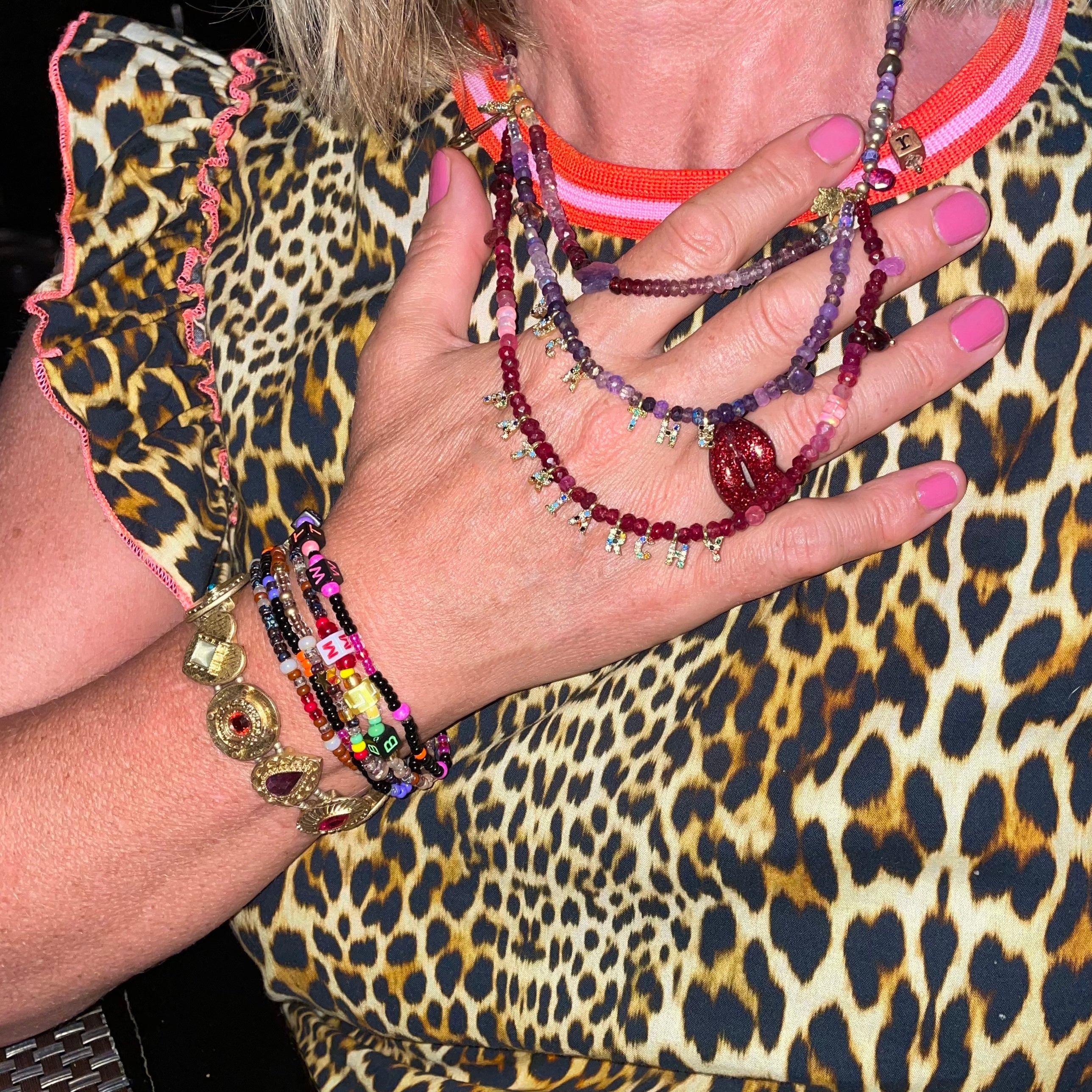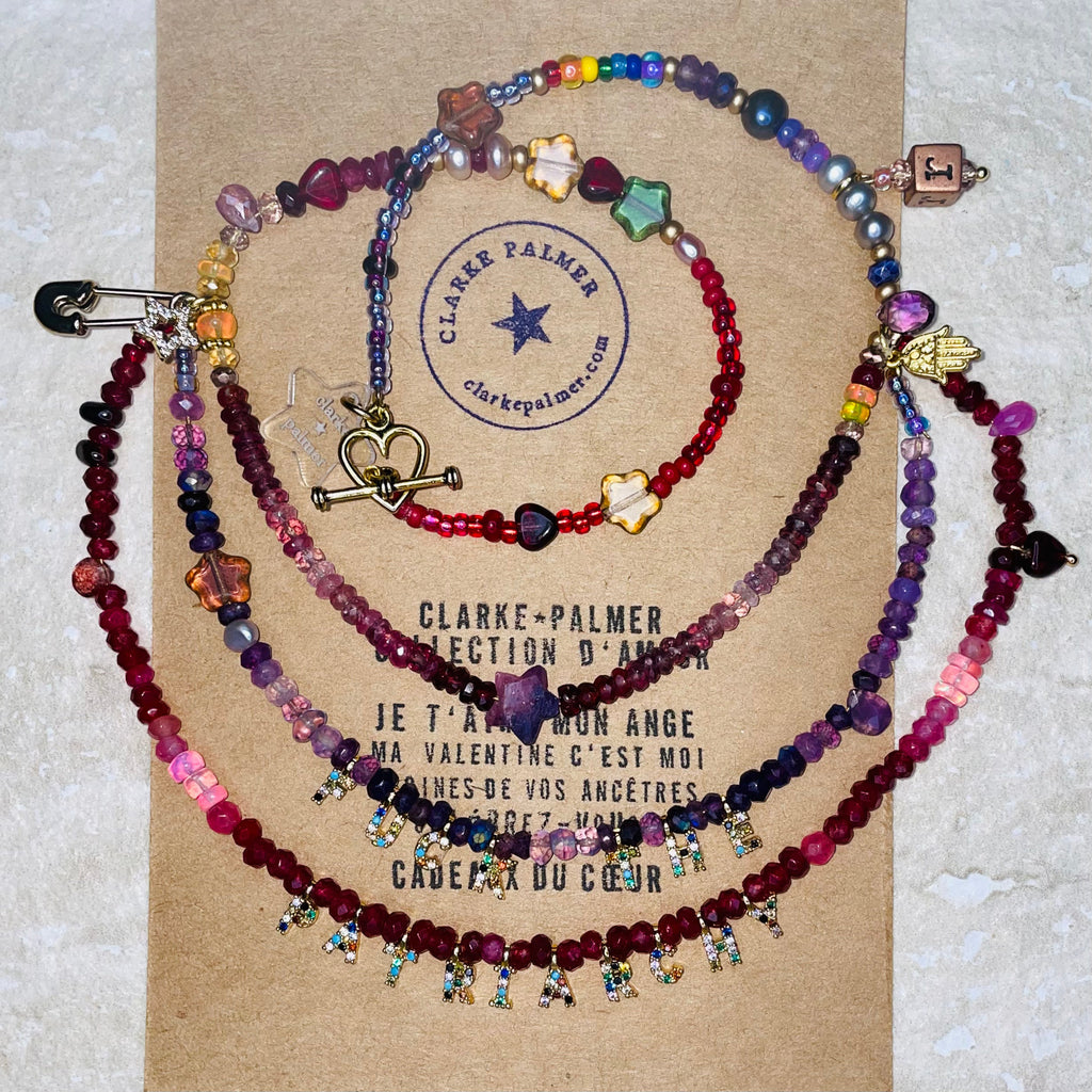 Part of our Precious Elements Collection, the Everything Ruby, Garnet, Amethyst and Tourmaline Necklace blends deep red and purple shades of precious and semi-precious stones including sustainably sourced ruby, Ethiopian opal, garnet, amethyst, spinel, strawberry quartz, citrine, tourmaline, andesine, moonstone and Preciosa and Miyuki glass beads. Centred by a sustainably sourced hand cut faceted Ruby star, this beautiful necklace has rainbow detail and a 24 kt gold vermeil heart shaped toggle clasp.