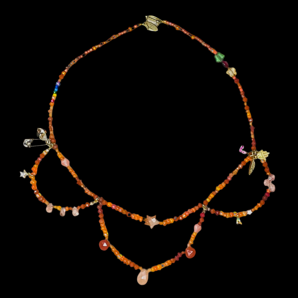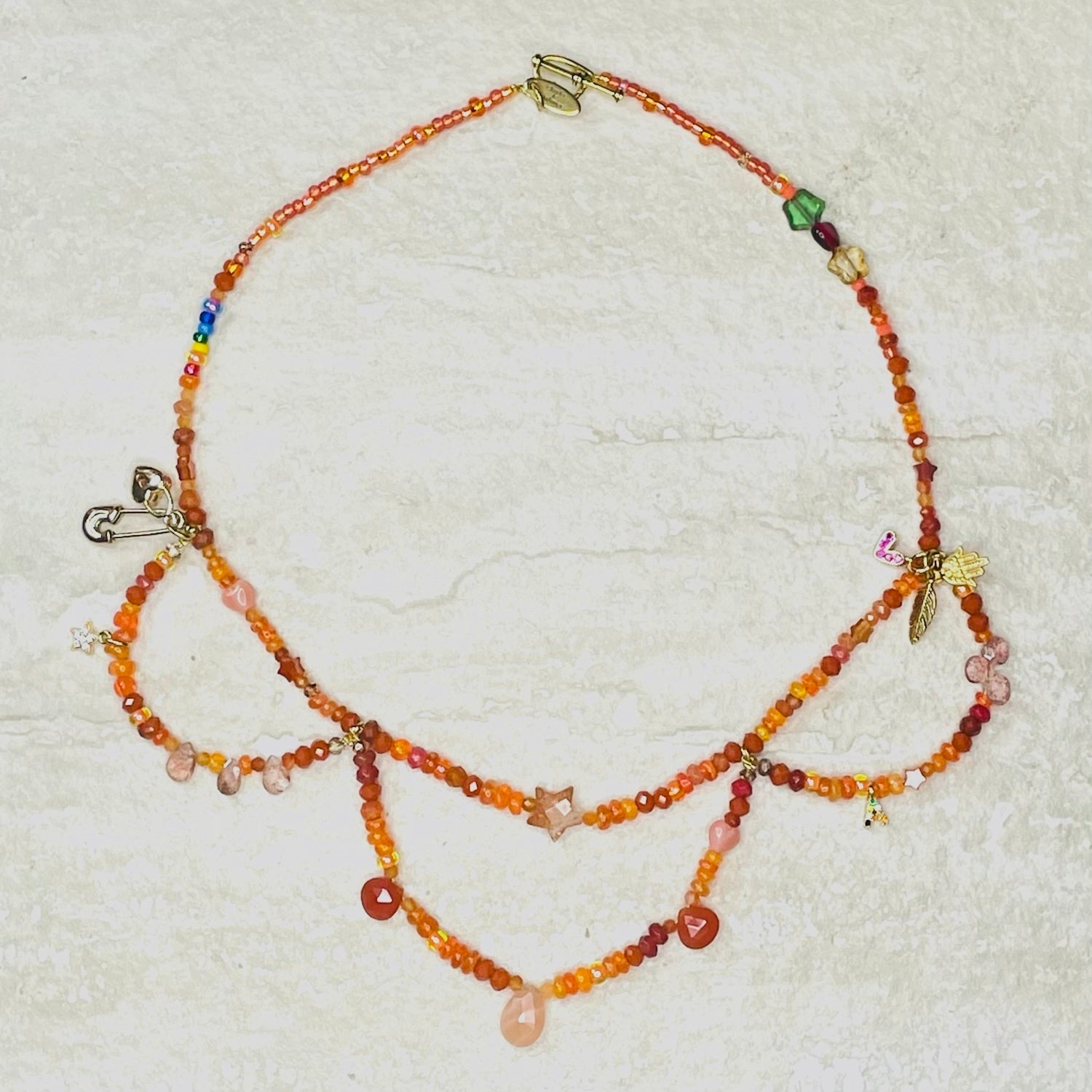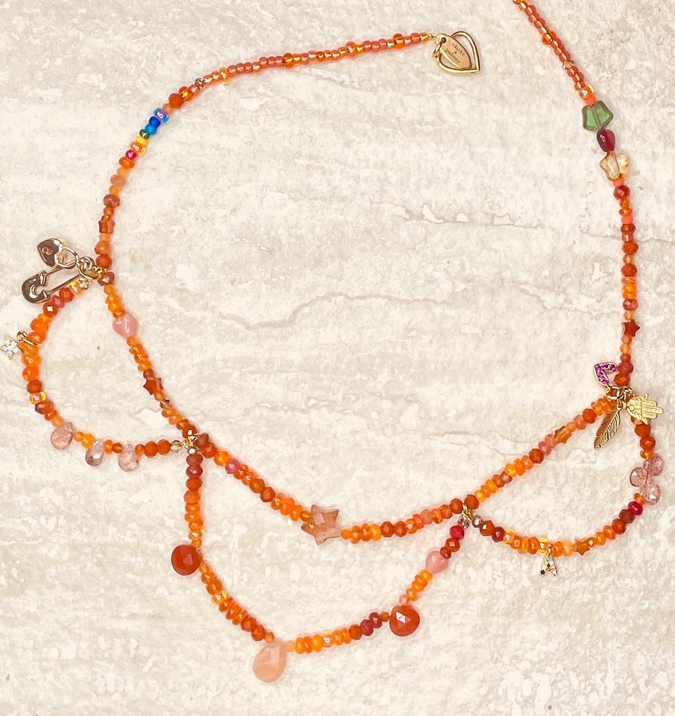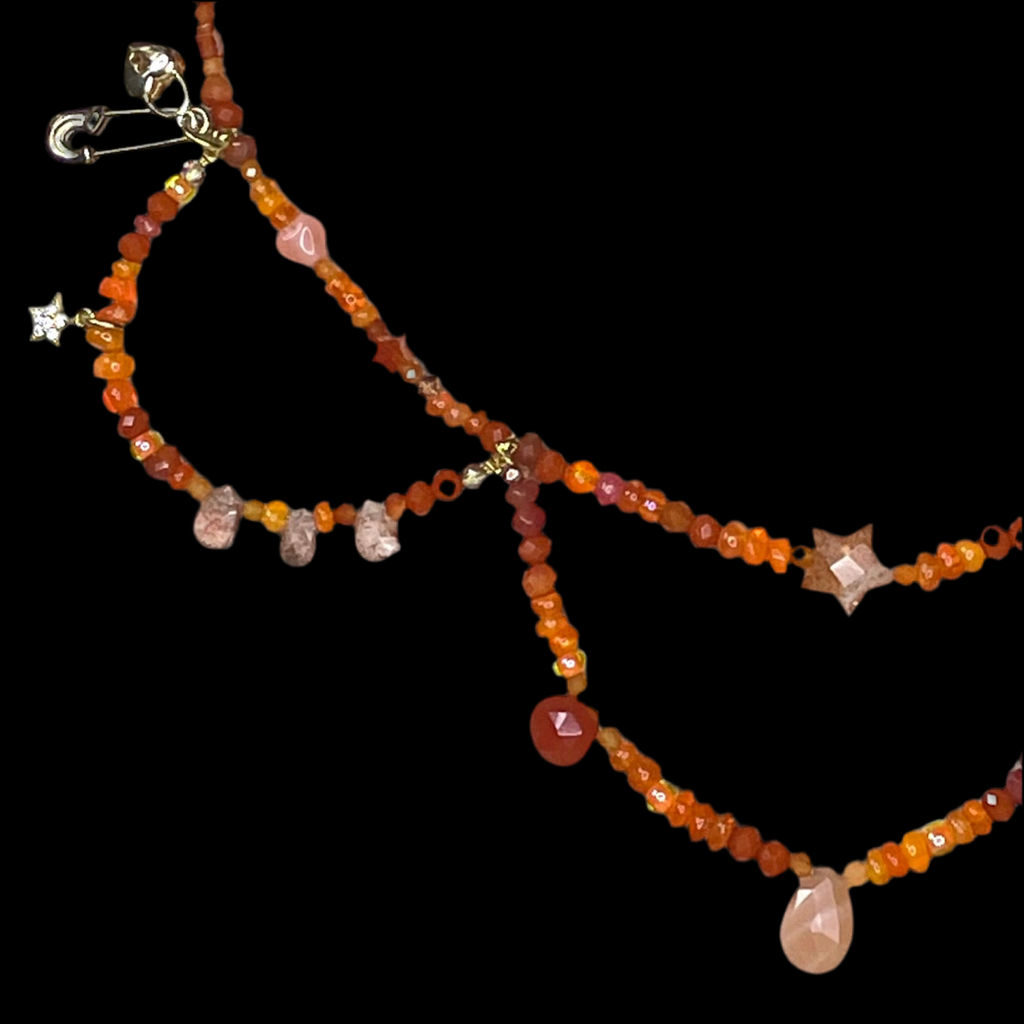 As worn by the beautiful Ariish Wol, this beautiful necklace is handmade from sustainably sourced stones in the most beautiful glowing, warm oranges. Centred by a hand cut sunstone star and faceted moonstone briolettes, it includes Ethiopian opals, carnelian, tourmaline and moonstone in fire shades.