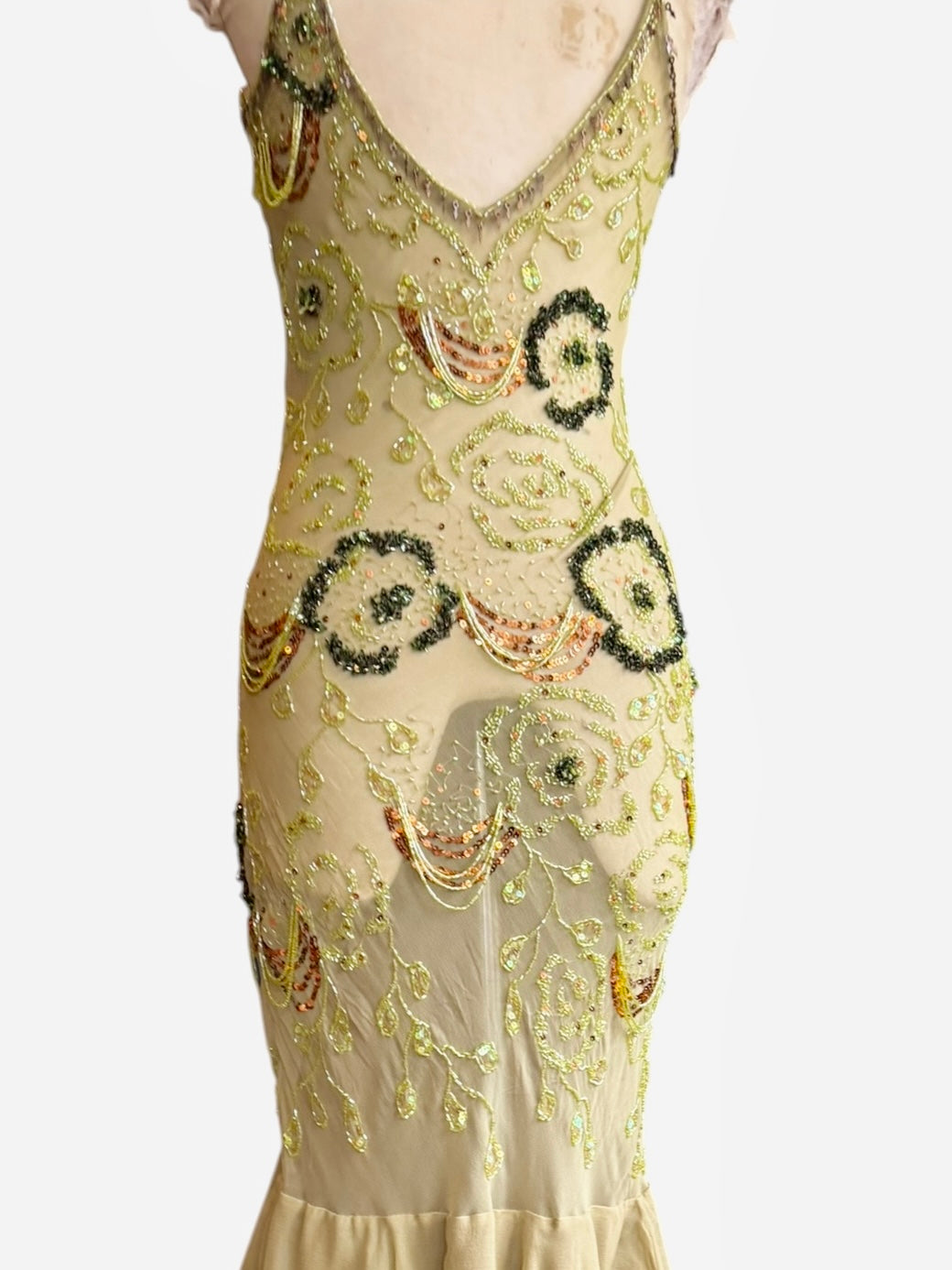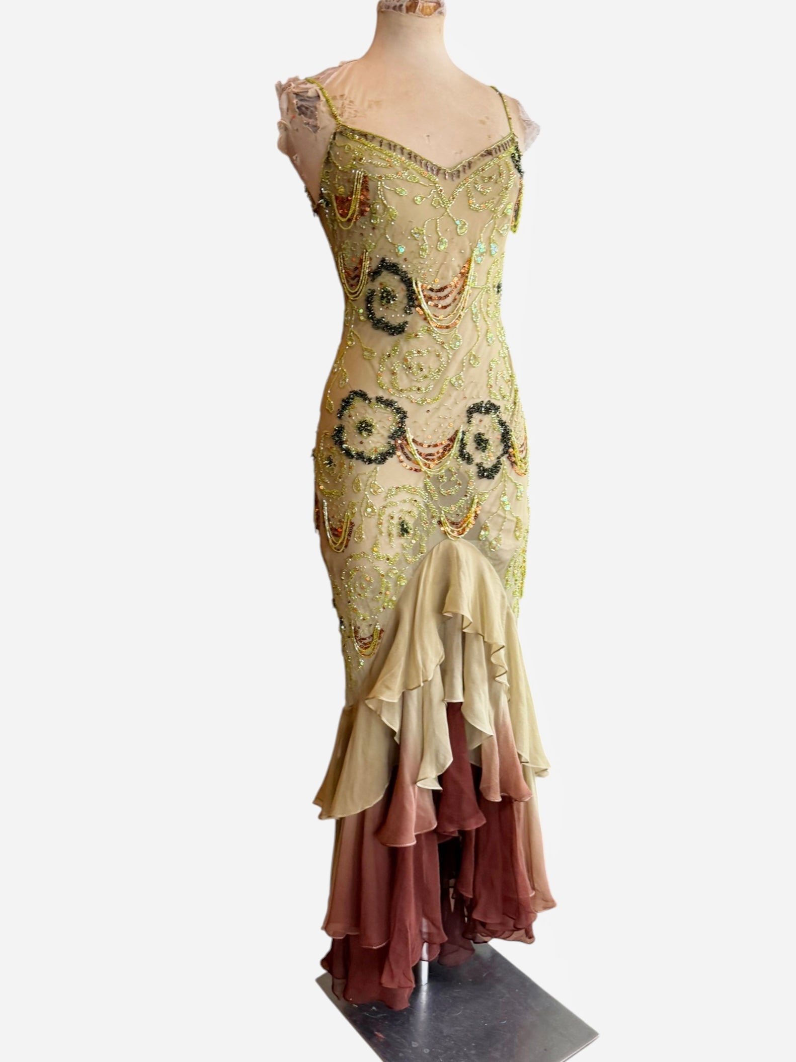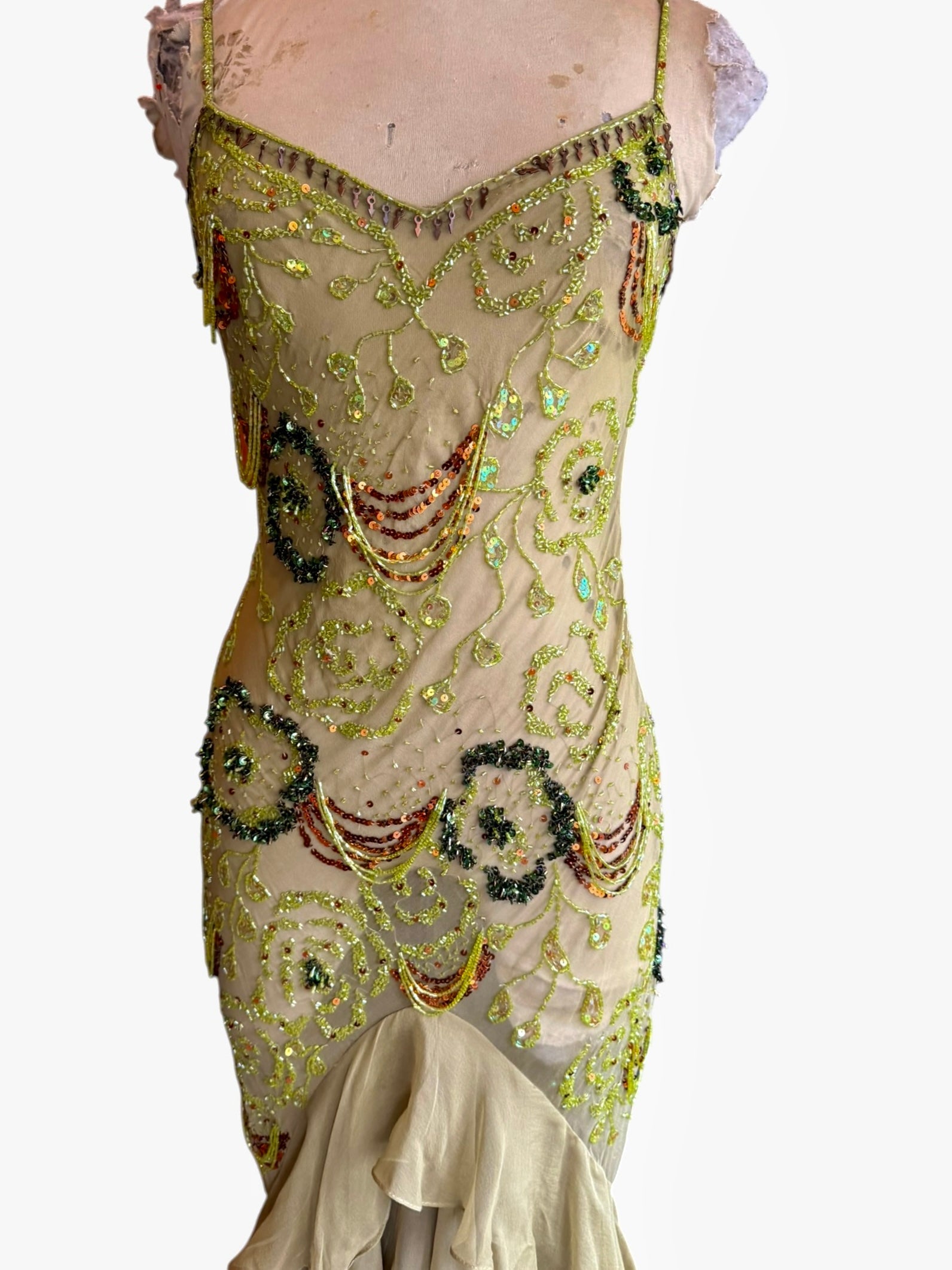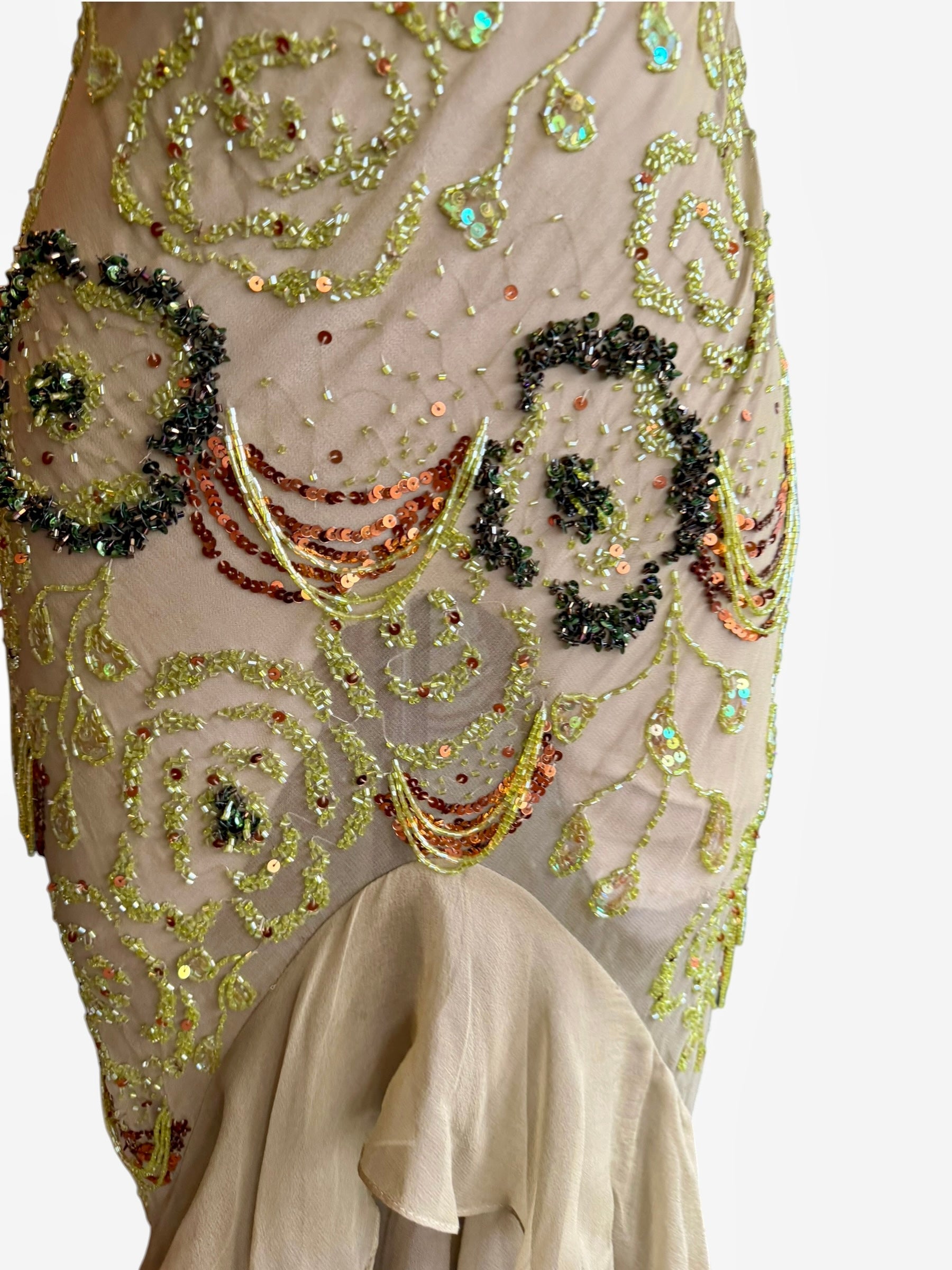 Introducing an exquisite vintage bias cut dress that embodies the artistry of hand made finishings. Crafted from the finest earthy green silk, this enchanting garment features intricate beading that dances with light in hues of greens and browns while cascading ombré frills create a captivating fishtail silhouette. An exceptional and graceful fit with a discreet side zip.