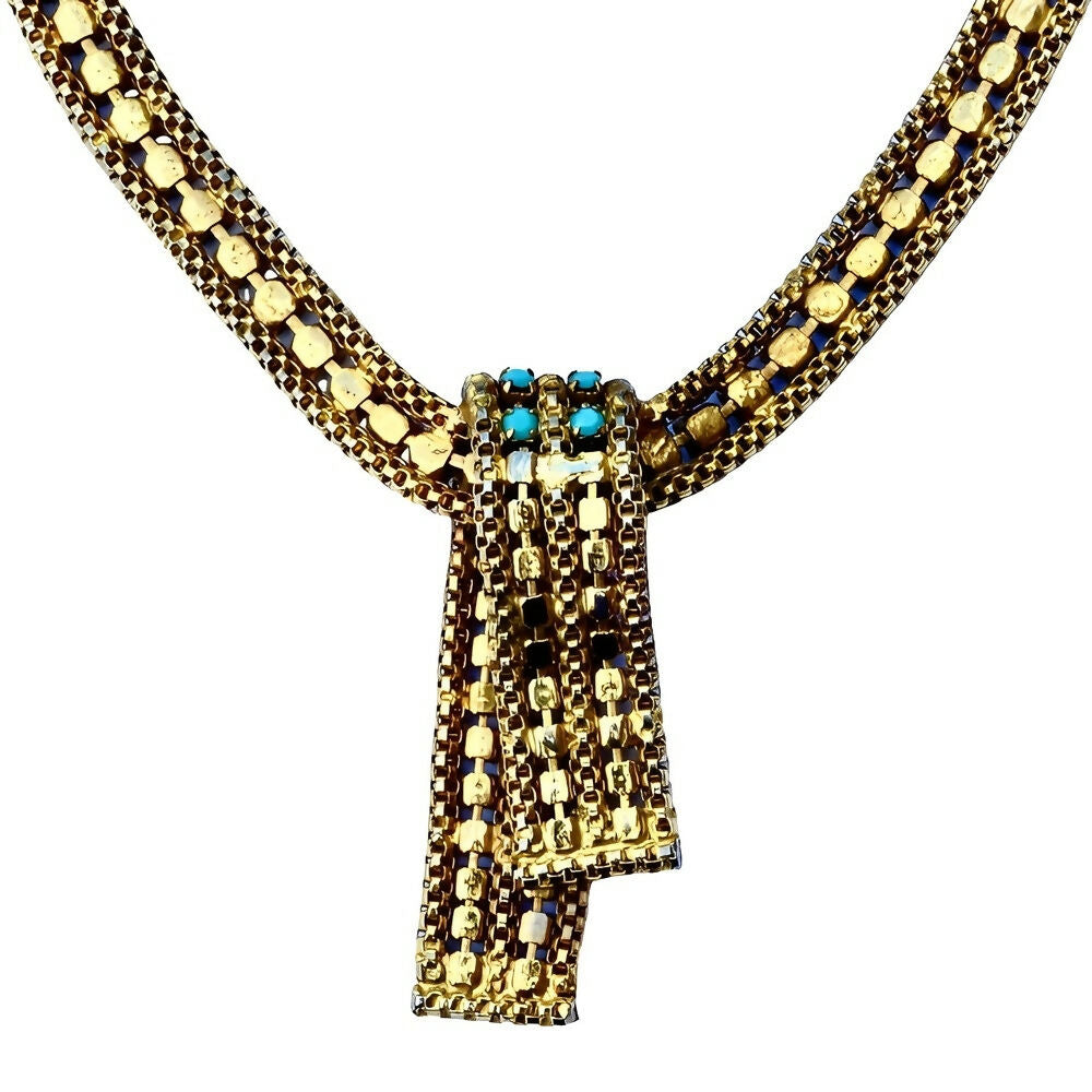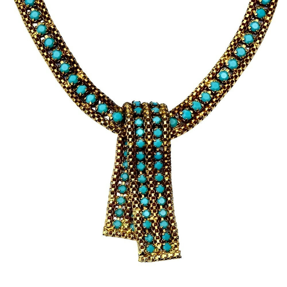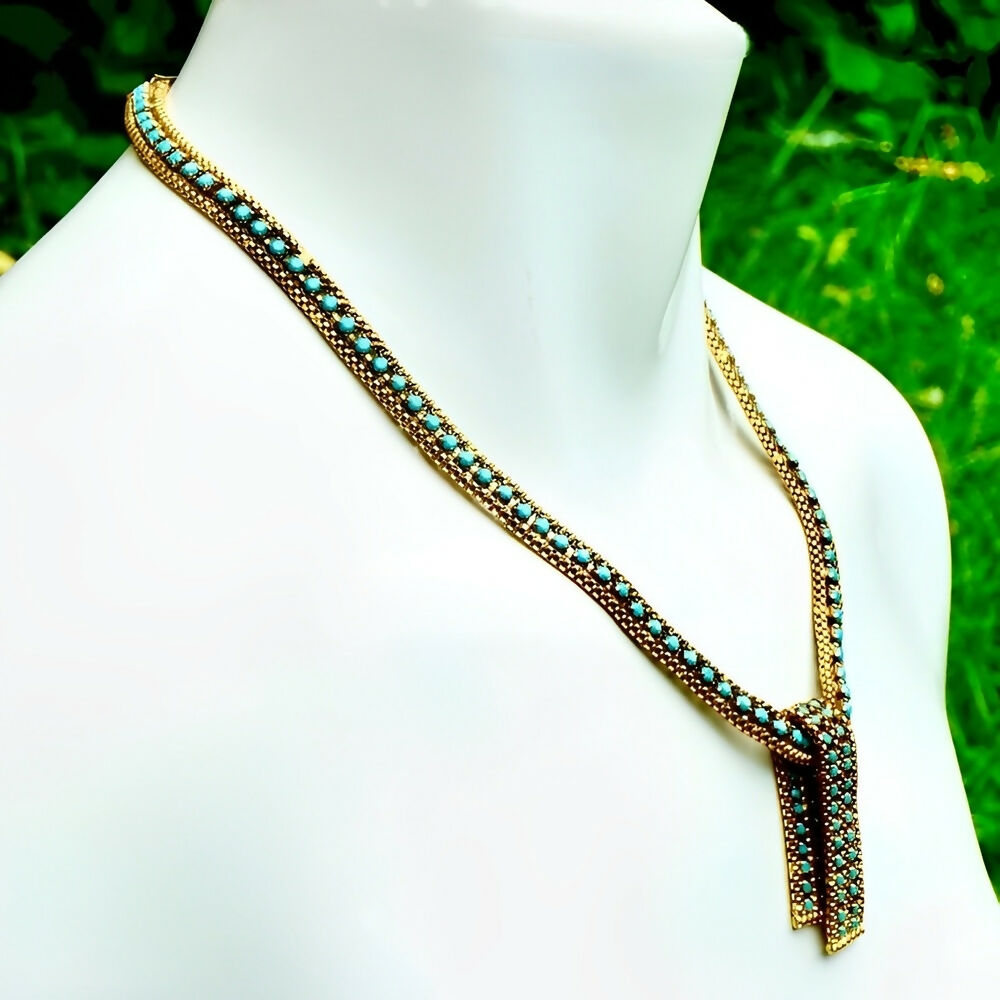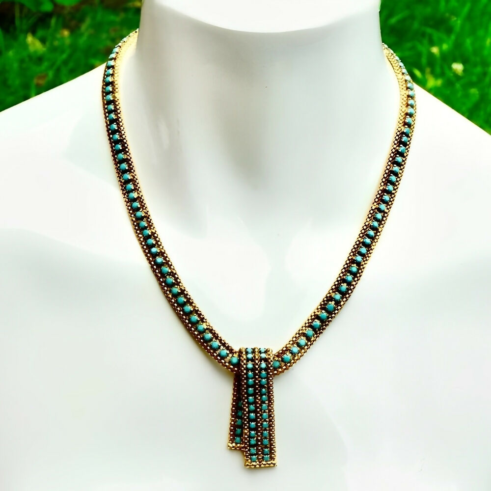 Lovely gold plated mesh necklace with faceted faux turquoise glass stones, and featuring a foldover pendant. There is wear to the gold plating.