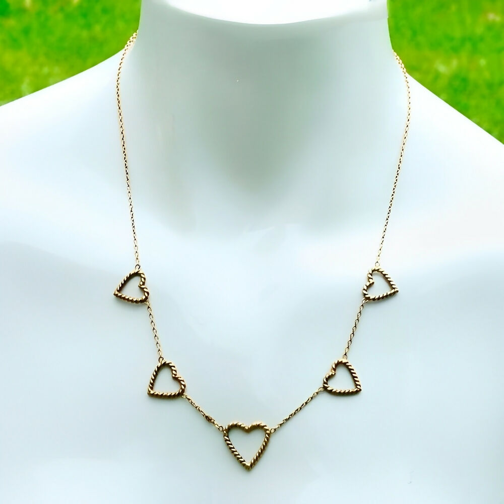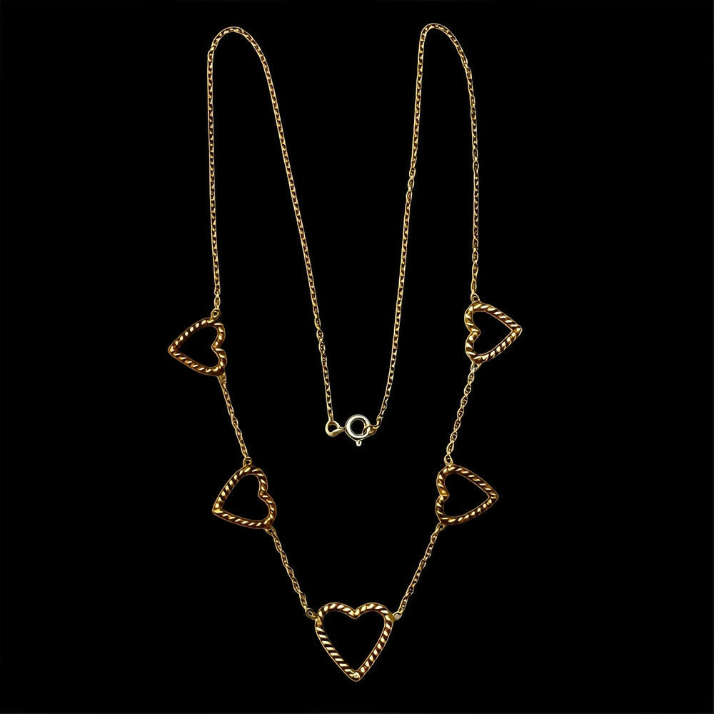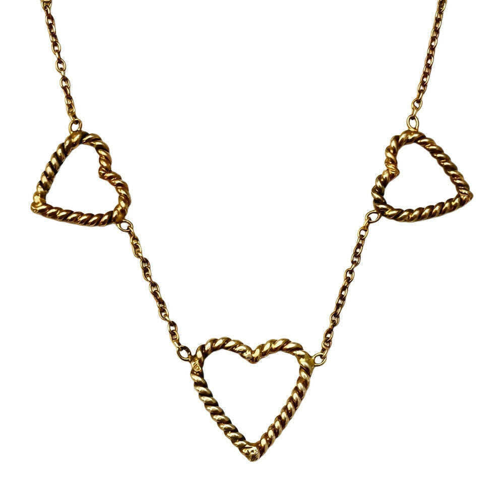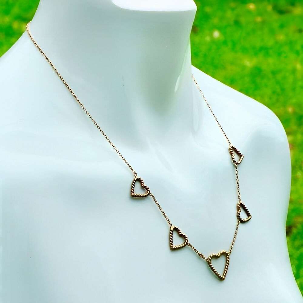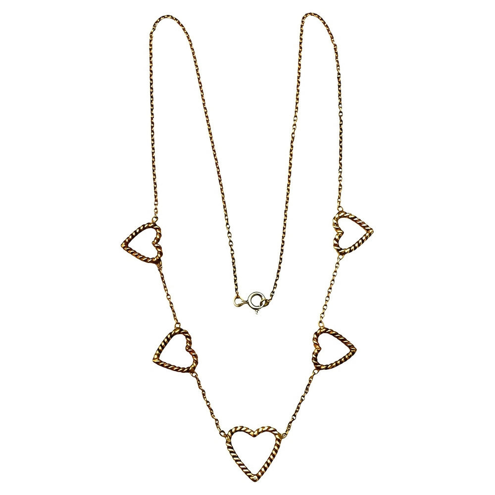 Beautiful gold plated necklace featuring five rope twist hearts. The chain links are soldered.