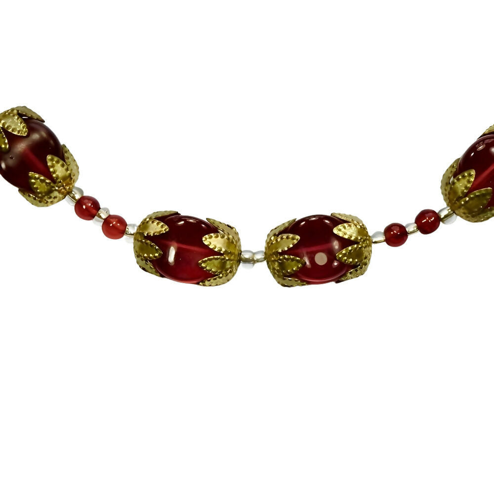 Wonderful ornate gold tone necklace, featuring red and clear glass beads. The necklace is all original and is probably Czech.