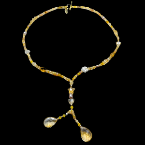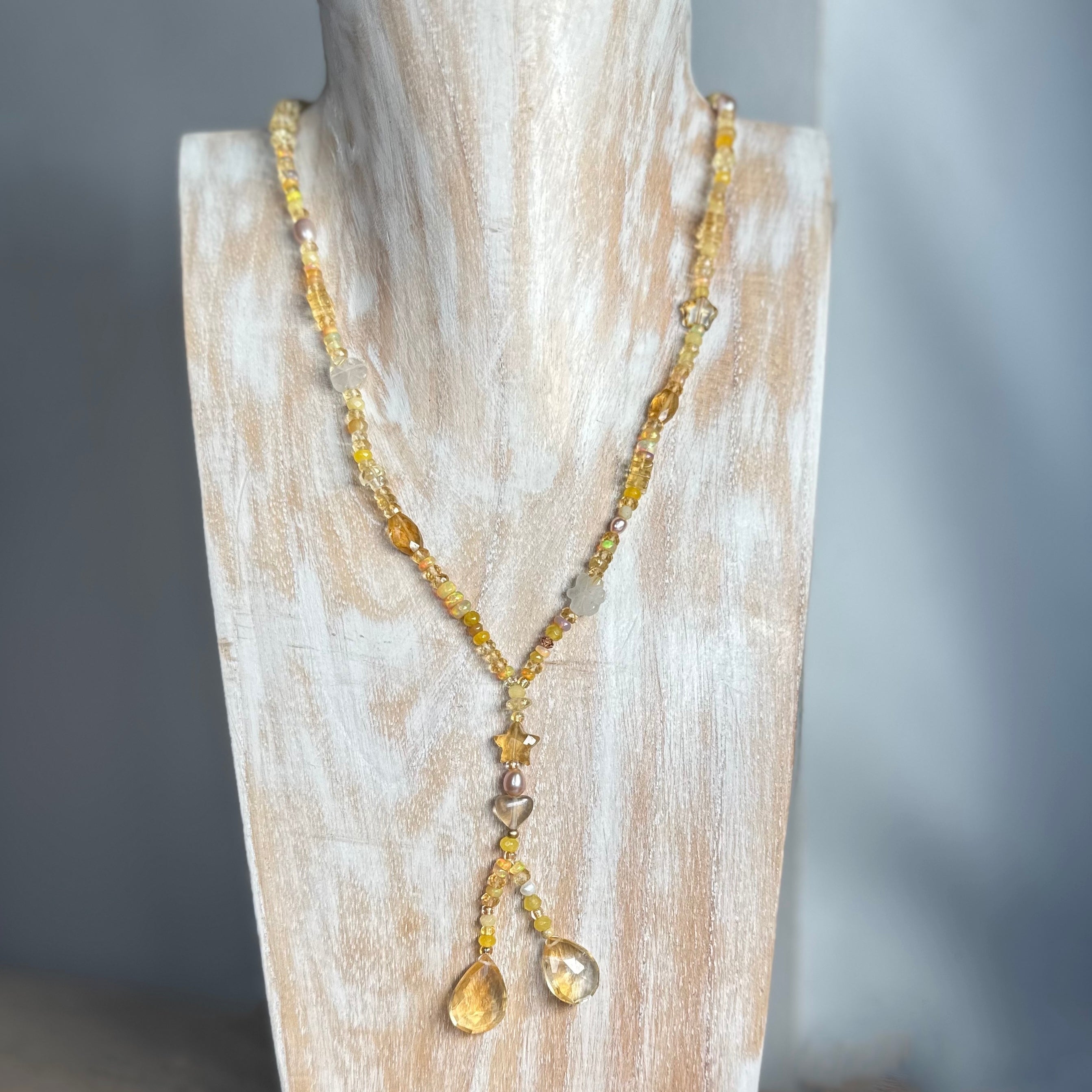 As worn by Dame Pippa Harris Producer of Call the Midwife and Empire of Light, this beautiful necklace is handmade from golden shades of Picasso glass Preciosa and Miyuki beads blended with semi precious stones including sustainably sourced citrine,  Ethiopian opal, pearls, hand carved rutile citrine flowers, stars, and pearls. It is centred by two stunning hand cut faceted golden quartz briolettes and has a heart shaped toggle clasp.