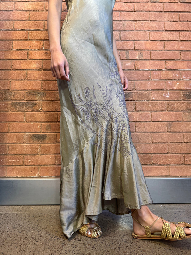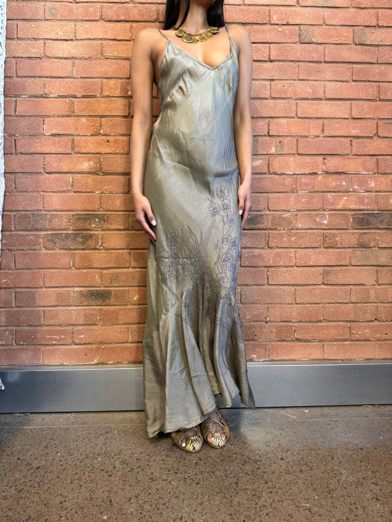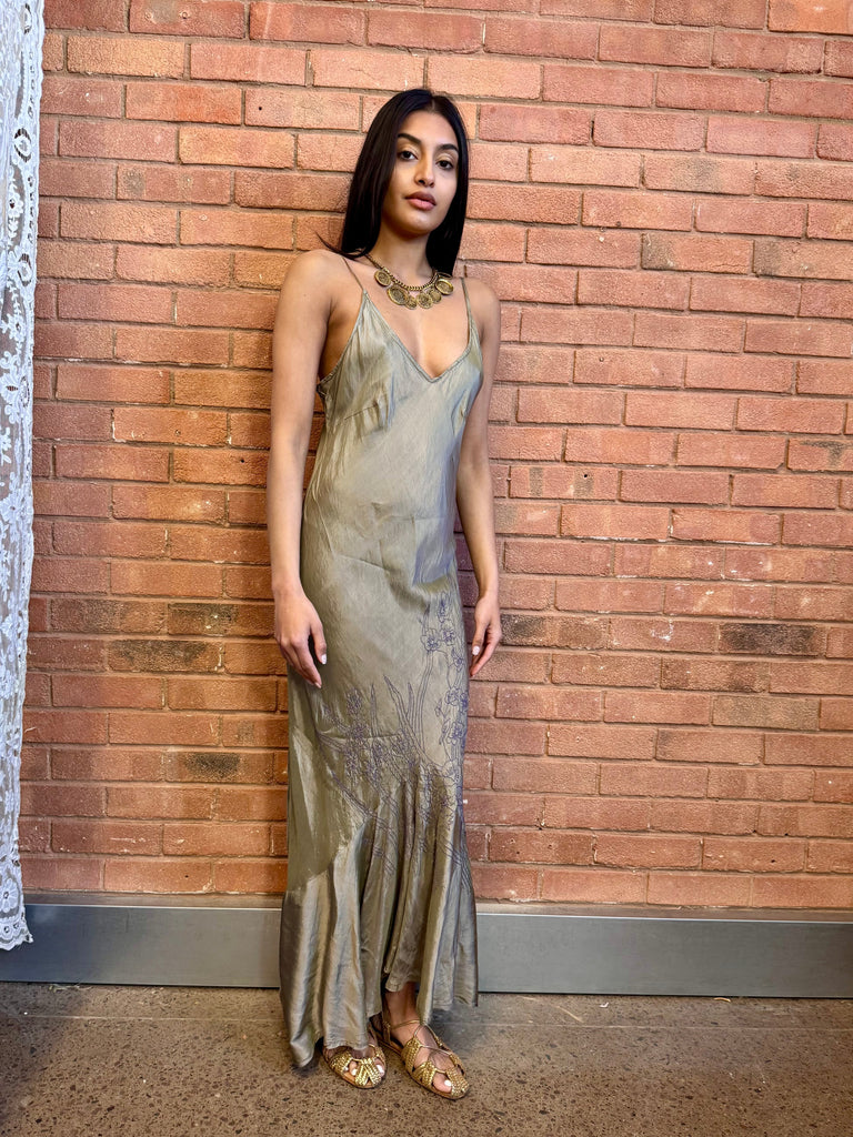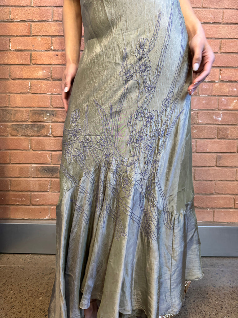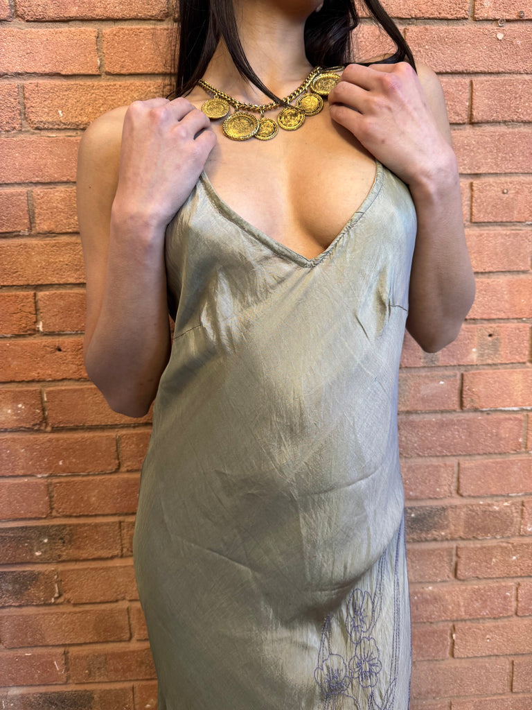 Expertly crafted for a Y2K aesthetic, the Goldie dress features a bias cut with delicate straps and a unique asymmetric hem. The stunning silver green color is accentuated by beautiful hand embroidery, creating a perfect summer dress for any occasion.