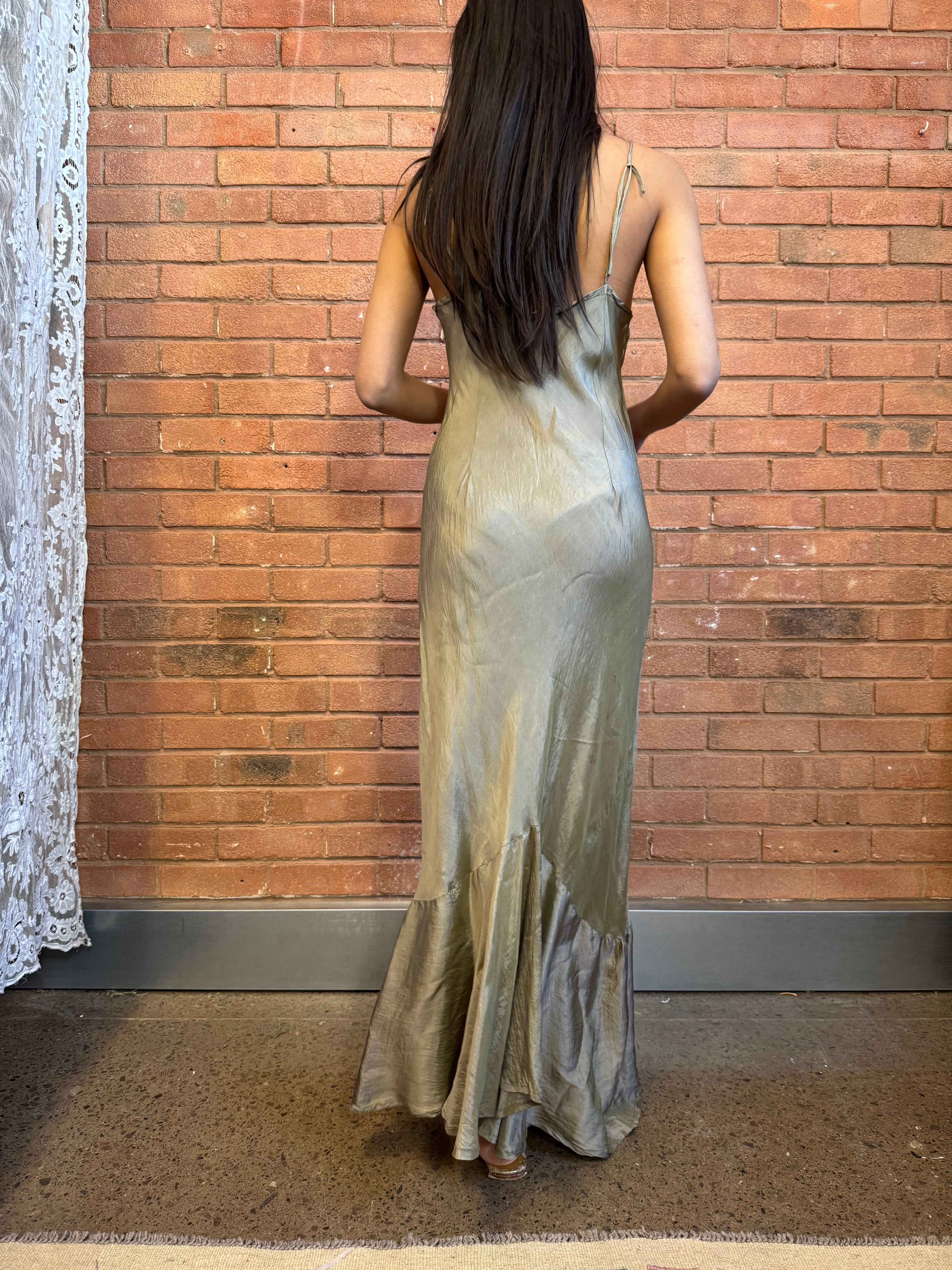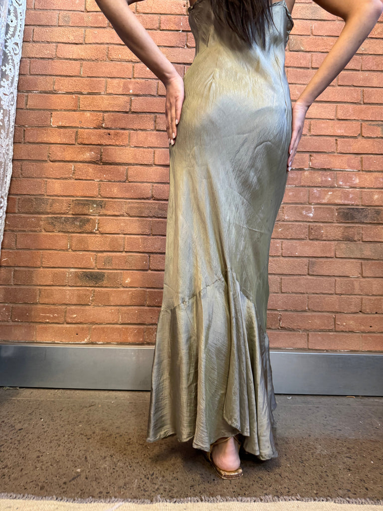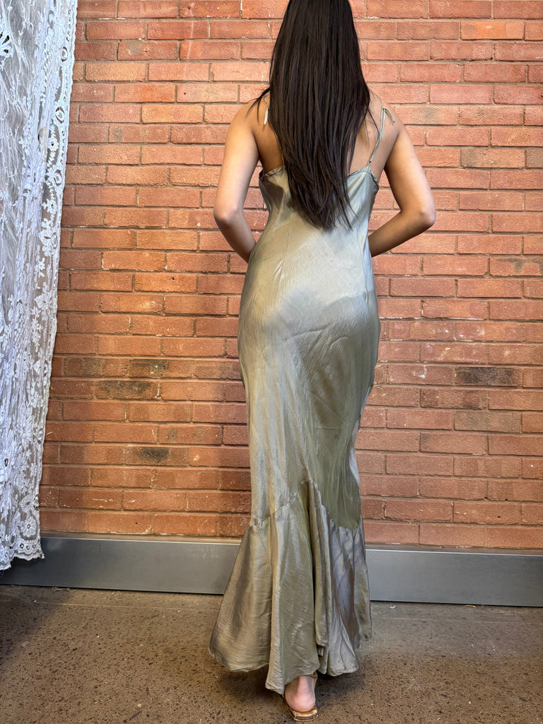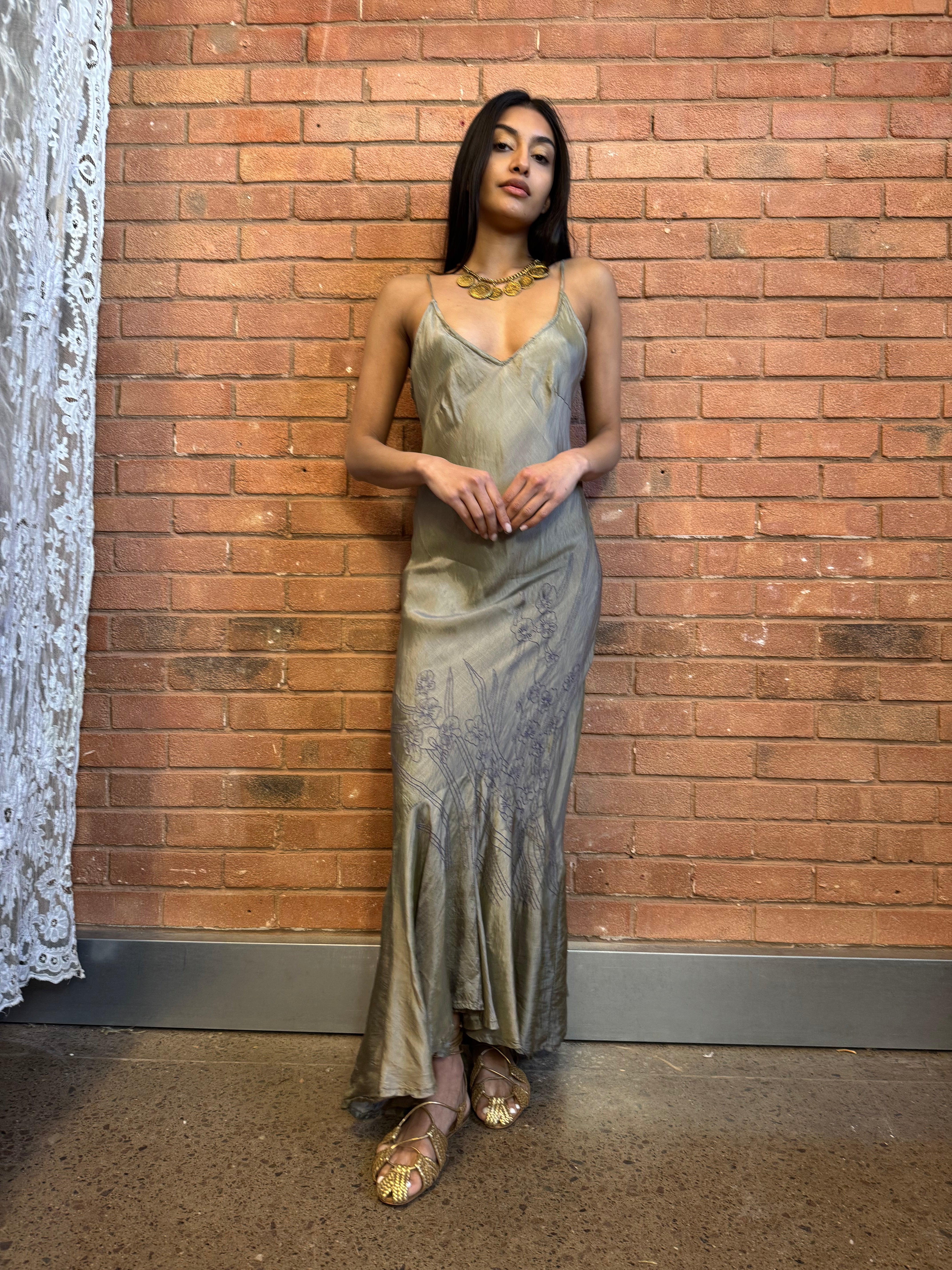 Expertly crafted for a Y2K aesthetic, the Goldie dress features a bias cut with delicate straps and a unique asymmetric hem. The stunning silver green color is accentuated by beautiful hand embroidery, creating a perfect summer dress for any occasion.
