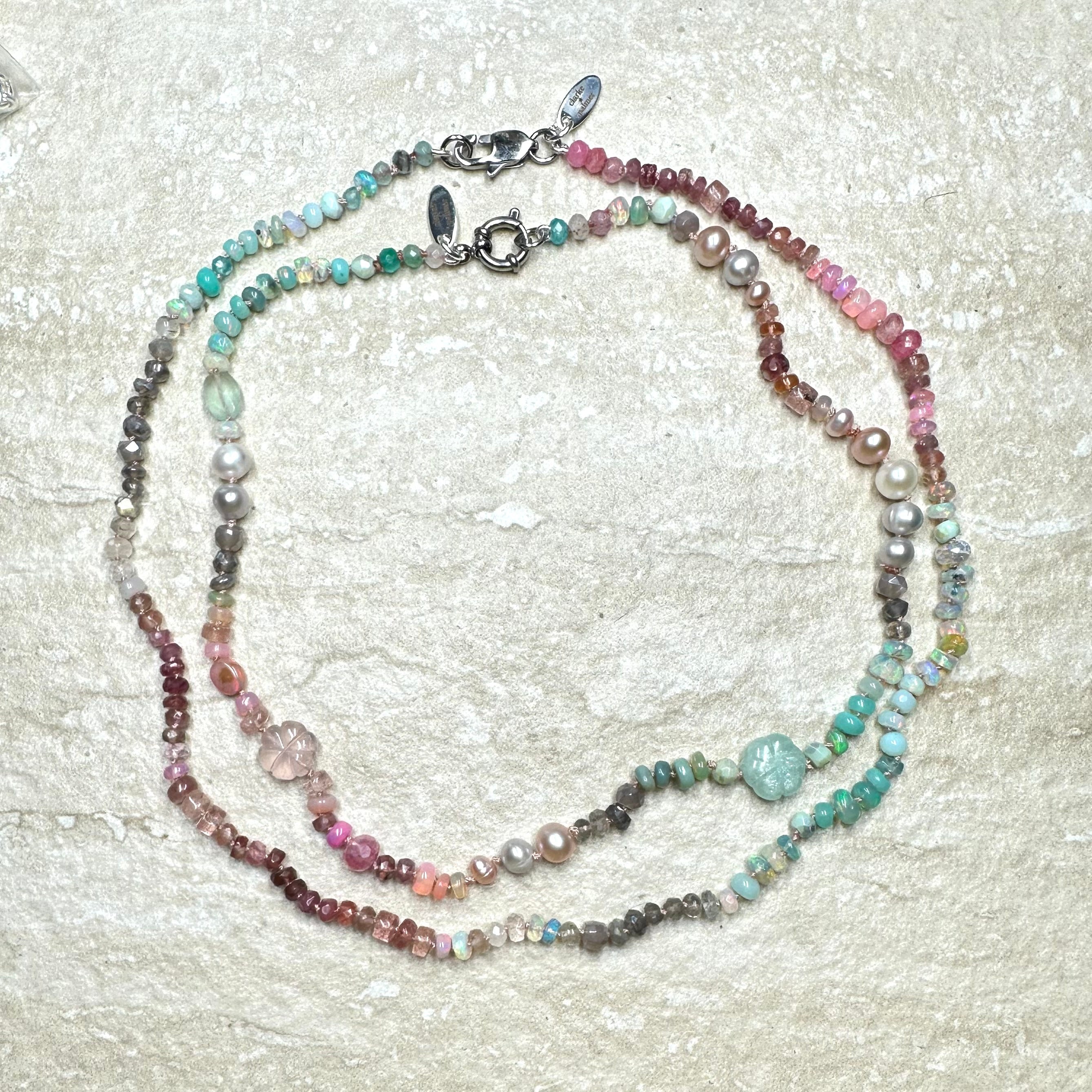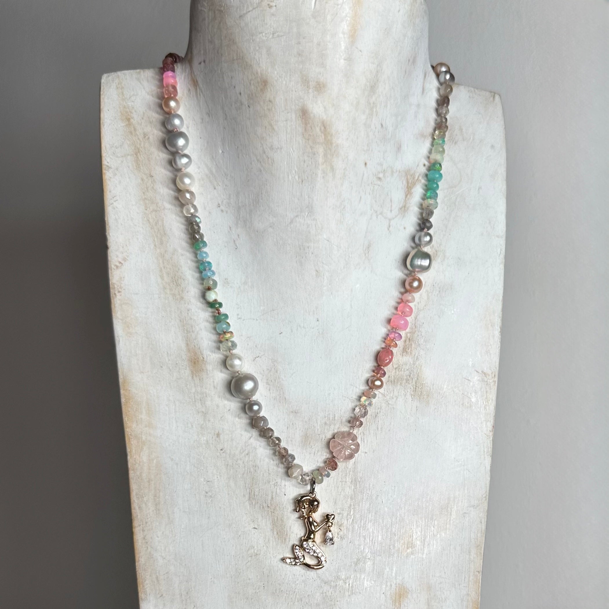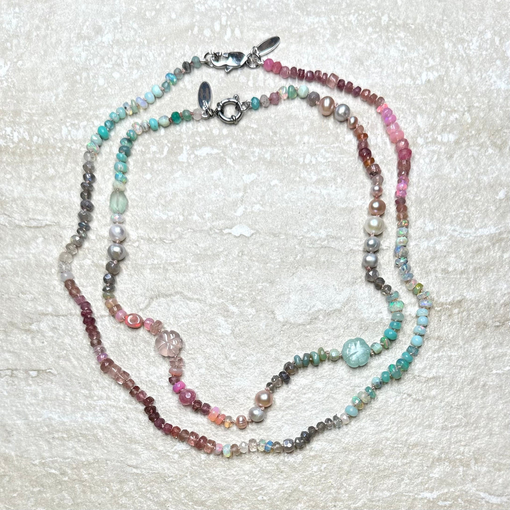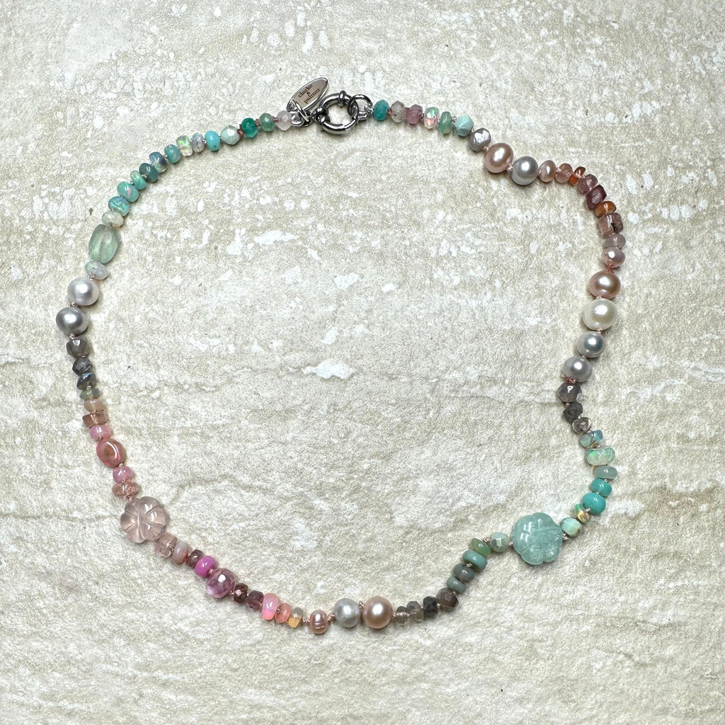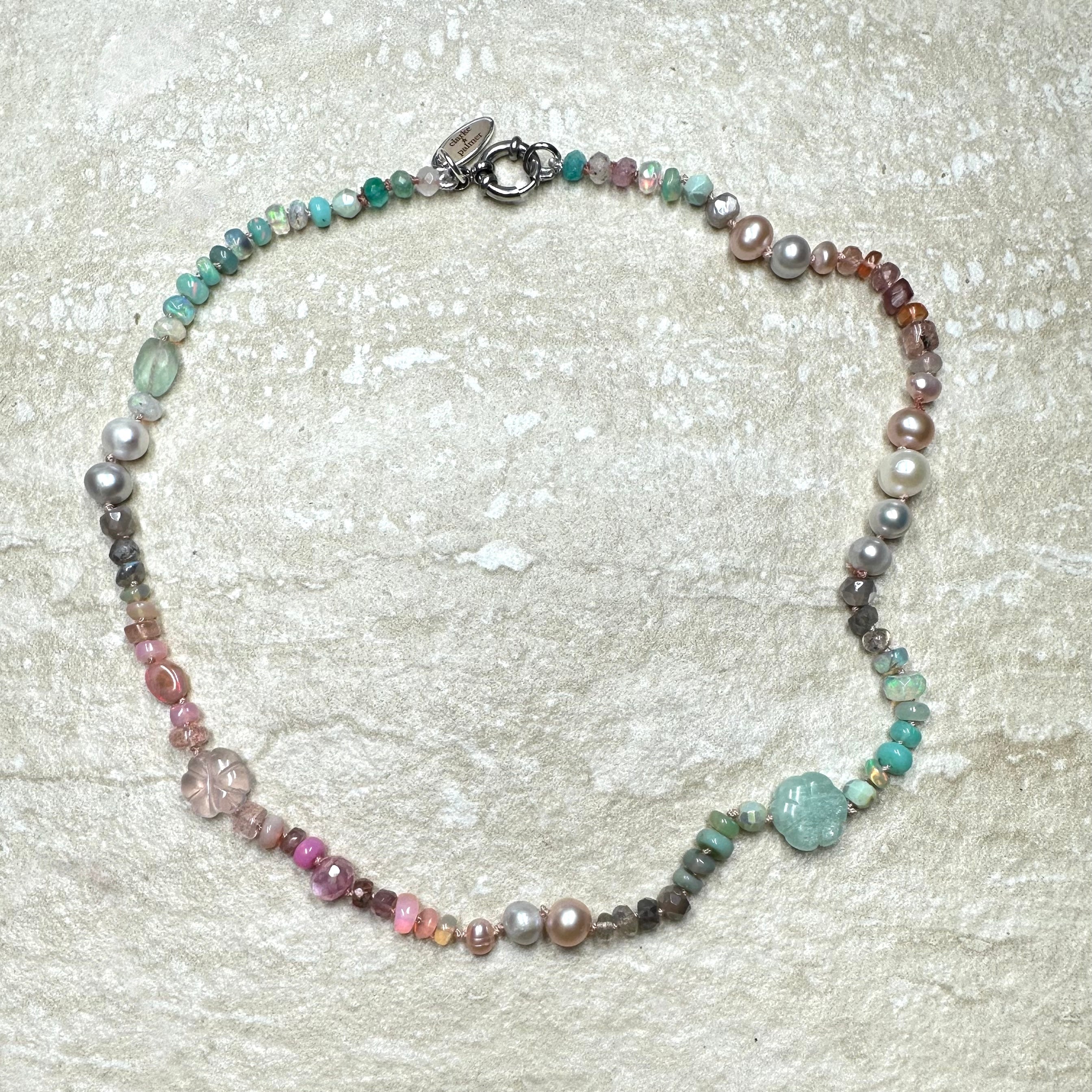 As worn by the fabulous jewellery influencer @sparkleyayi this beautiful necklace blends ivory, blush, rose, duck egg, aqua, silver and grey shades of moonstone, rose Quartz, andesine, opal, aquamarine, labradorite and pearl. It also features a hand carved rose quartz flowers and a sailor clasp in either silver or 22kt gold vermeil.