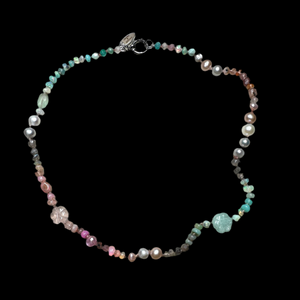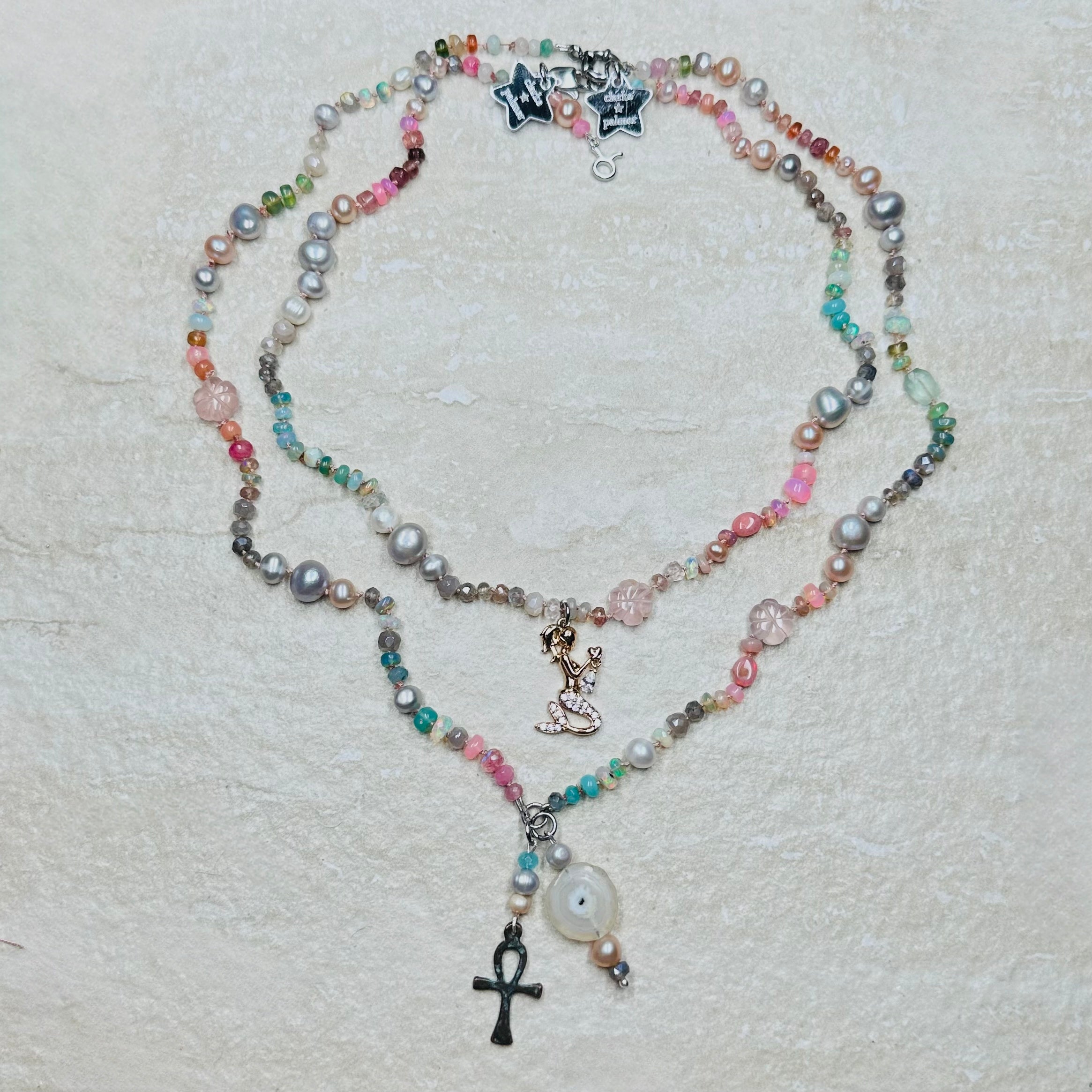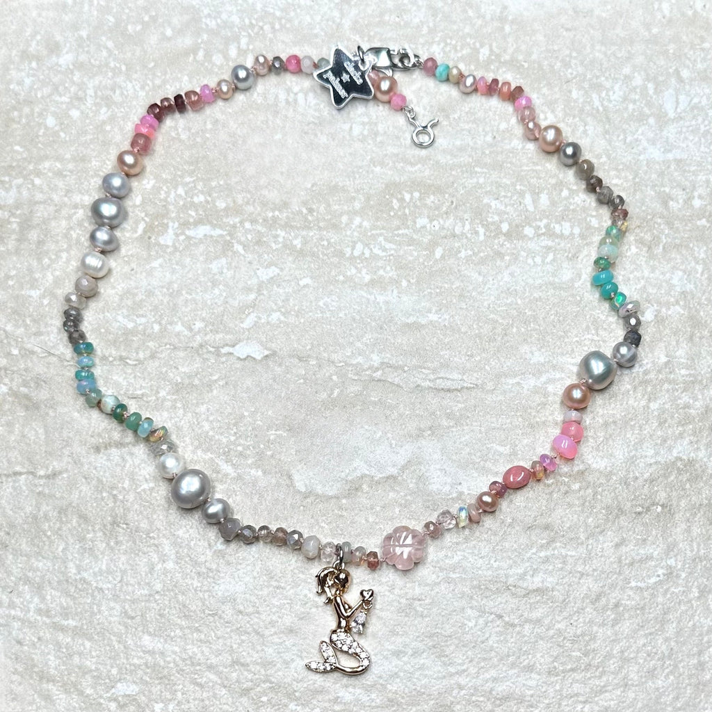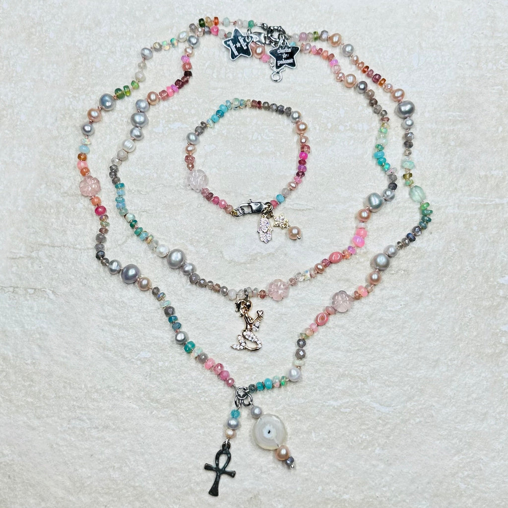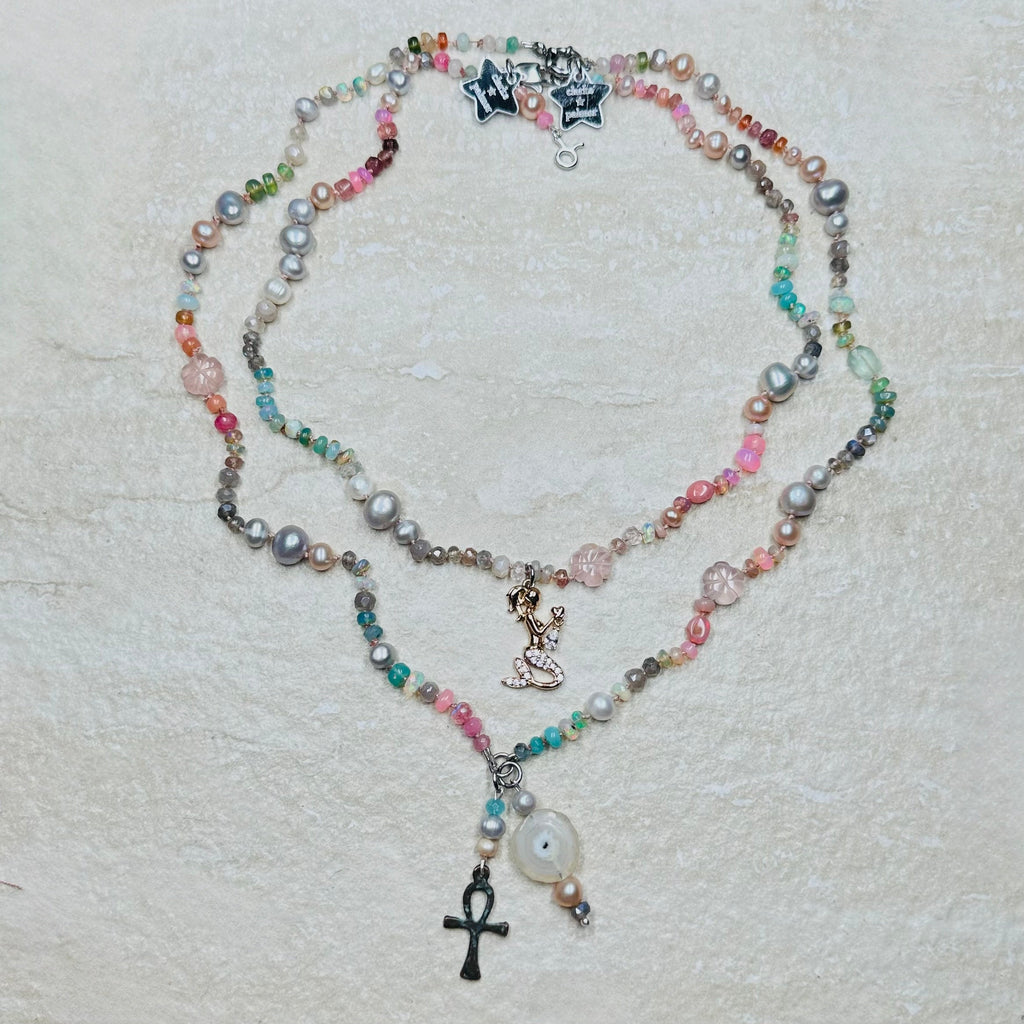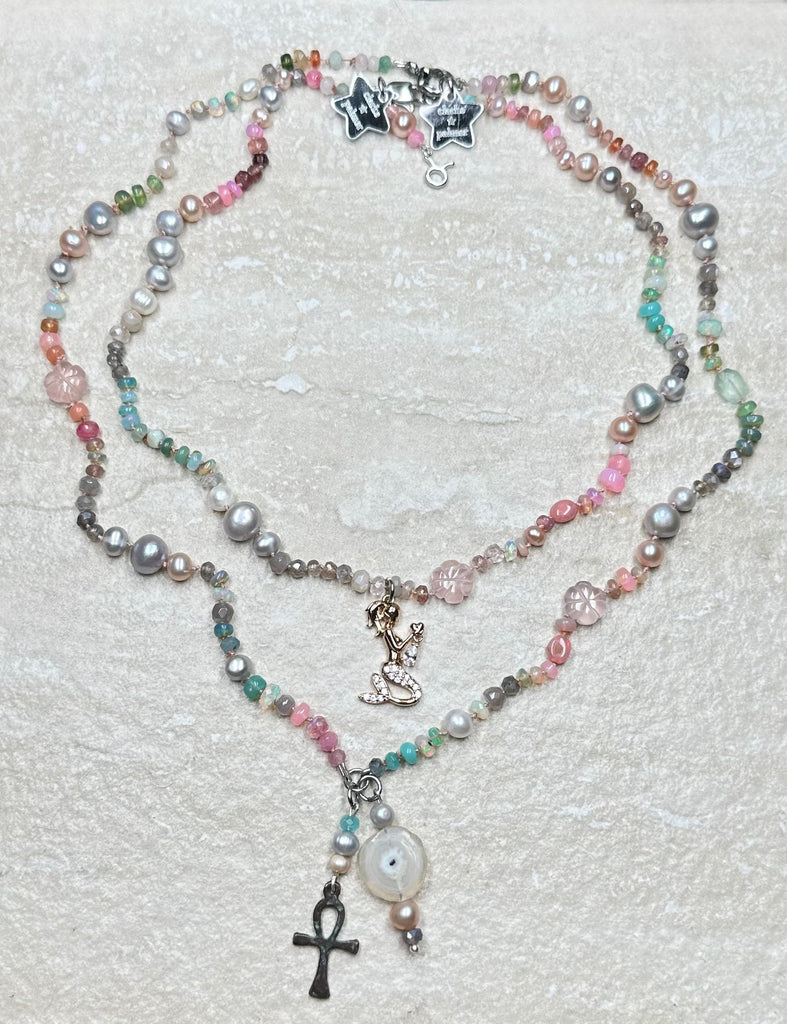 As worn by the fabulous jewellery influencer @sparkleyayi this beautiful necklace blends ivory, blush, rose, duck egg, aqua, silver and grey shades of moonstone, rose Quartz, andesine, opal, aquamarine, labradorite and pearl. It also features a hand carved rose quartz flowers and a sailor clasp in either silver or 22kt gold vermeil.