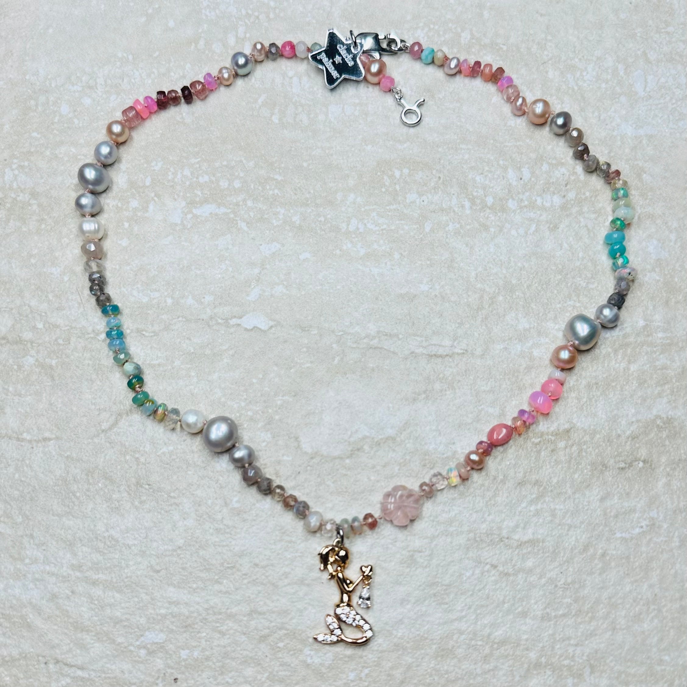 Our Heavenly Love Charm necklace is hand knotted onto dusty pink silk thread with your choice of charm. Pictured with Mermaid CZ 22kt gold vermeil pendant charm.