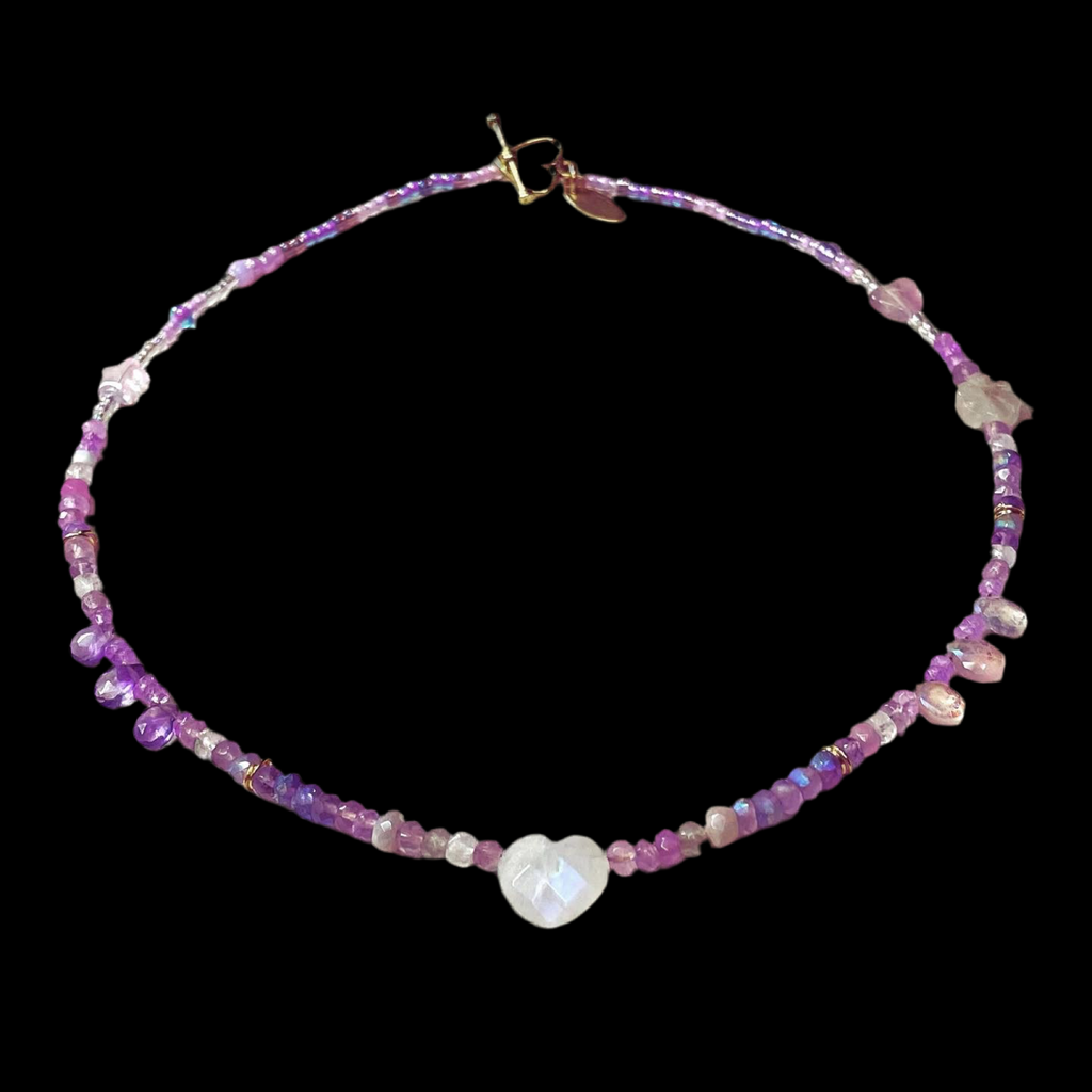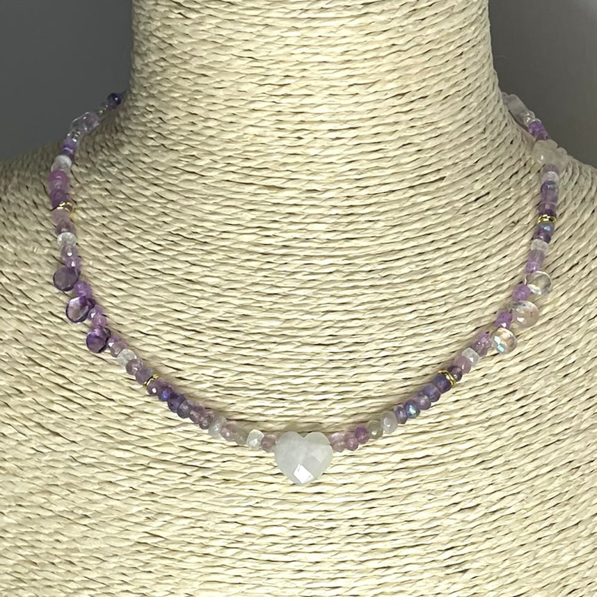 In ethereal, iridescent and glimmering lilac amethyst, violet opal, pearl, quartz and rainbow moonstone this heart necklace forms the centre of our Holiday Magic collection. These stones help balance the crown chakra situated at the top of our heads. The seventh and highest of the main chakras is perfect for representing this special time of year. When your crown chakra is balanced, your energy is feeling cleansed and your connection to the divine within you is very clear. These crystals can help you feel more spiritually aware and creatively inspired towards the positive in life. Check our Chakra Balance page for more information.