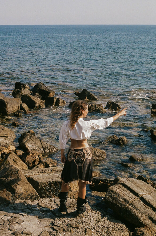This vintage pure silk midi skirt, sourced in Florence, features a soft pink silk base layered with a dramatic black sheer overlay. Detailed with intricate pure cotton embroidery, lace appliqué, and a scalloped hem, it blends Italian craftsmanship with bohemian elegance. A one-of-a-kind sustainable luxury piece, perfect for festivals, summer evenings, or statement styling.
