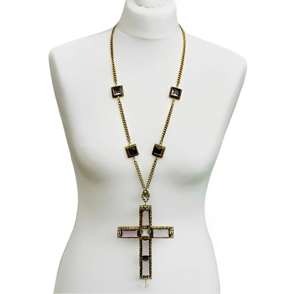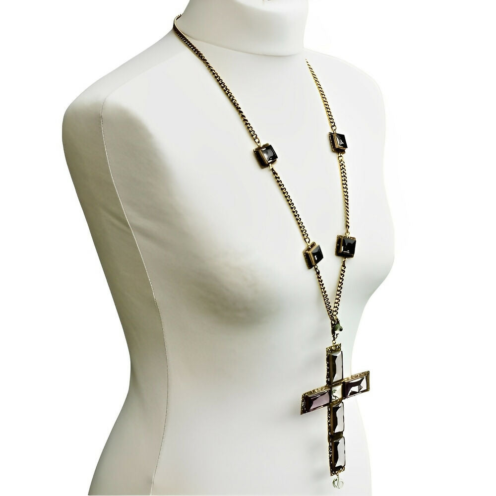Superb Joseff of Hollywood large cross pendant and necklace, with the Joseff Russian gold plated antique finish. The cross is attached to the chain with an ornate link set with a clear cabochon crystal. The necklace has a ring bolt clasp which is stiff but works.