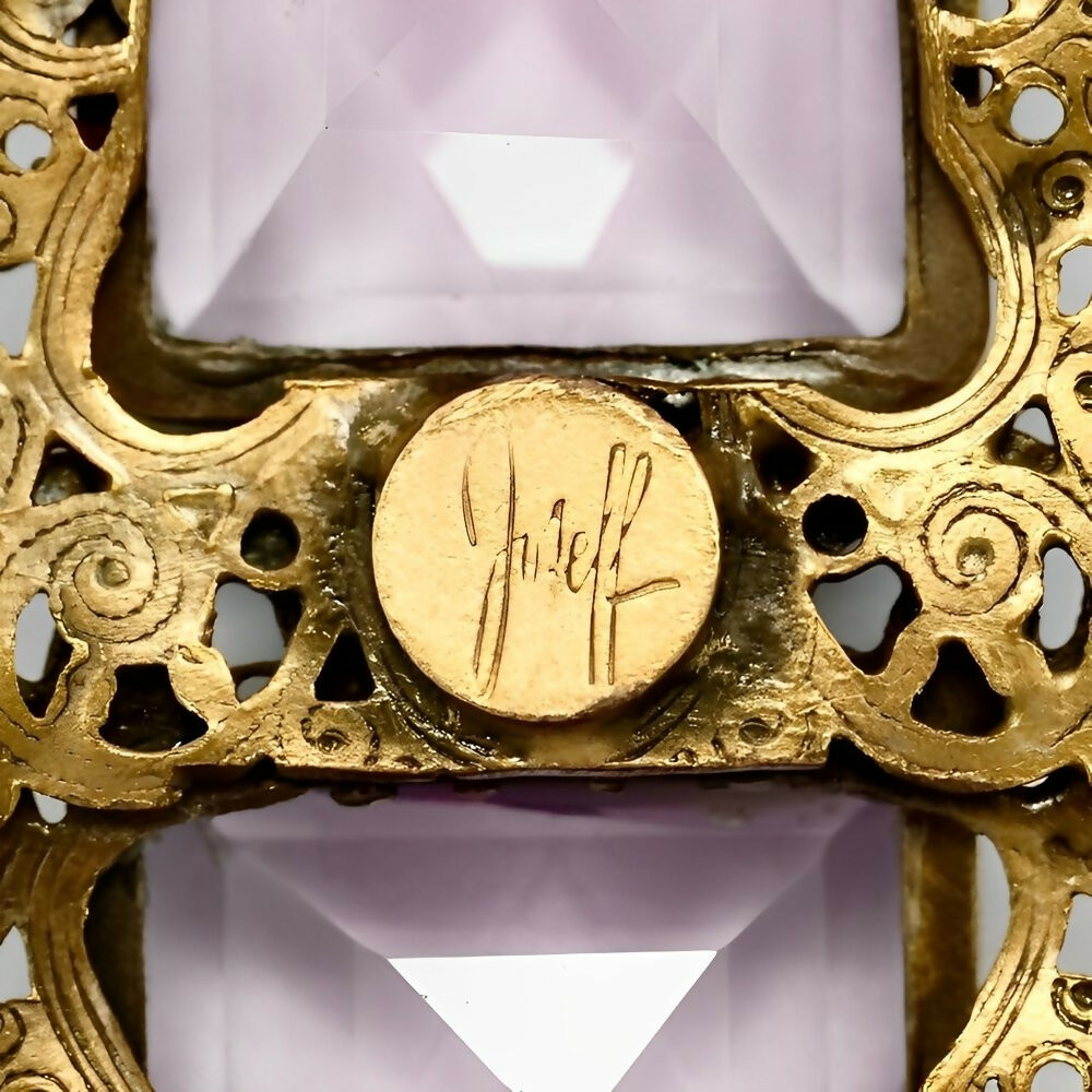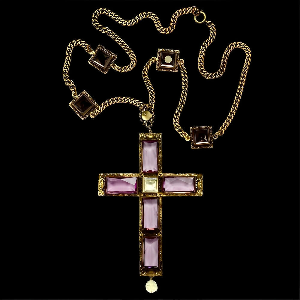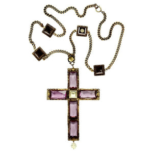 The cross has a lovely filigree design, and is set with five brilliant mauve rectangular faceted crystals, a smaller square clear faceted crystal, and finishes with a round clear faceted crystal. There are some minor chips to the crystals.