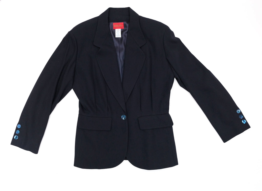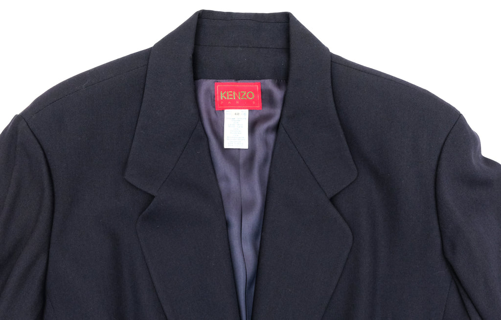 A classy tailored 1990s vintage skirt suit by Kenzo, in dark navy wool mix.