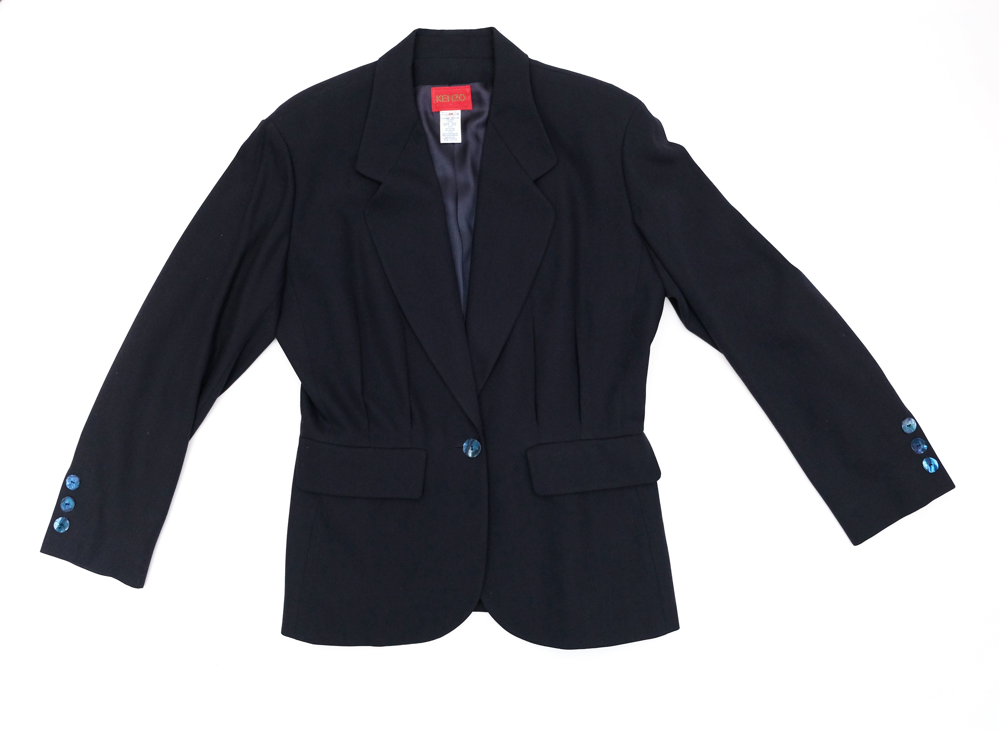 The jacket has lightly padded shoulders, notched lapels and soft pleats giving shape front & back.  Single blue nacre button and flapped pockets at the waist.