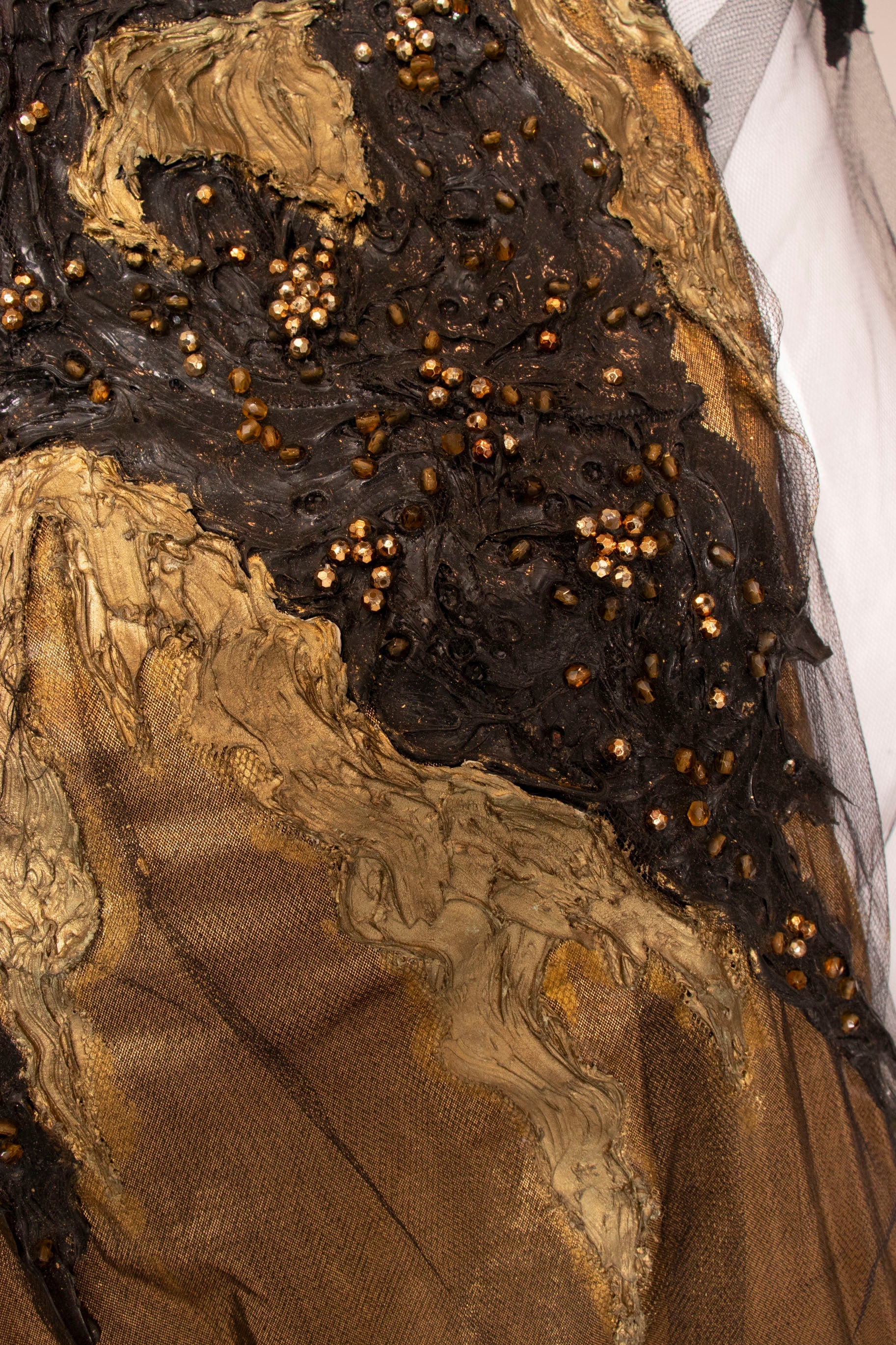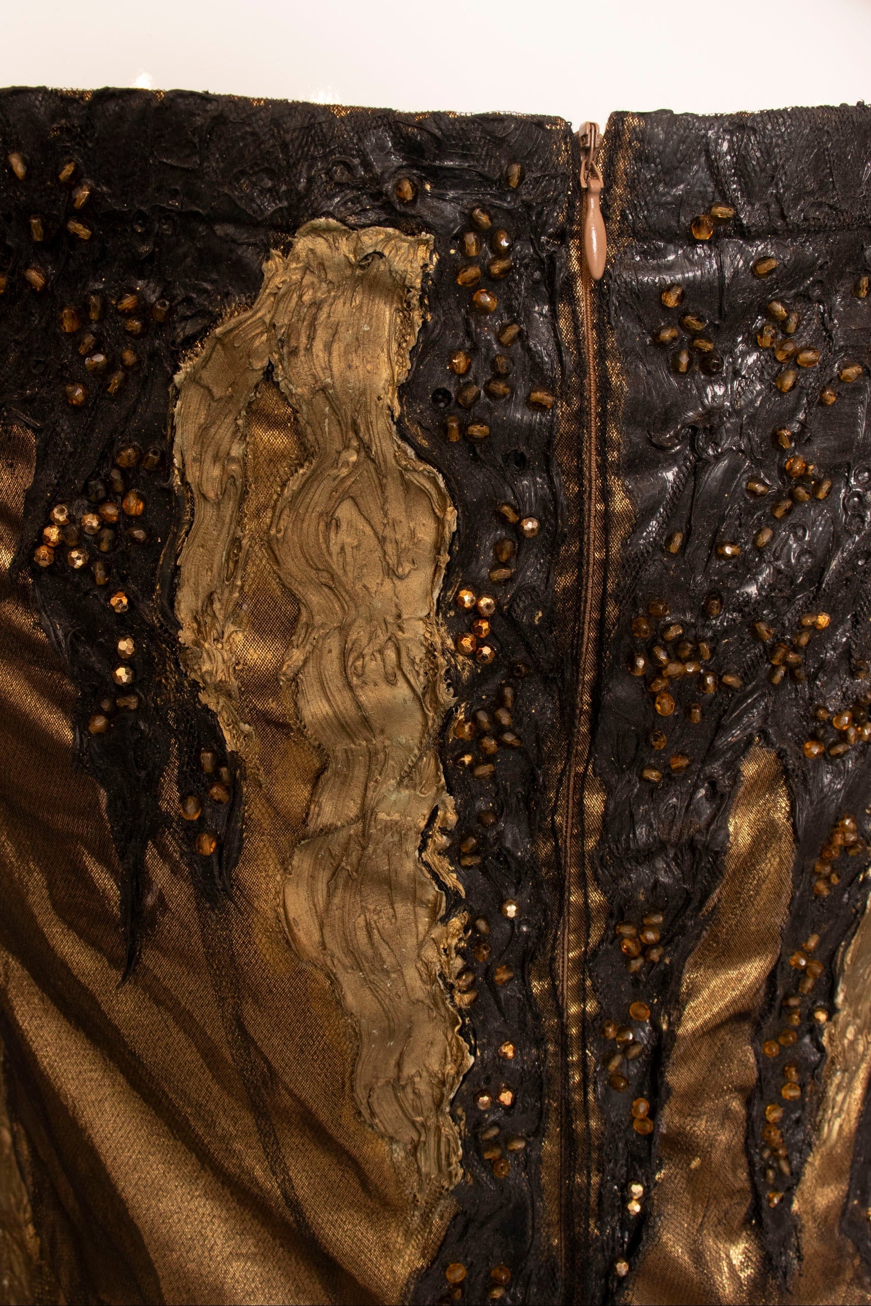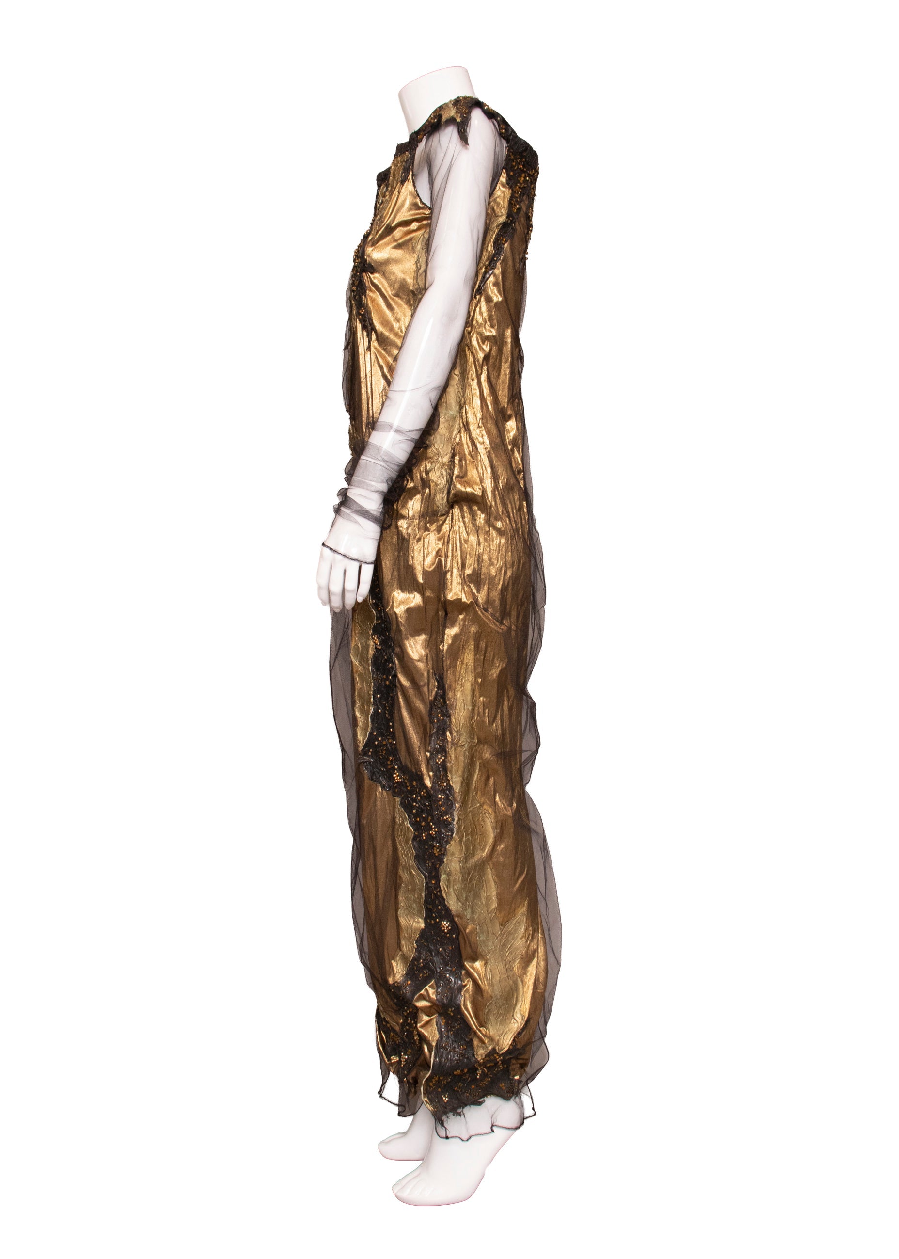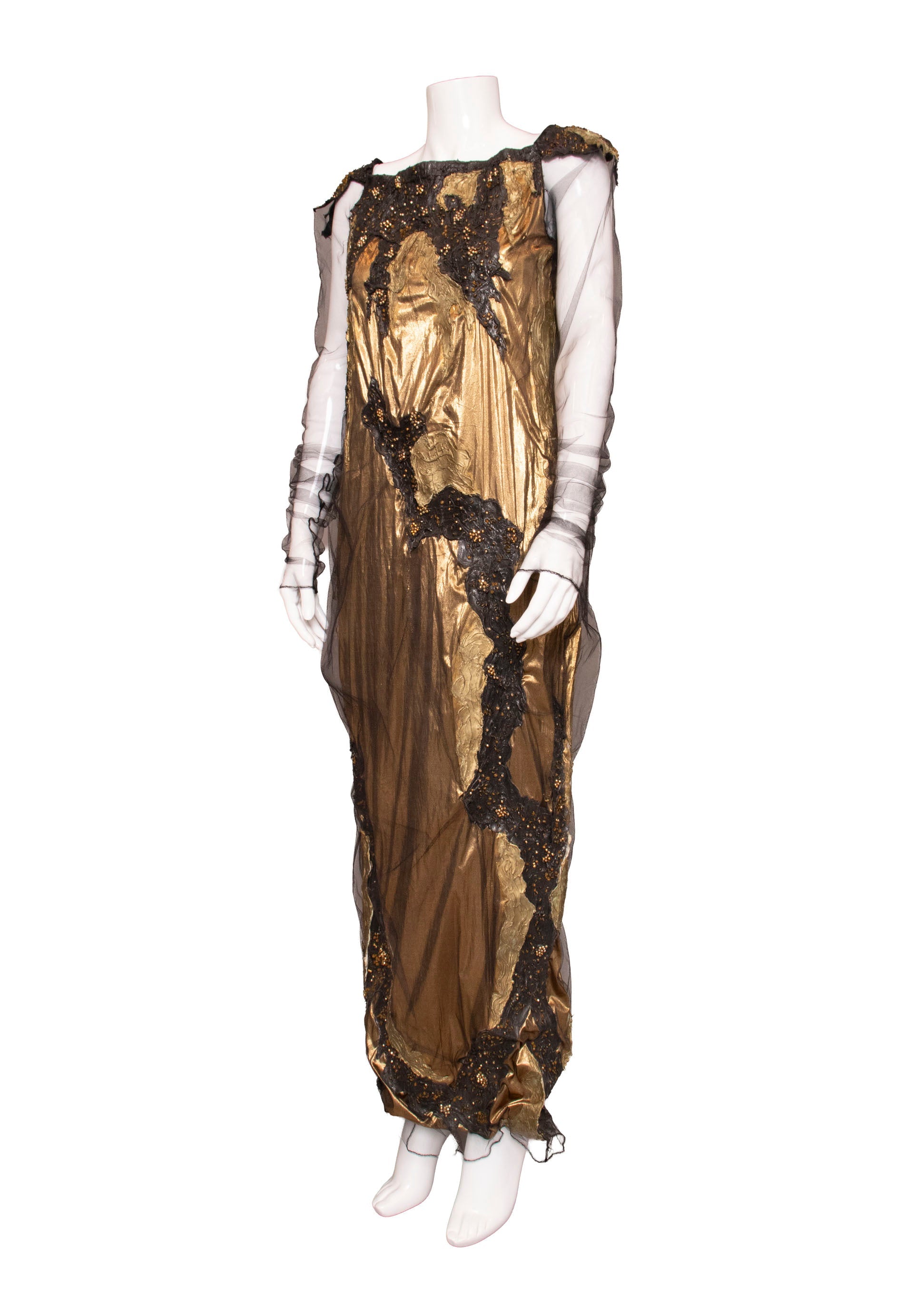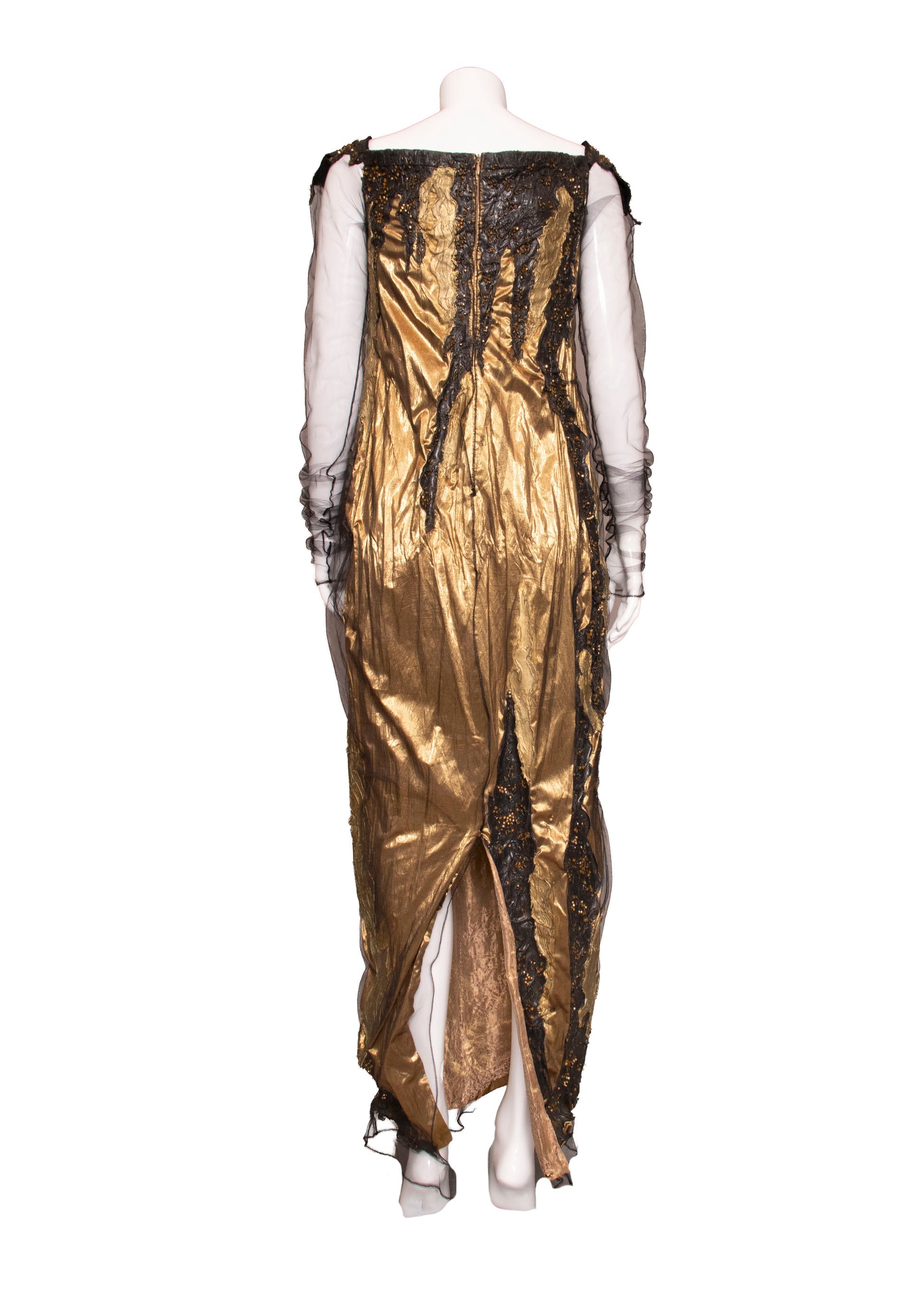This one-of-a-kind Krizia piece showcases bold artistry with its shimmering gold lamé foundation layered beneath delicate black mesh. The dress features striking hand-painted abstract details in black and metallic tones, complemented by faux faceted beads that catch the light beautifully. Elastic shoulder accents frame a refined square neckline, while sheer mesh sleeves add an ethereal quality. Every element—from the rubberized paint strokes to the intricate beadwork—demonstrates the meticulous craftsmanship that makes this an unforgettable statement piece.