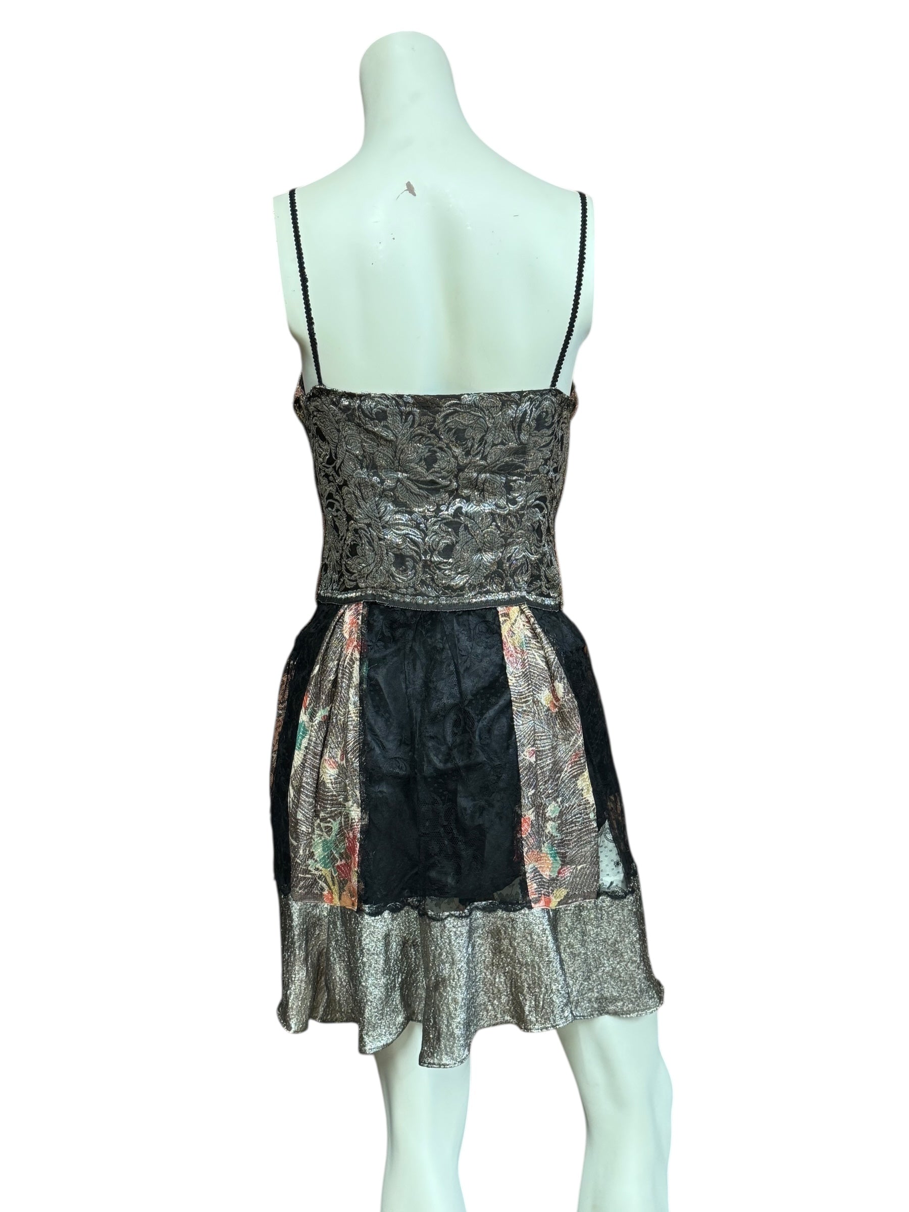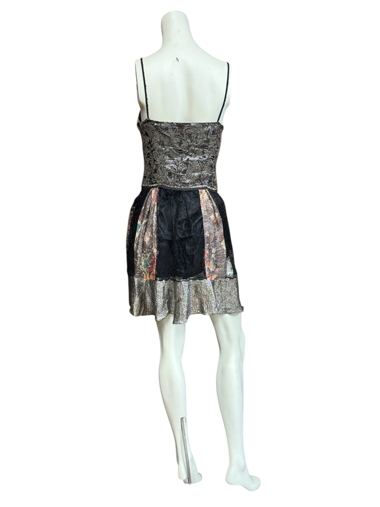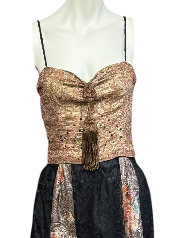 The perfect blend of vintage and modern allure. This reworked 20s piece features an Oriental silver and pink bust, paired with a black lace and floral lame skirt. The snug back zip, Edwardian bronze tassel, and gold straps add an elegant touch. Fully lined and versatile for any occasion.