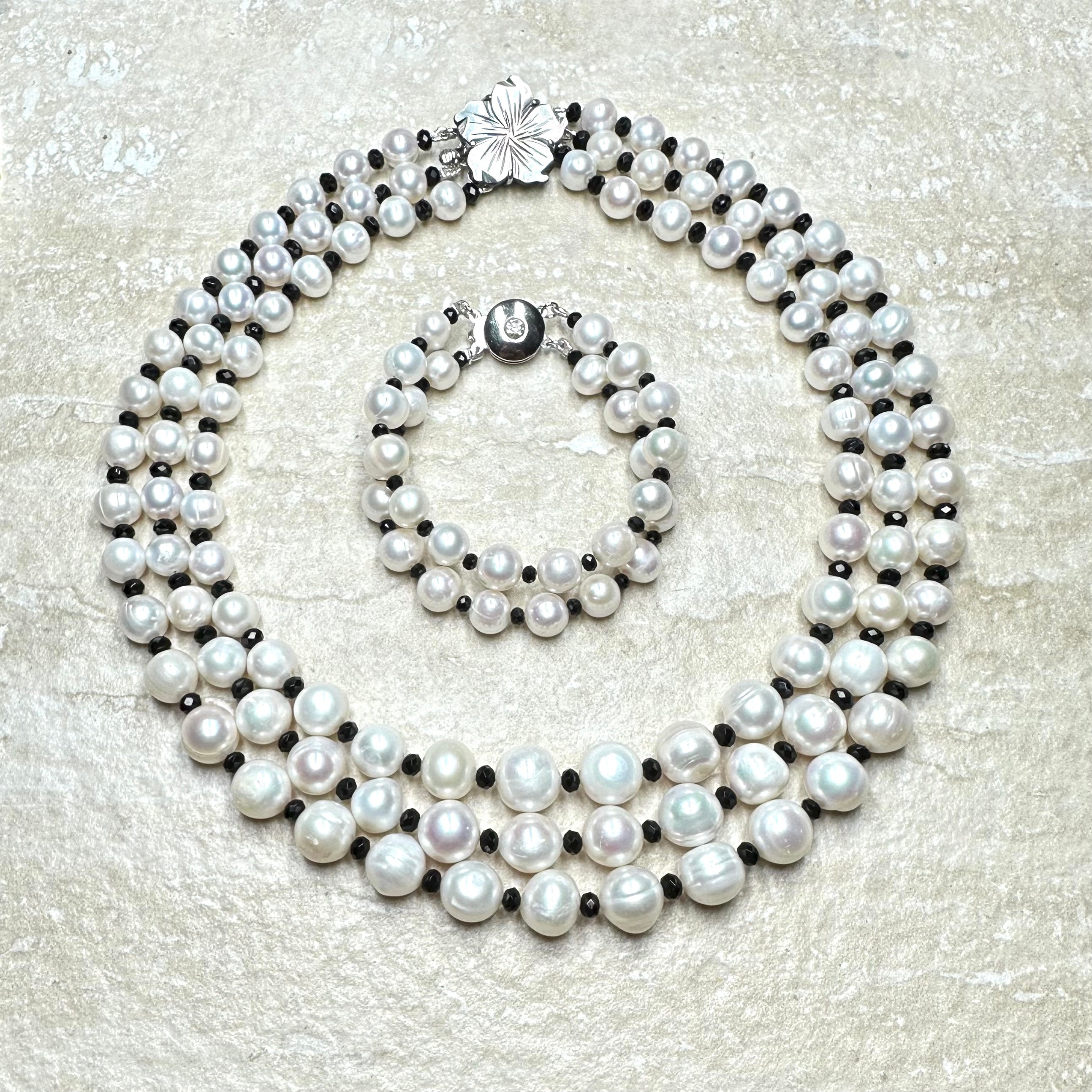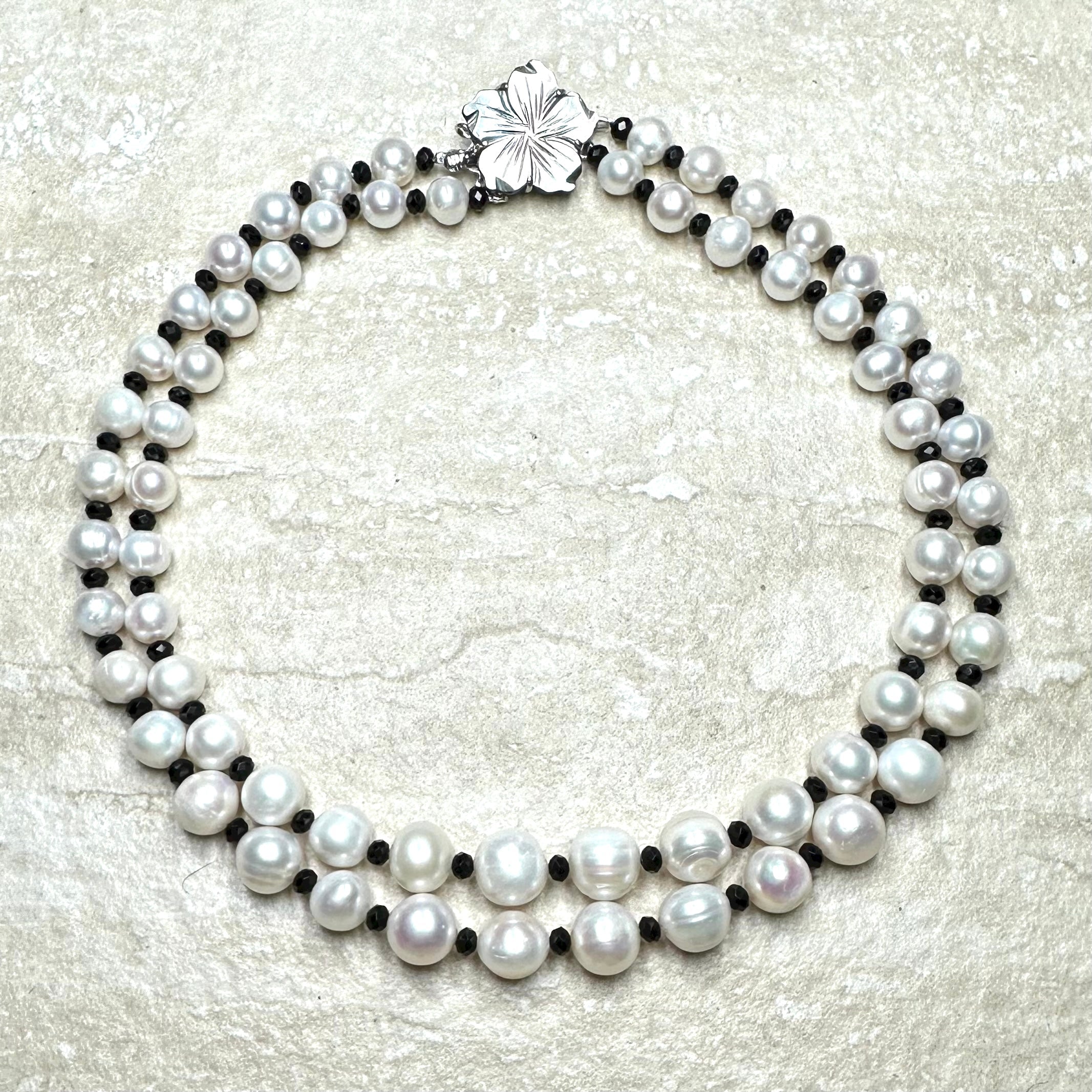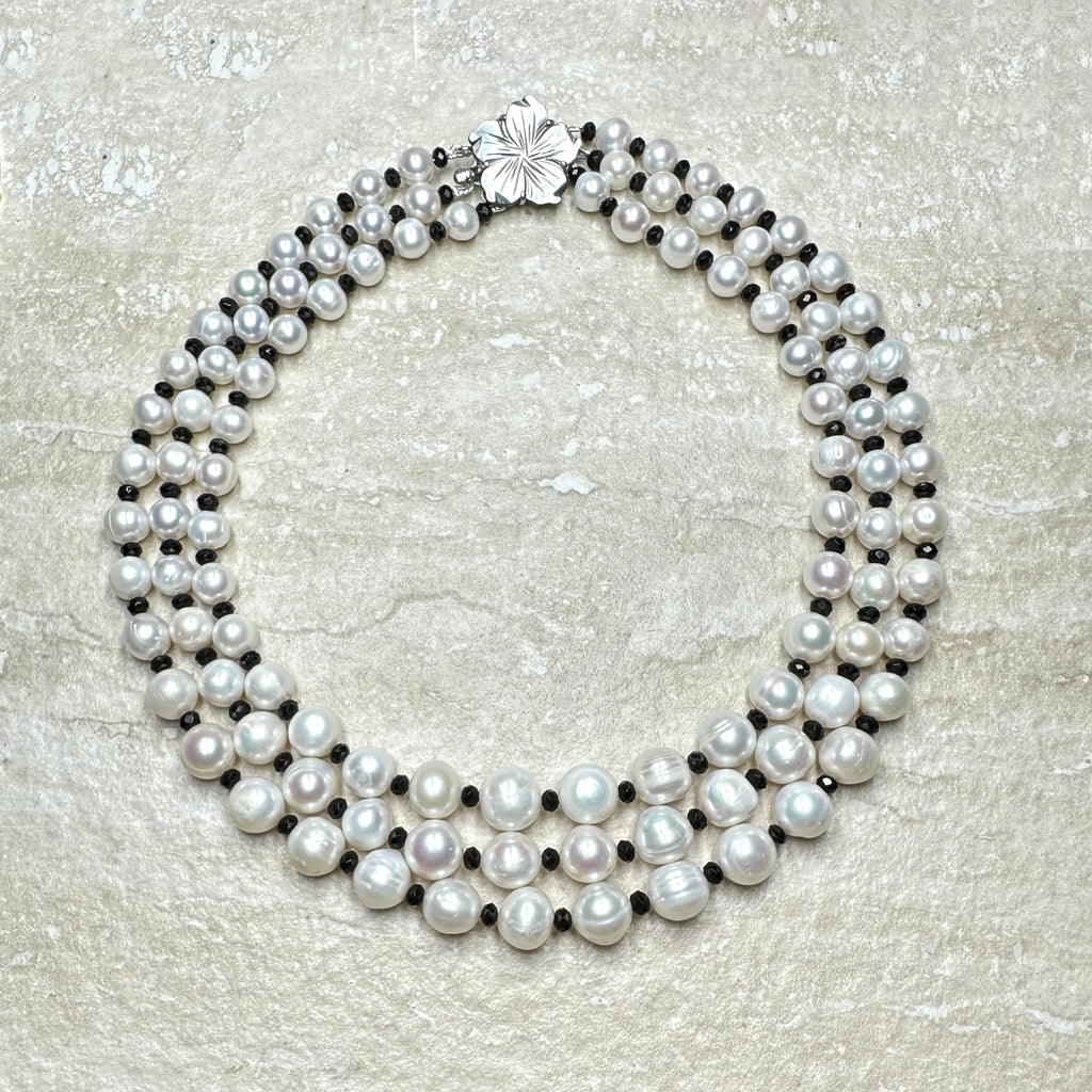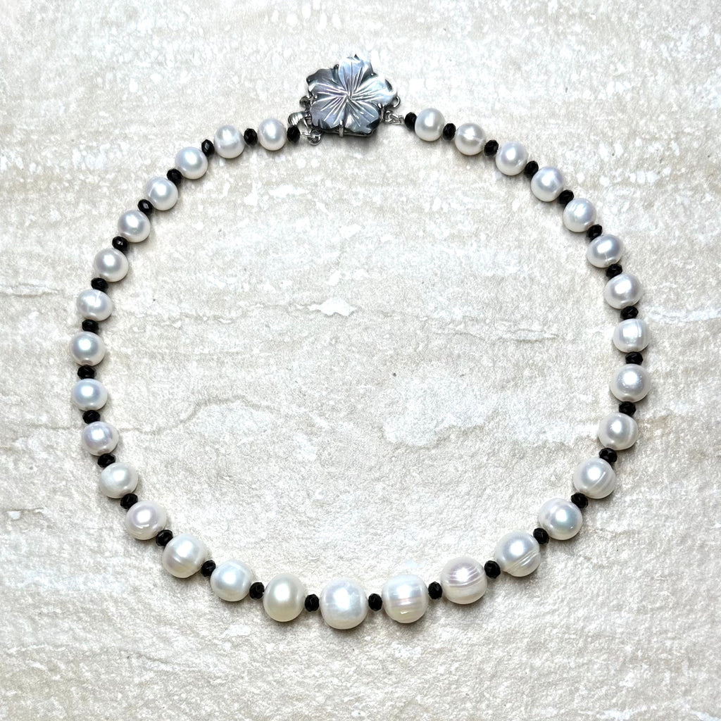 This stunning necklace is a classic and is perfect with a smart suit or a chic, glittering evening dress. These beautiful real pearls graduate from 10 - 12 mm in diameter and are separated by 4mm faceted black spinels.